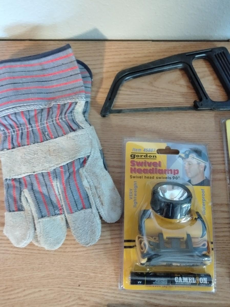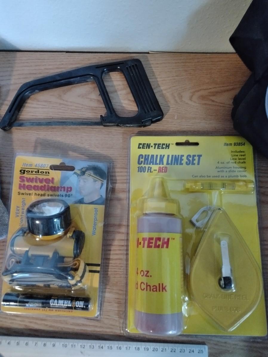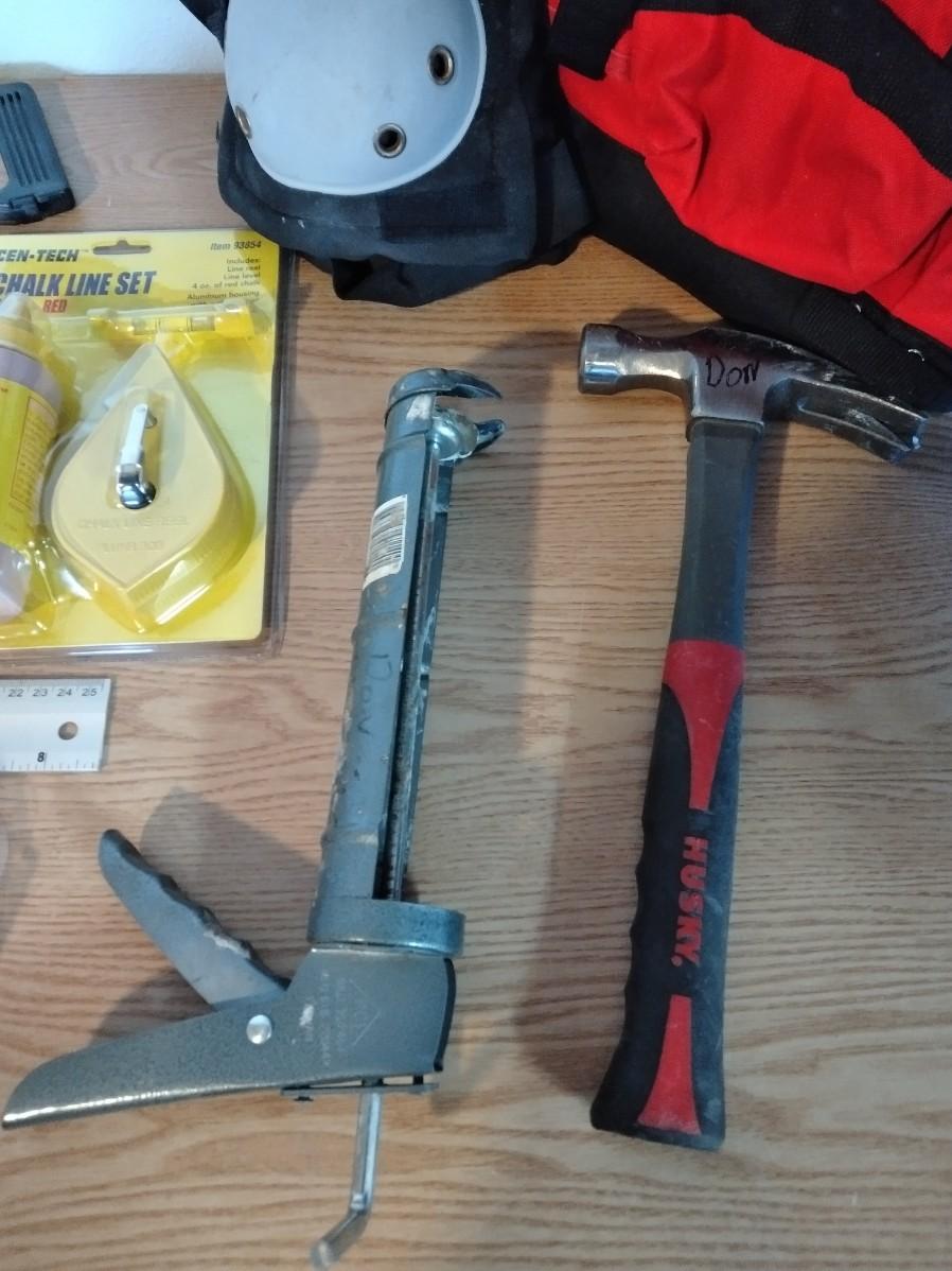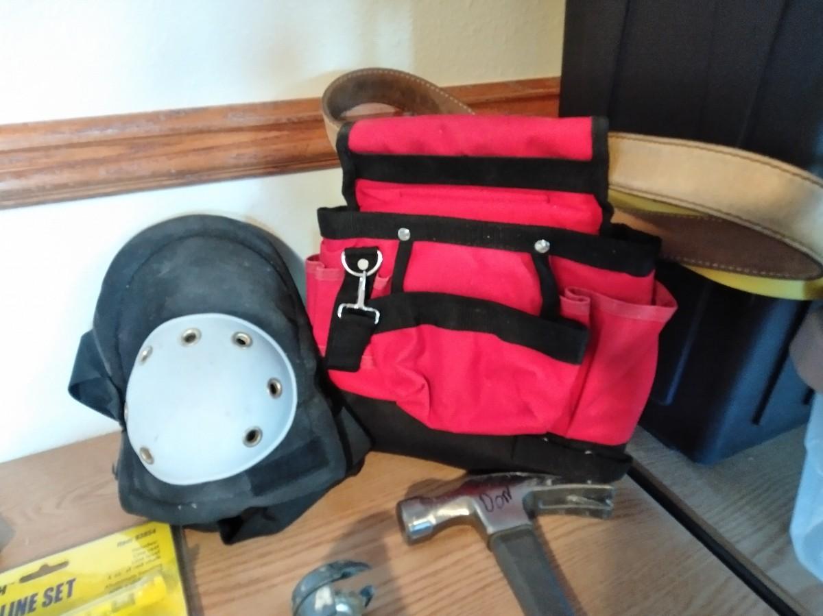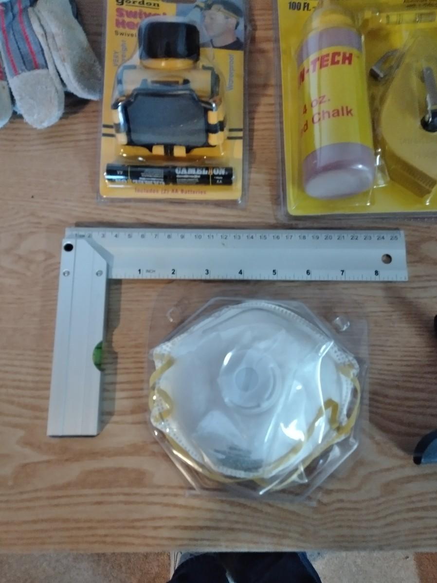 TOOL BELT POUCH, KNEE PADS, NEW CHALK LINE SET, GLOVES, LED HEADLAMP, HAMMER, CALKING GUN, MASKS, T-RULER, AND MINI HAND SAW.