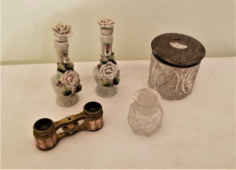You get everything you see here - nice small set of opera glasses, hair receiver with sterling silver lid, two vintage perfurne bottles with glass stoppers, small glass scent bottle - 5 pieces. Perfume bottles (marked Germany) are 4.5" tall. Hair receiver is 3" tall. Opera glasses should be considered decorative only.