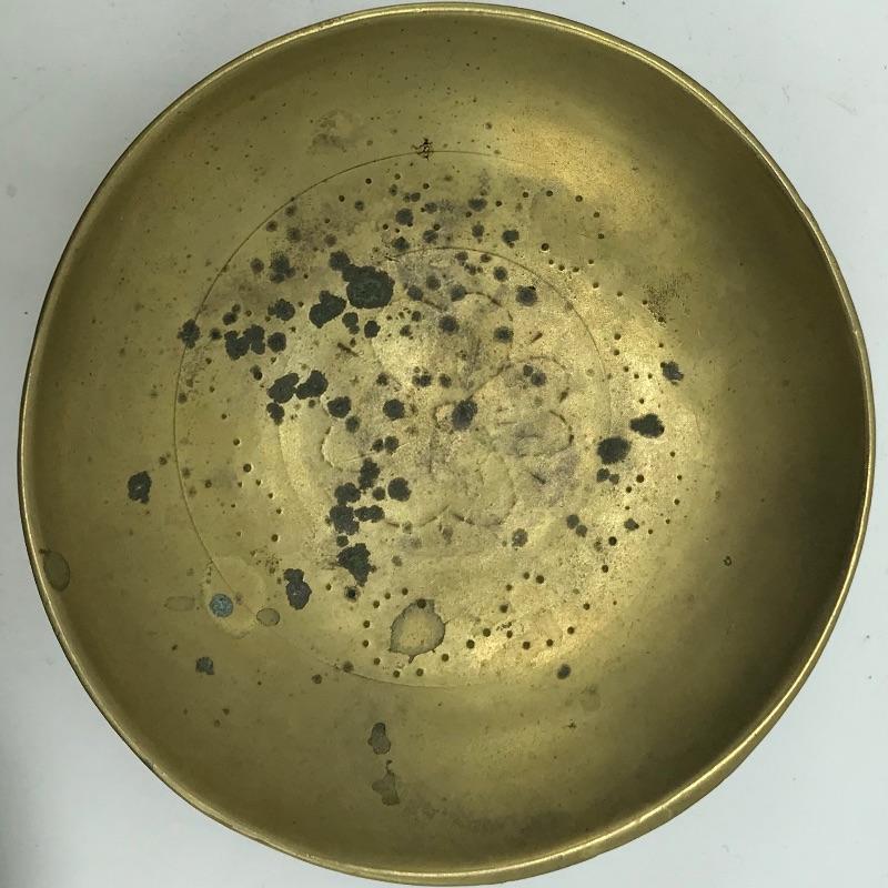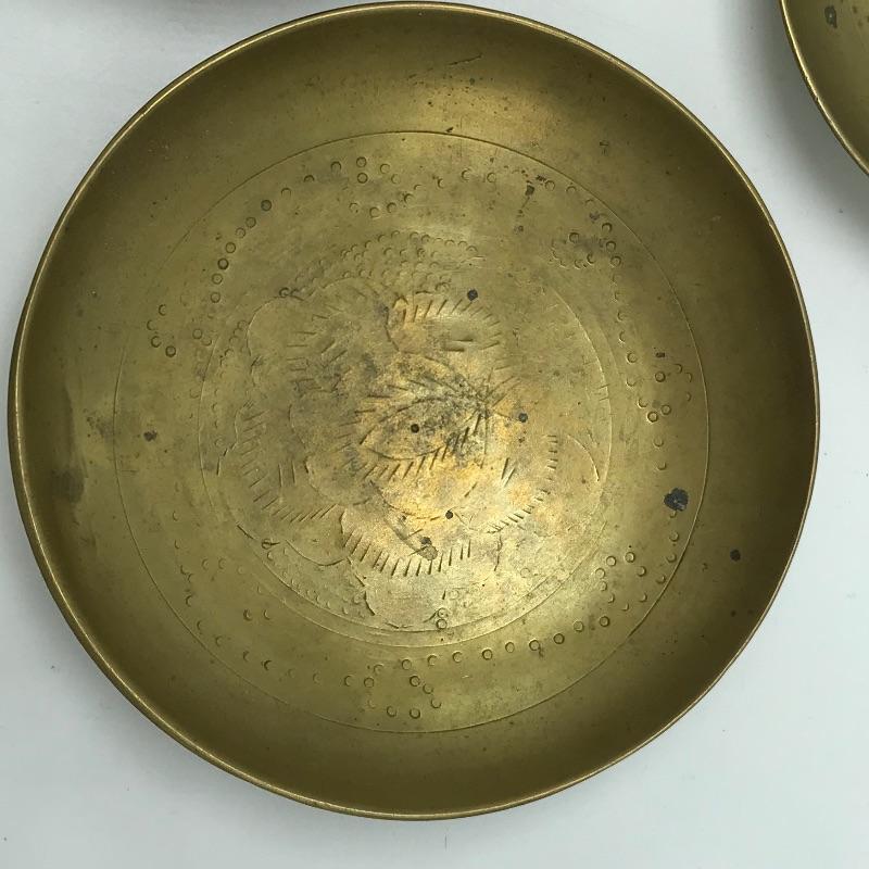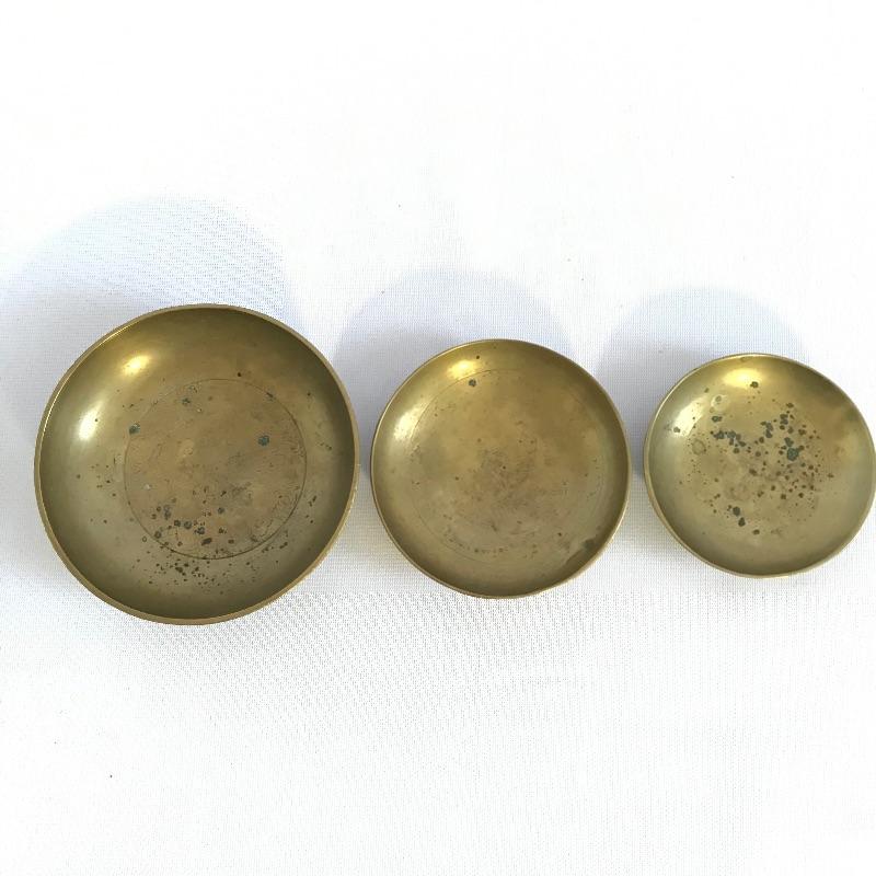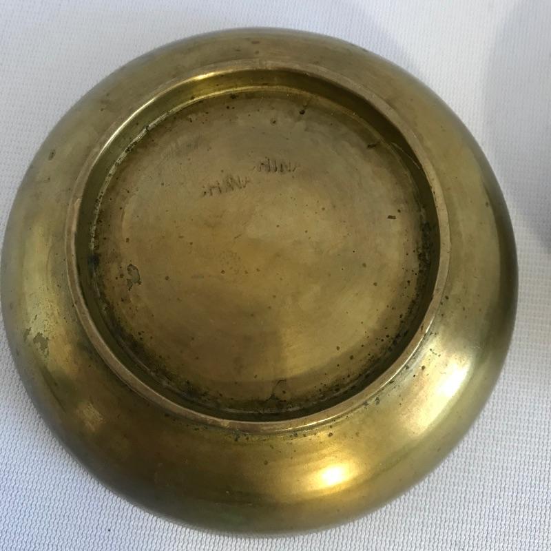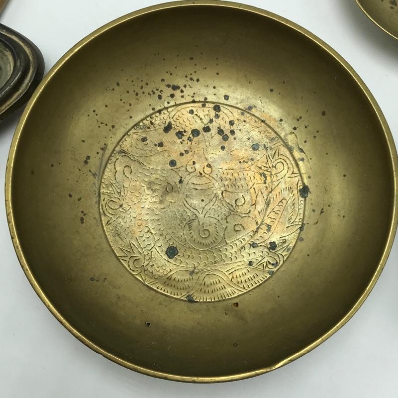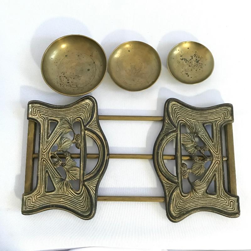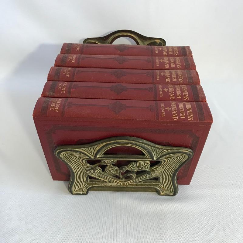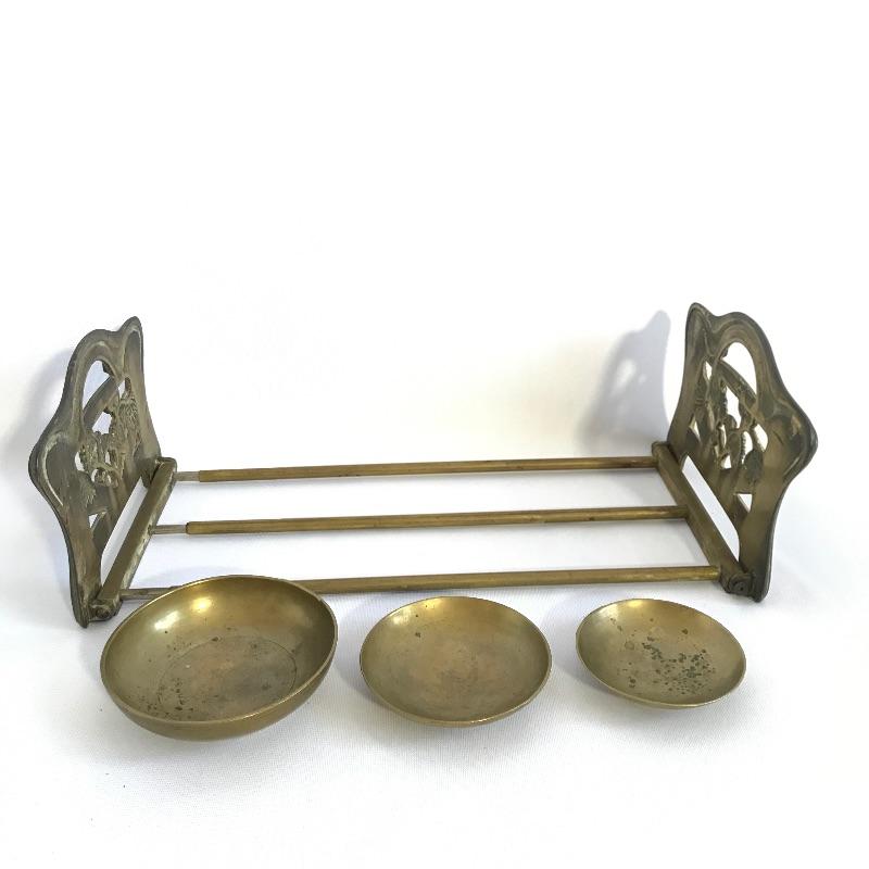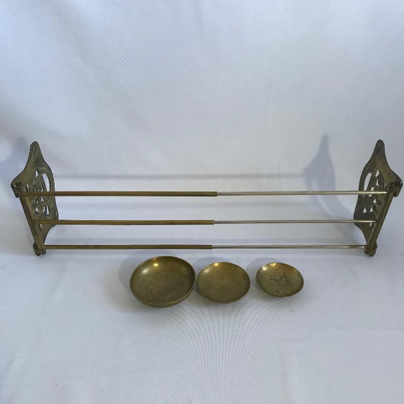 Awesome vintage metal bookrack To add elegance to your book collection. This rack measures approximately 7.5”width and length expands from 13.75” to 24”. We’ve paired up three brass colored bowls that range from 3” to 4.25”. The larger bowl has an intricate dragon style design while the smaller bowls have delicate flowers. See photos. Books are not included but can be found in lot 37.