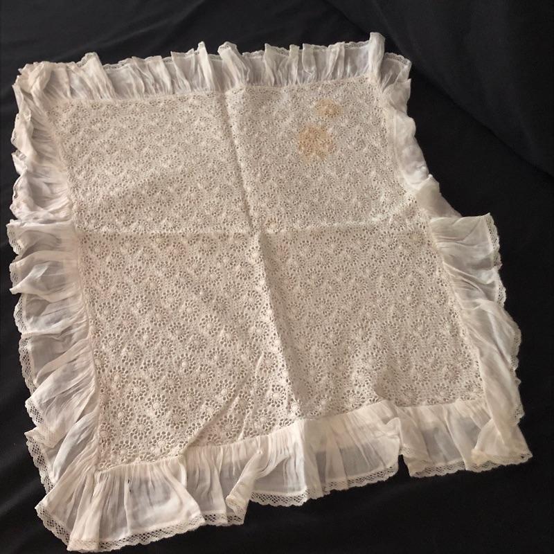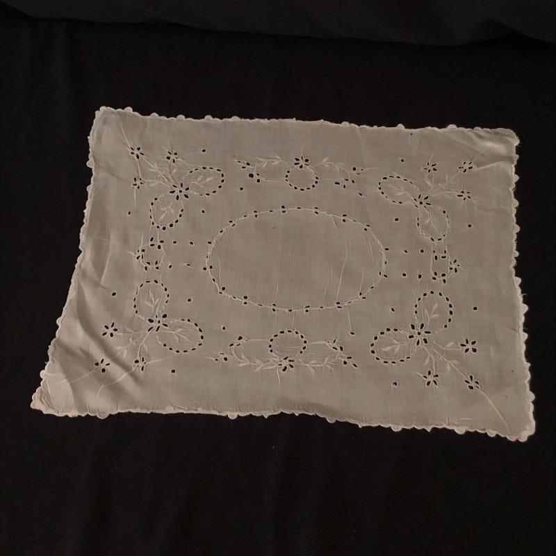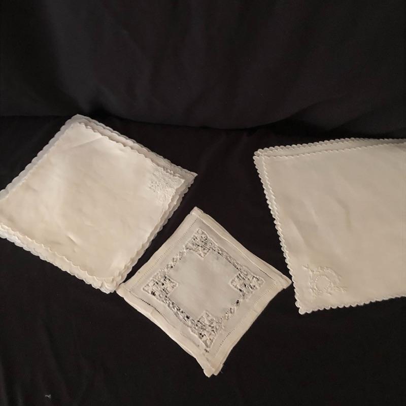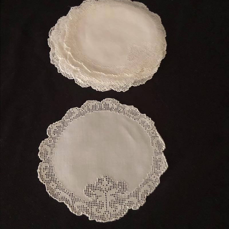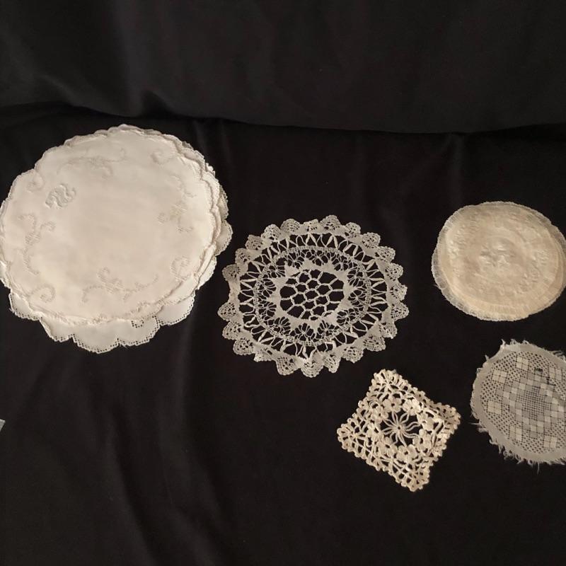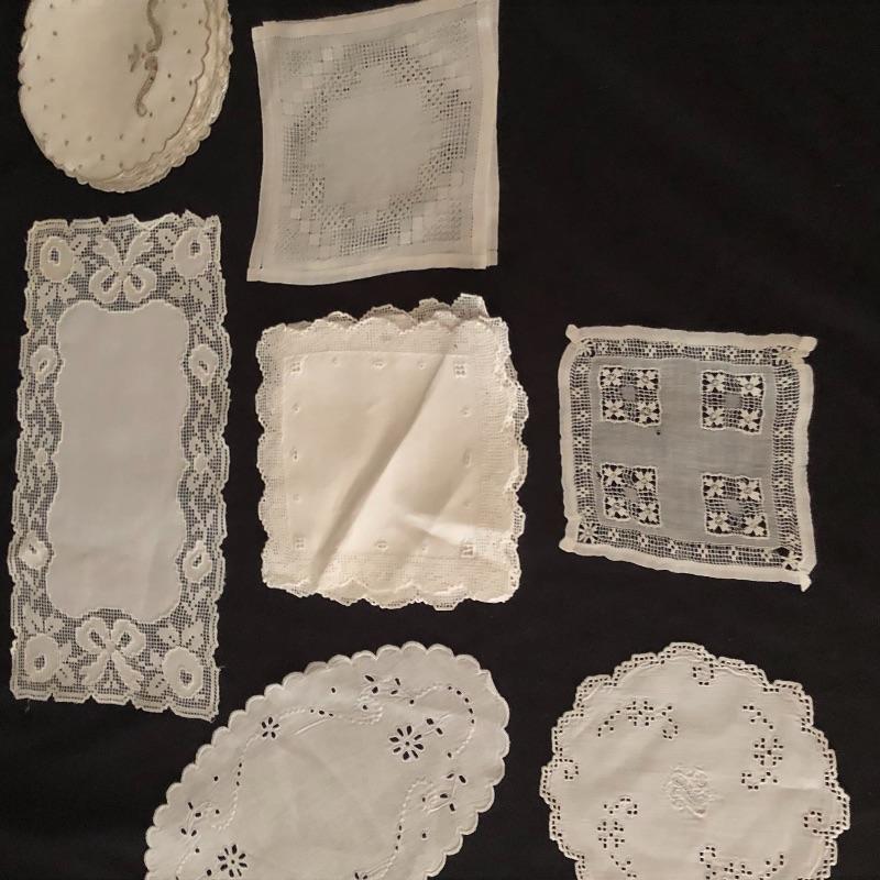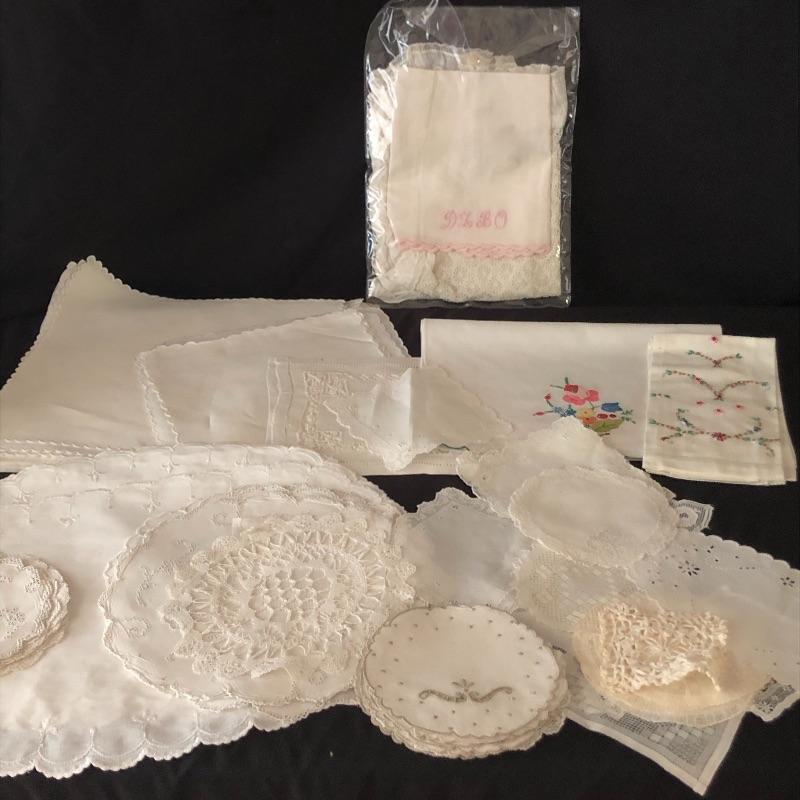 This adorable lot of vintage linens includes doilies, napkins and a beautiful lace pillowcase.; pillowcase does have a stain that is shown in images.