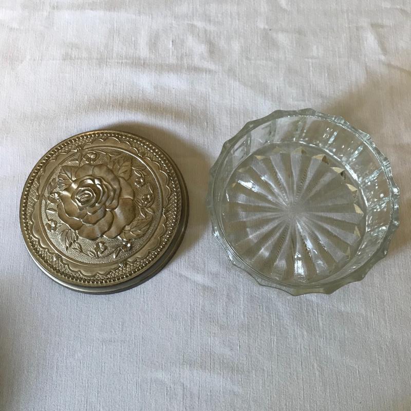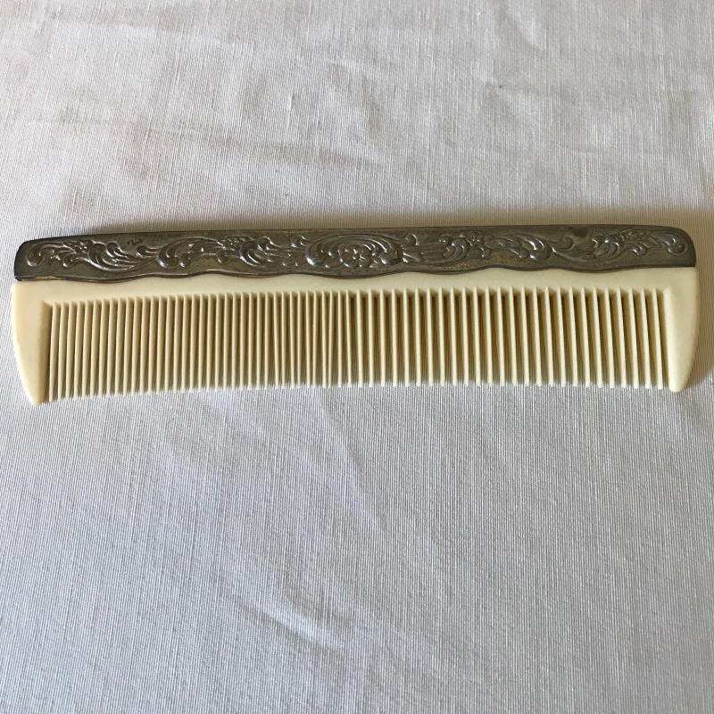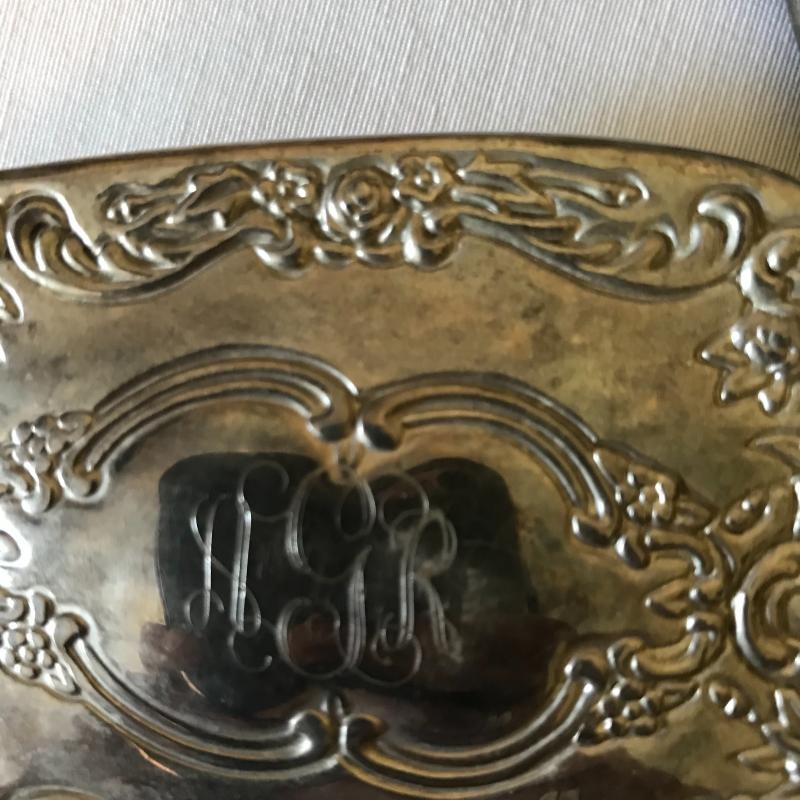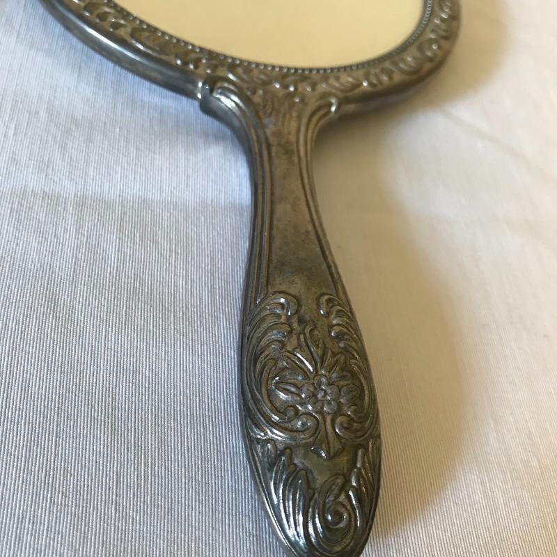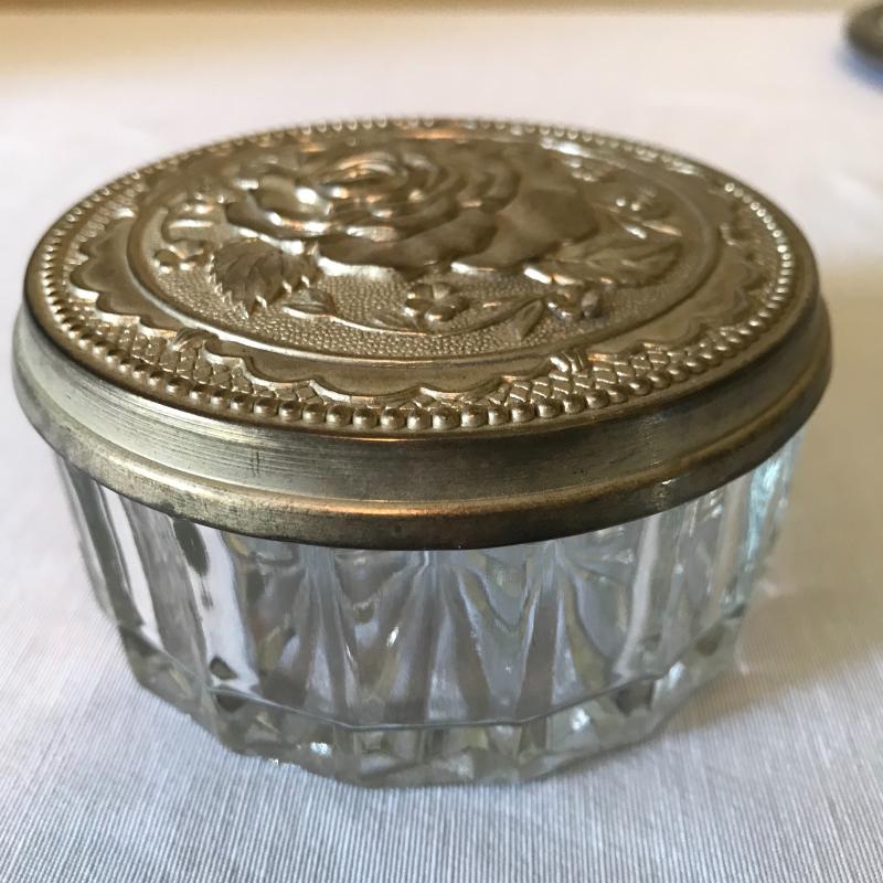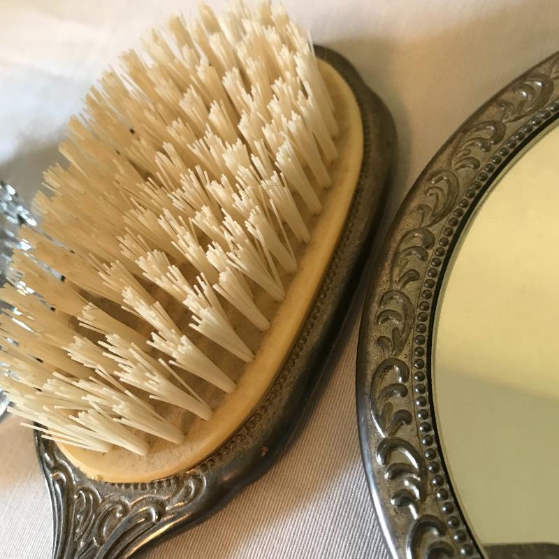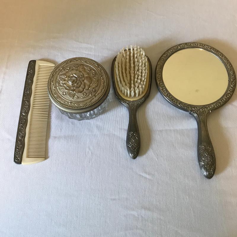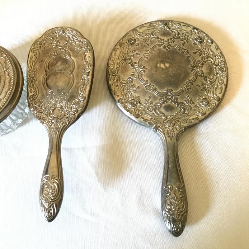 Lovely matching silver brush, comb, and mirror trio with the brush and mirror monogrammed, see photos. Accessories are accompanied by a crystal and silver rose powder box. Shipping available.