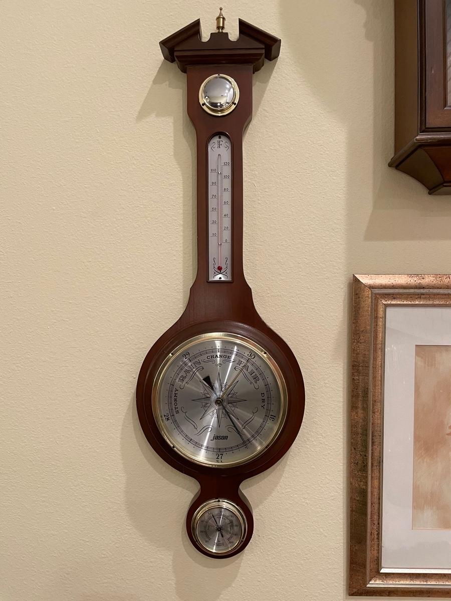Regulator replica clock, barometer, pair of framed prints and set of 5 decorative tiles