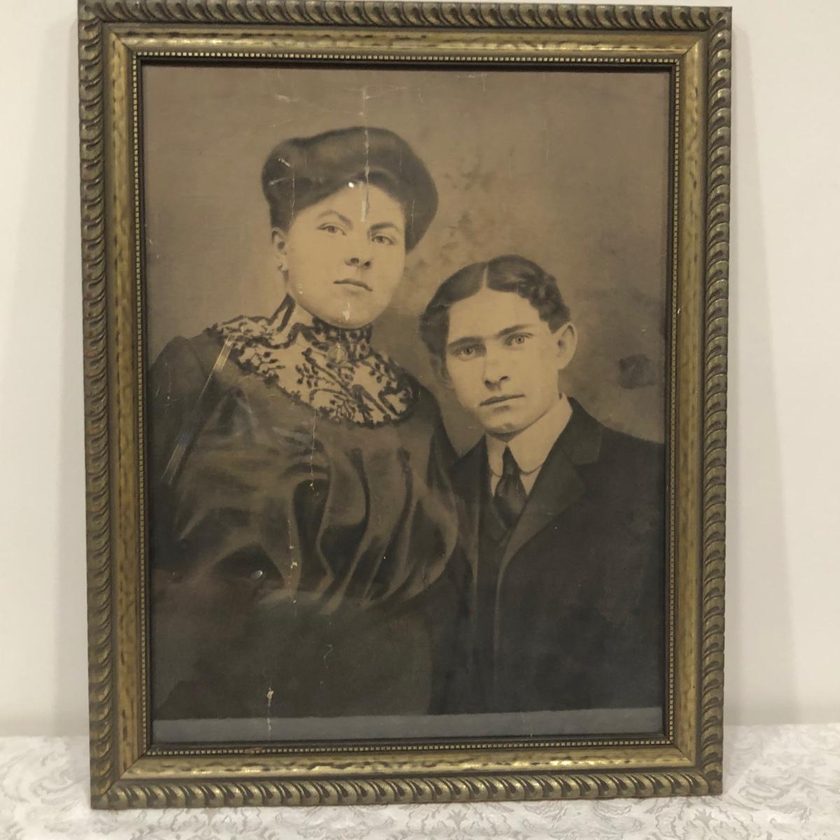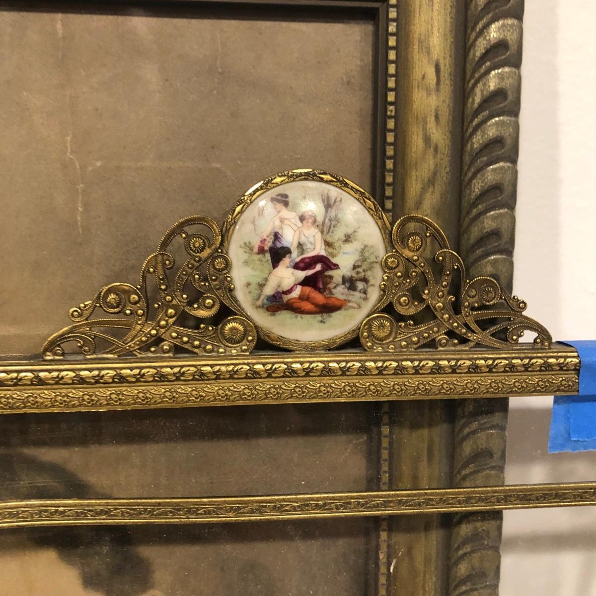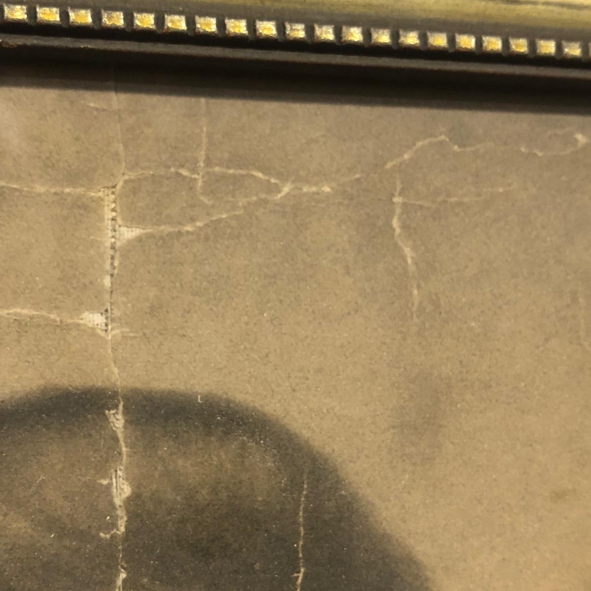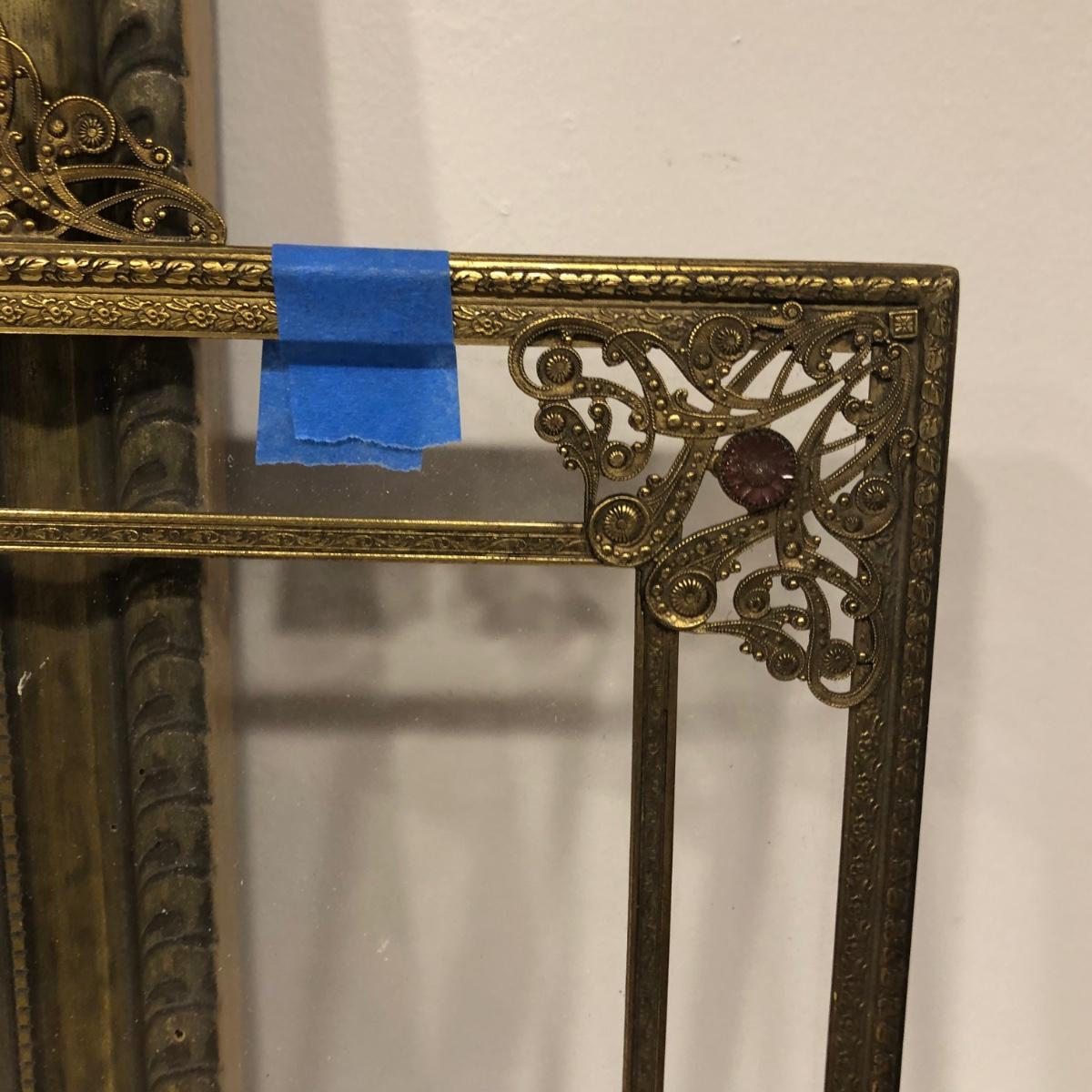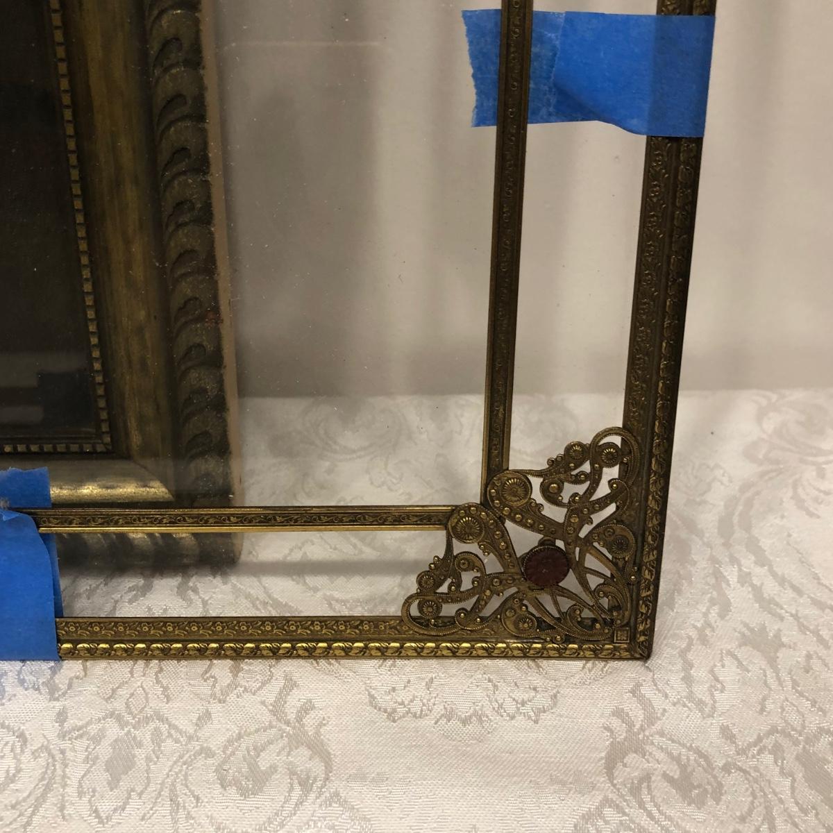 Mirror has condition issues due to age and measures 13 x 18 inches. Photo measures 17 x 21 inches.