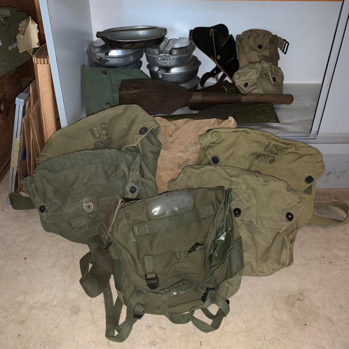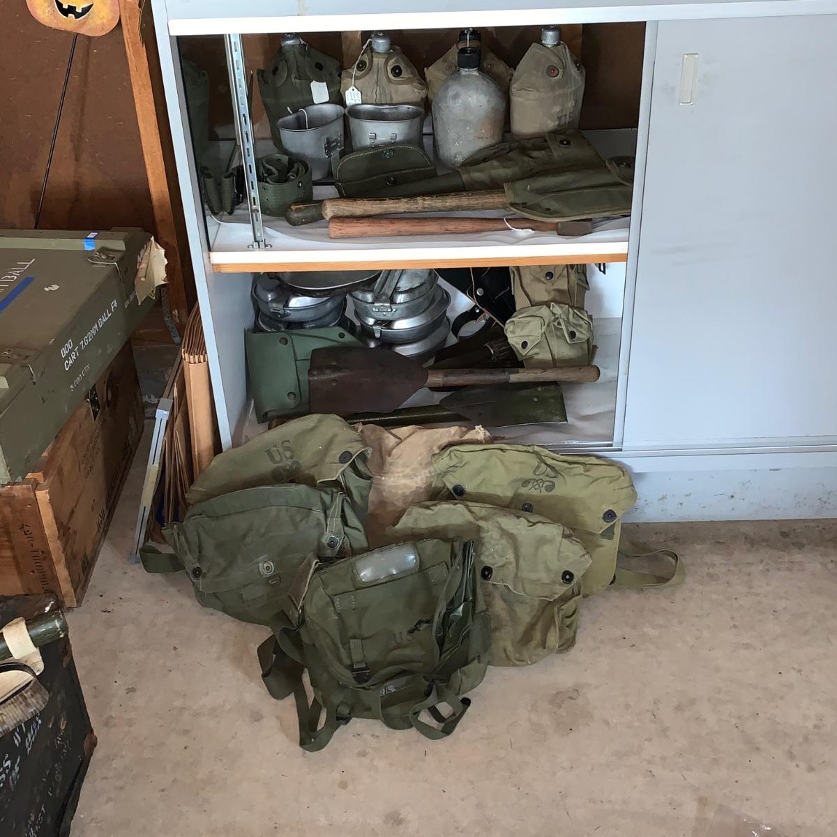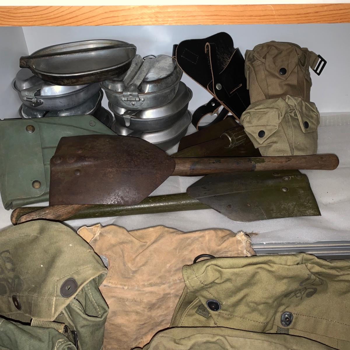 Lot 167R: Vintage Military Mess Kits, Shovels, Canteens, Bags