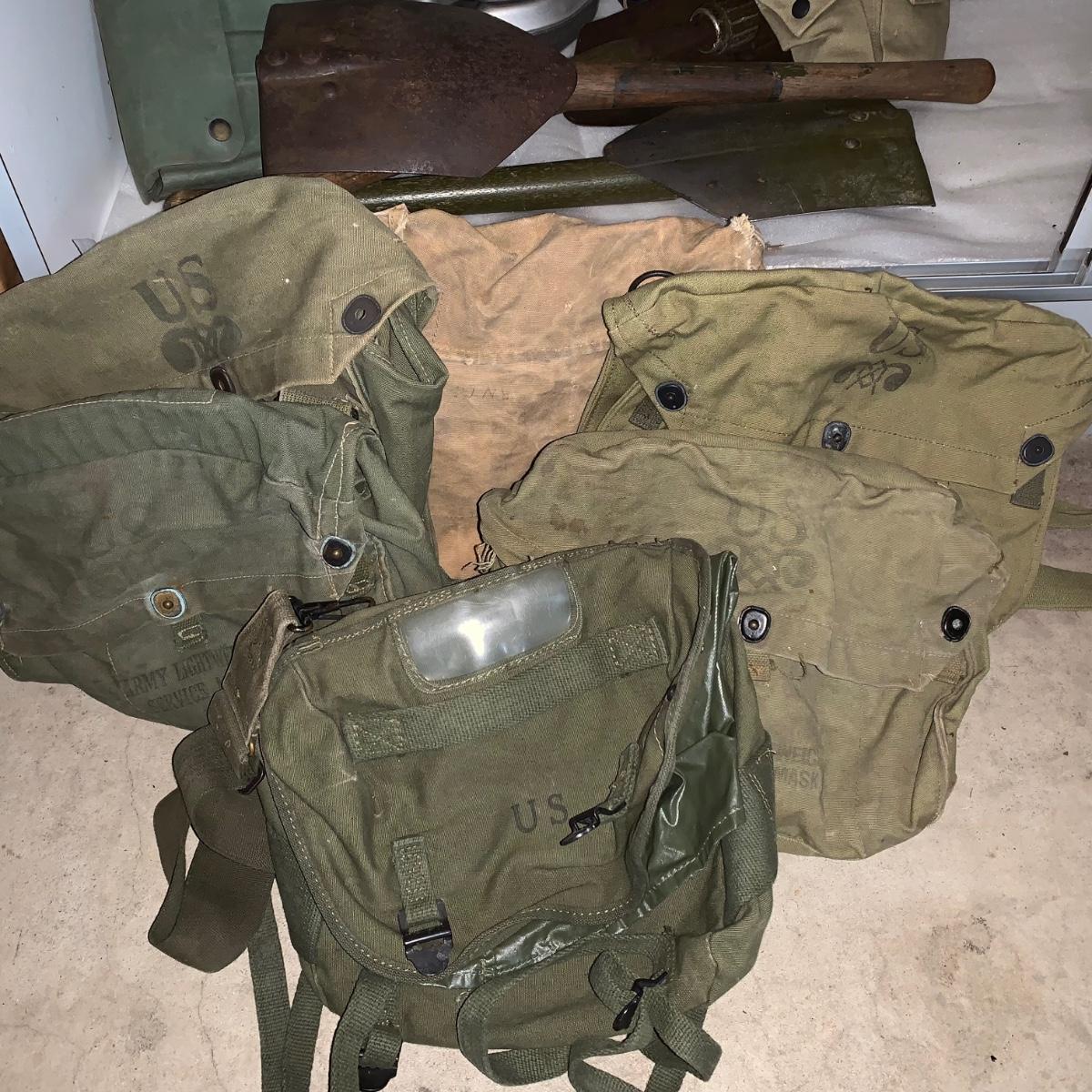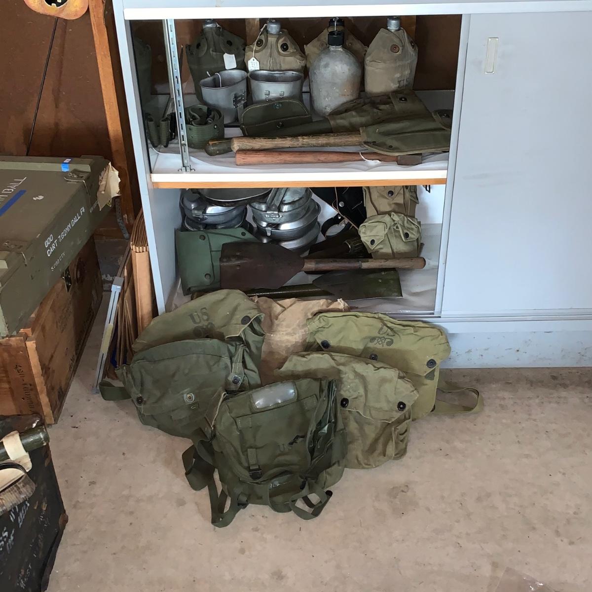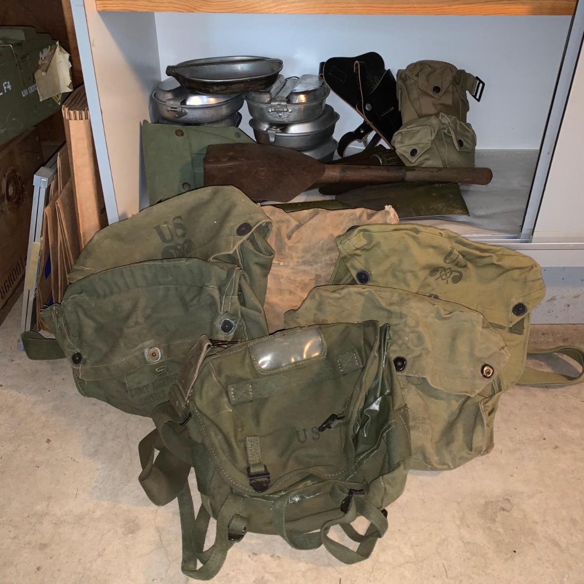 Lot 167R: Vintage Military Mess Kits, Shovels, Canteens, Bags