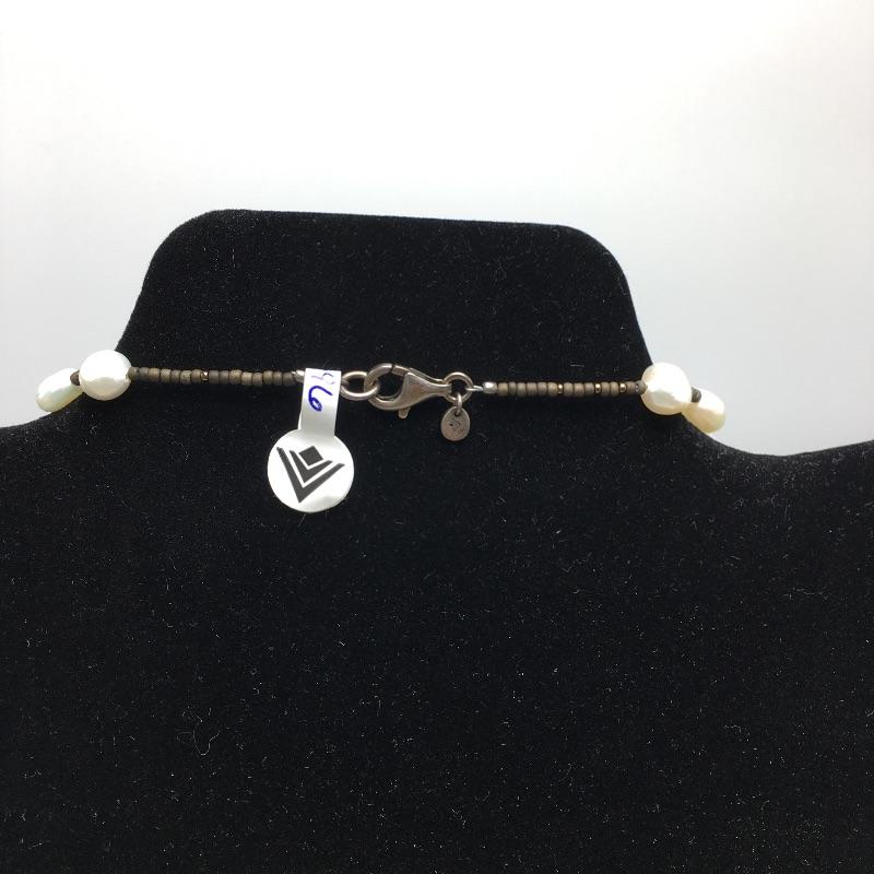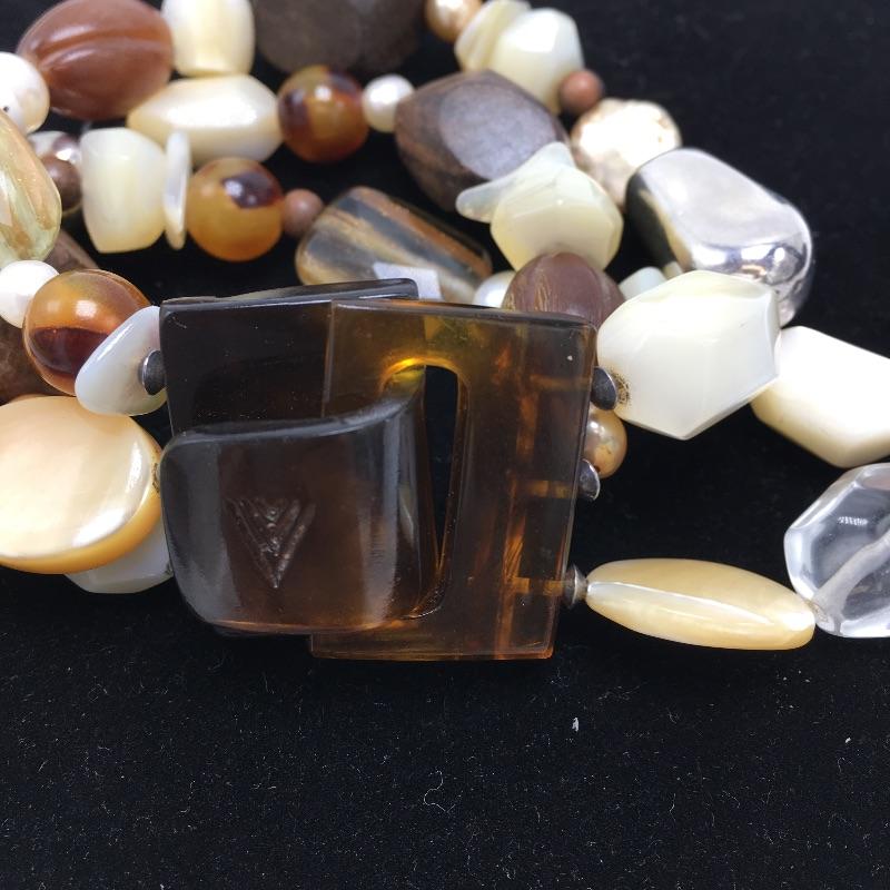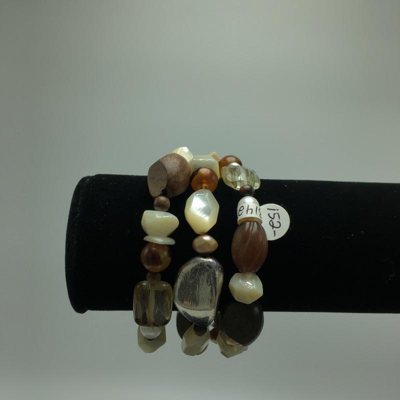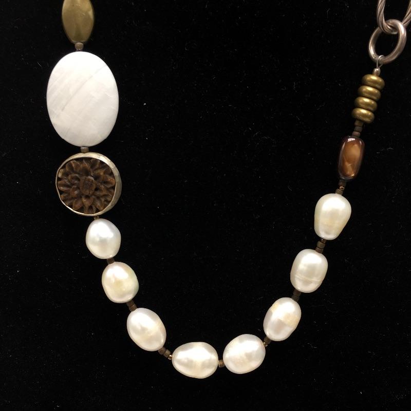 Silpada three strand bracelet in sterling silver, mother of pearl, tiger ebony wood, quartz, sunstone, brown horn bead, white and taupe freshwater pearls and silver beads a companies by a necklace in sterling silver, pearl, brown lip shell, mother of pearl, carved bone, copper and brass that measures 24” long.