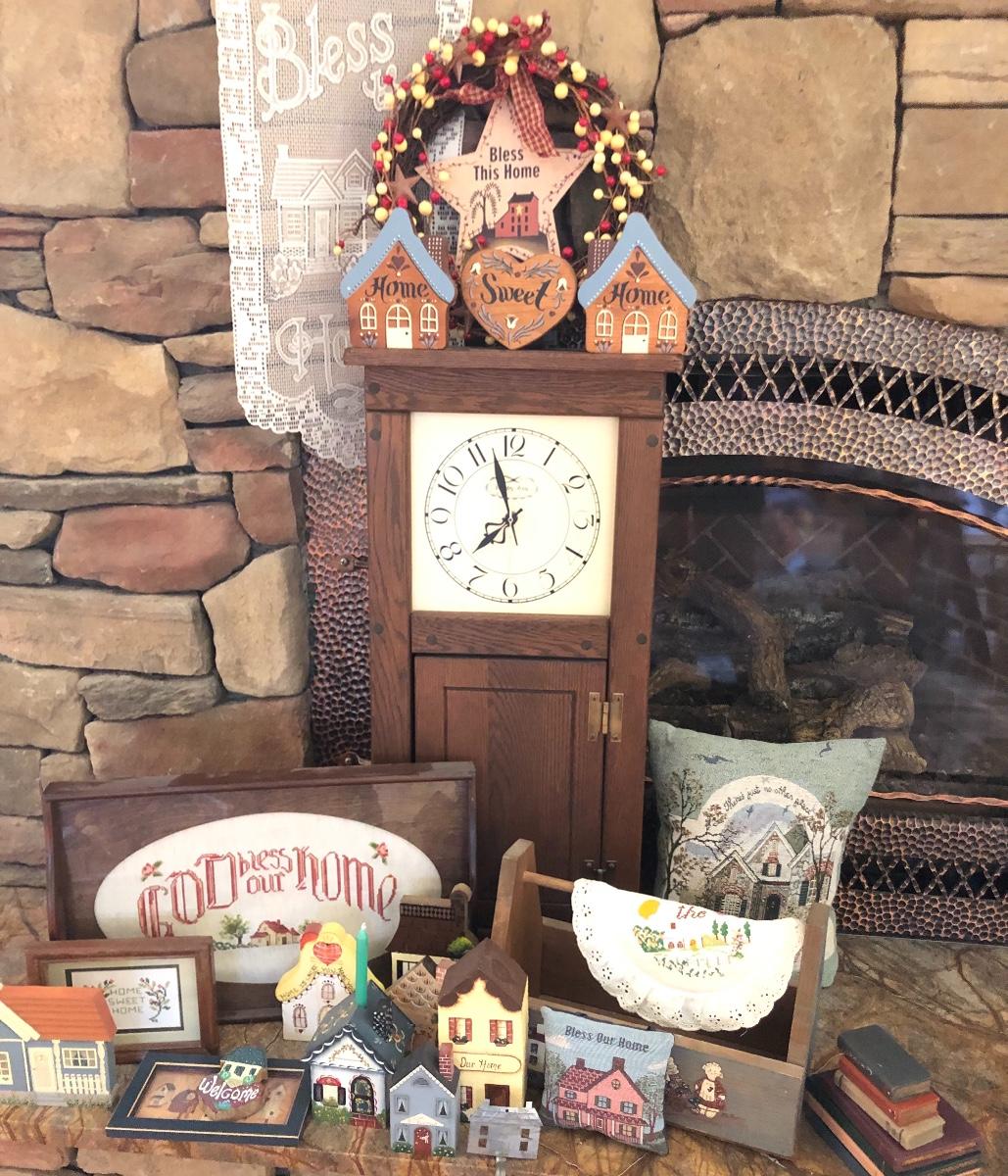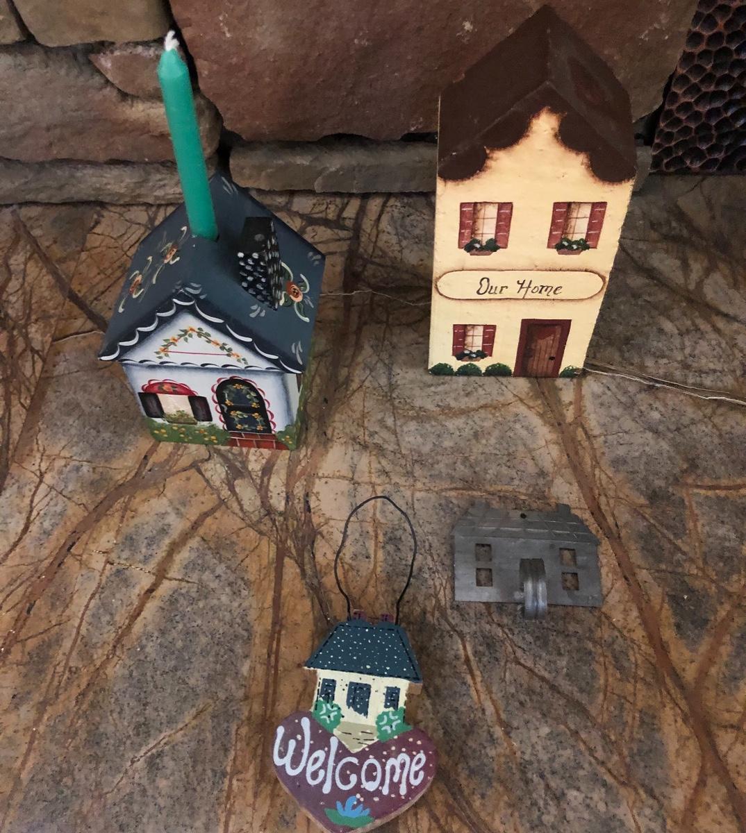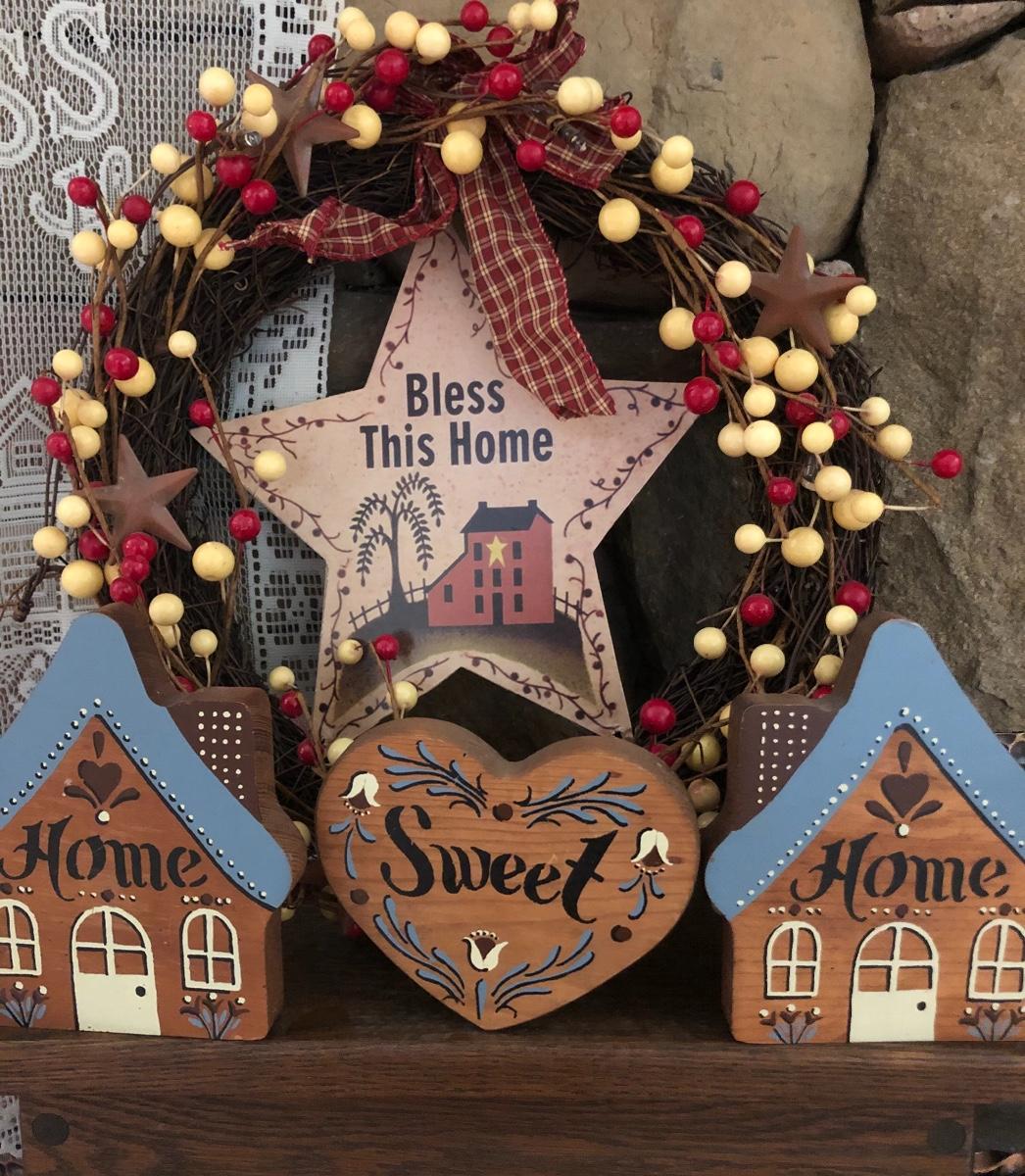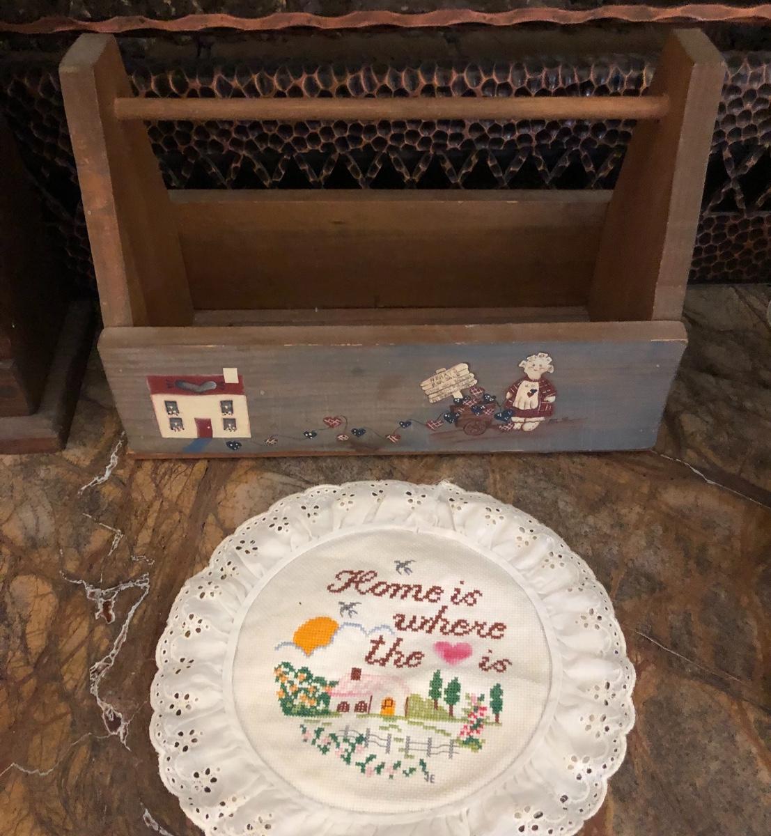 Our home is where our heart is and this assortment of decor is all about celebrating it! This lot includes a number of wood pieces that include a decorative wood painted toolbox, small houses, a tray with a cross-stitch under glass, faux stackable books, a battery operated clock which works and more. Also included is an attractive small wreath, lace hanging piece, lace and cross-stitch doily, small pillow, larger weighted pillow and more. The last image shows a wooden spoon added to this lot that is not in the image showing everything.