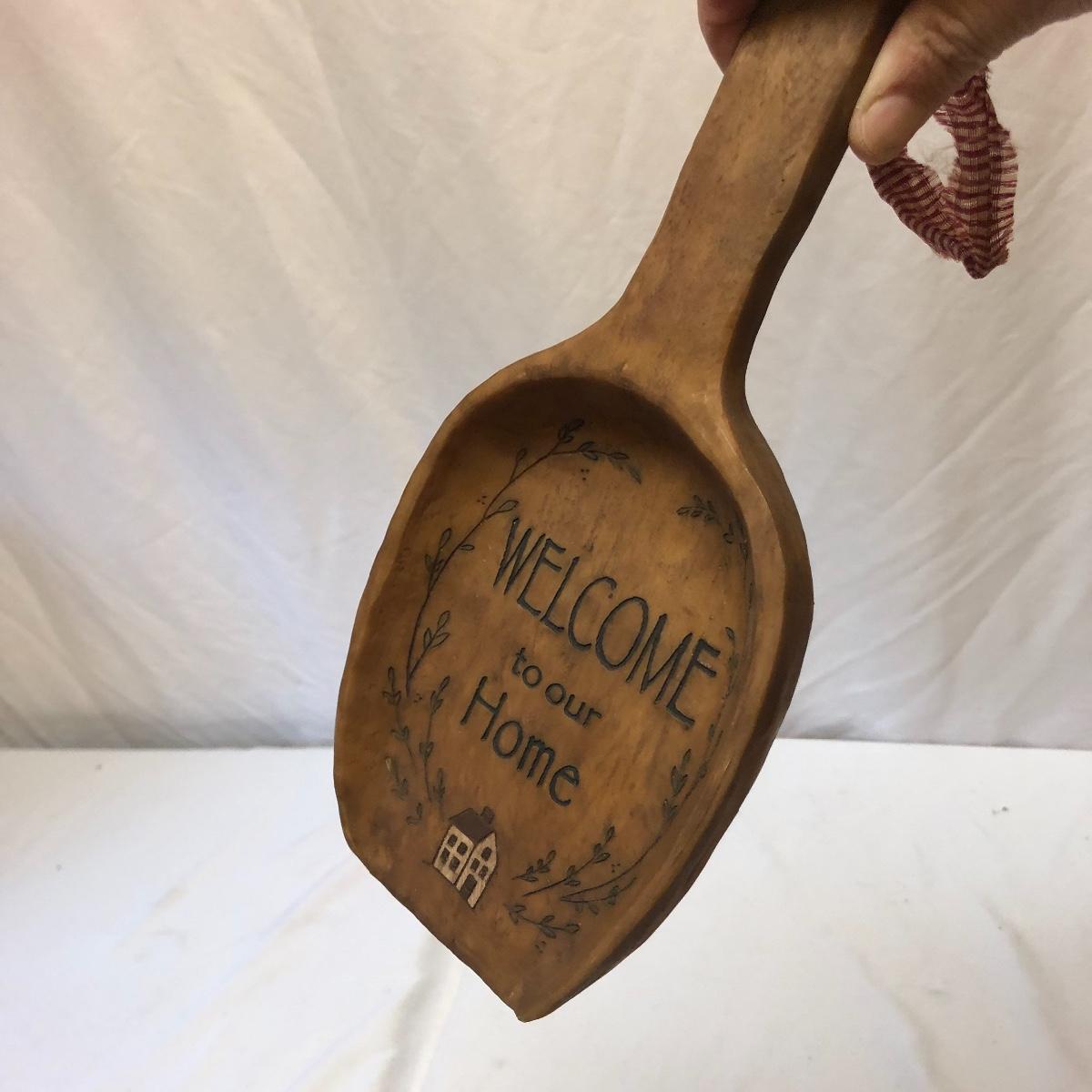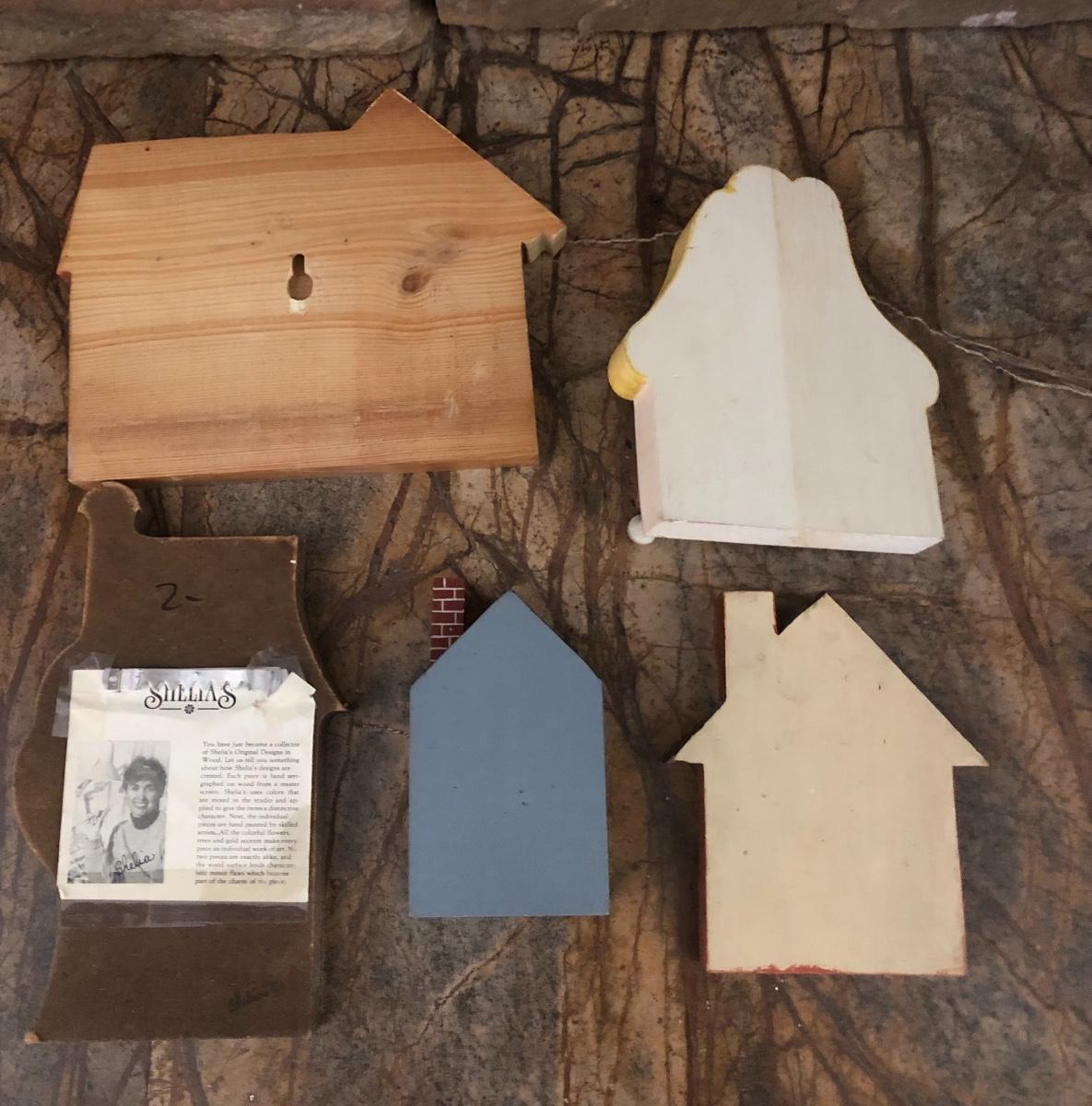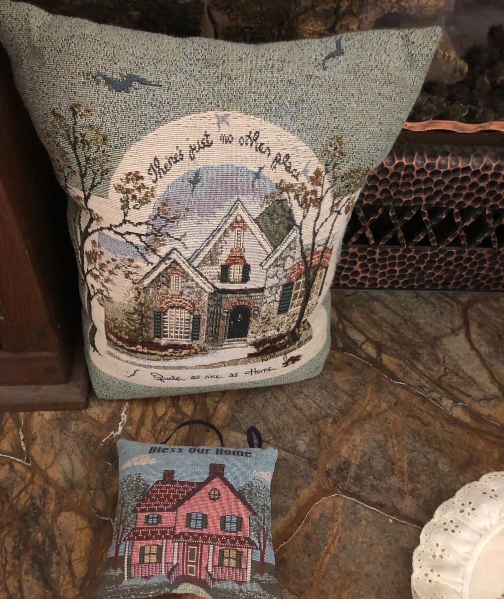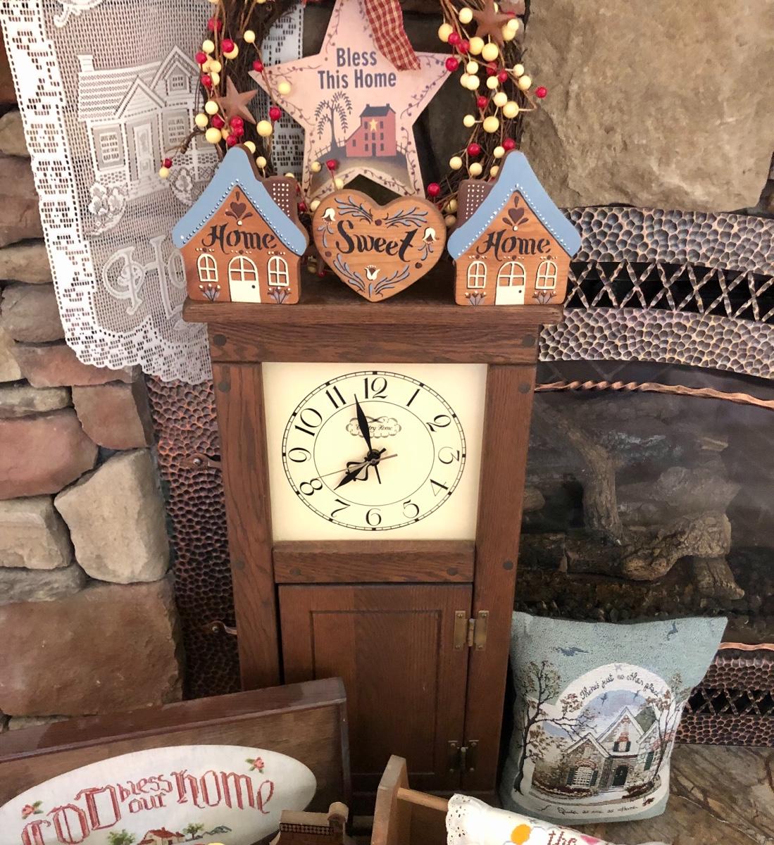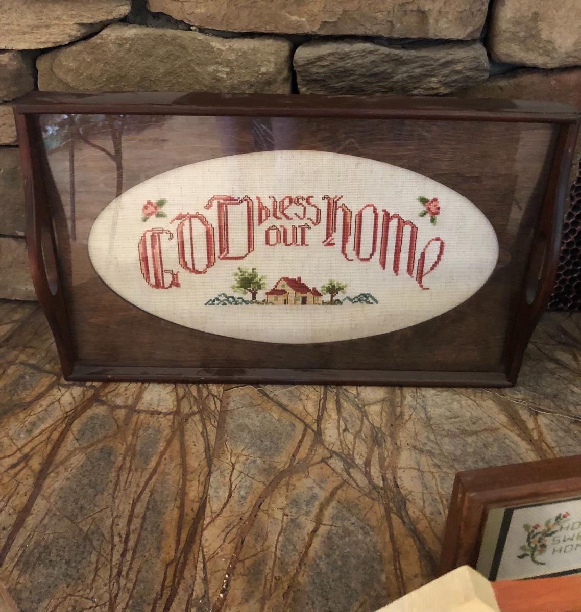 Our home is where our heart is and this assortment of decor is all about celebrating it! This lot includes a number of wood pieces that include a decorative wood painted toolbox, small houses, a tray with a cross-stitch under glass, faux stackable books, a battery operated clock which works and more. Also included is an attractive small wreath, lace hanging piece, lace and cross-stitch doily, small pillow, larger weighted pillow and more. The last image shows a wooden spoon added to this lot that is not in the image showing everything.