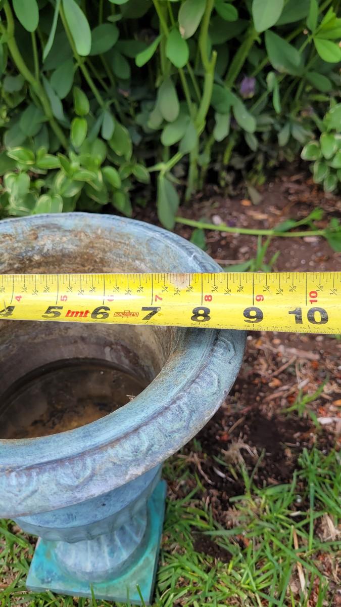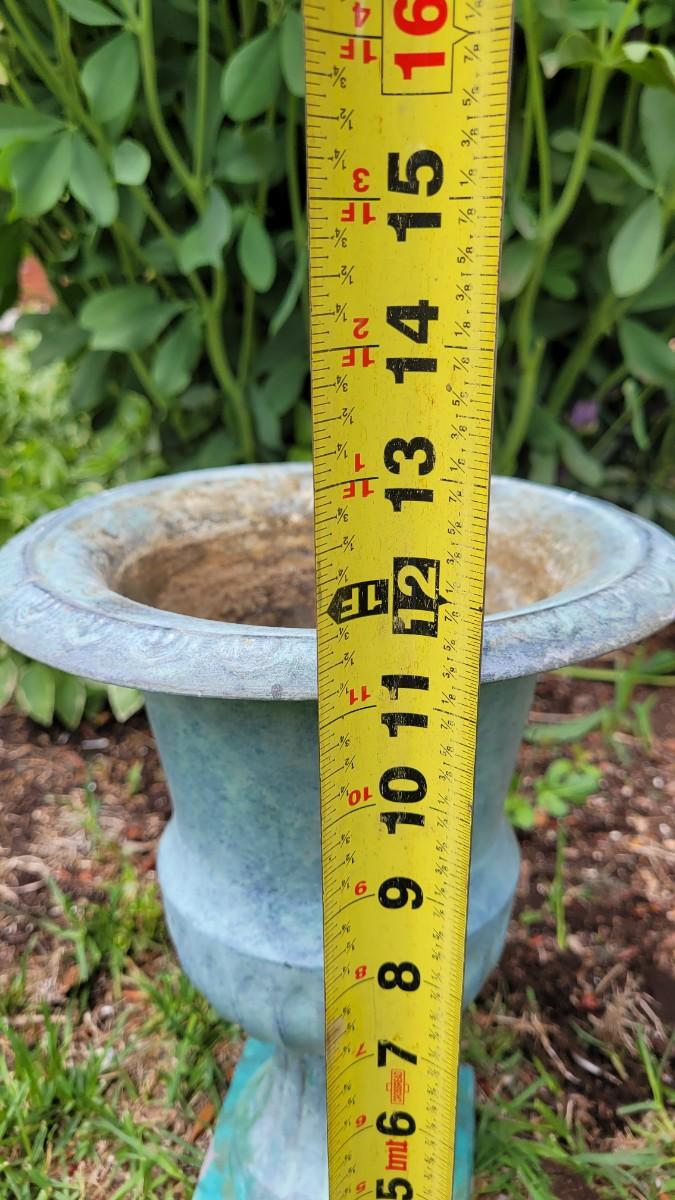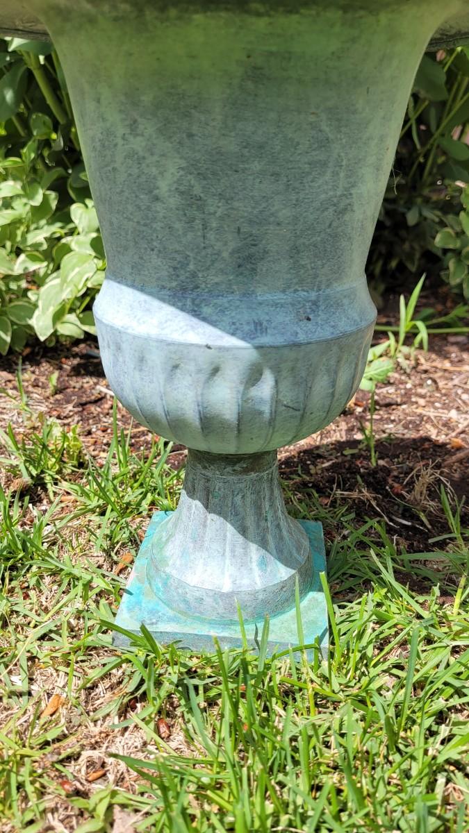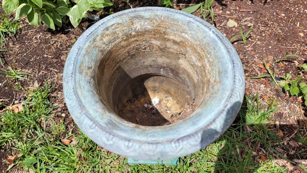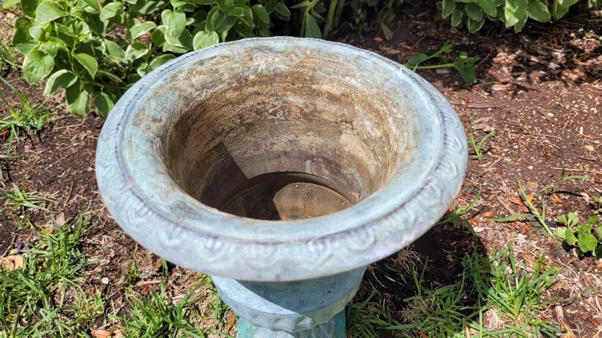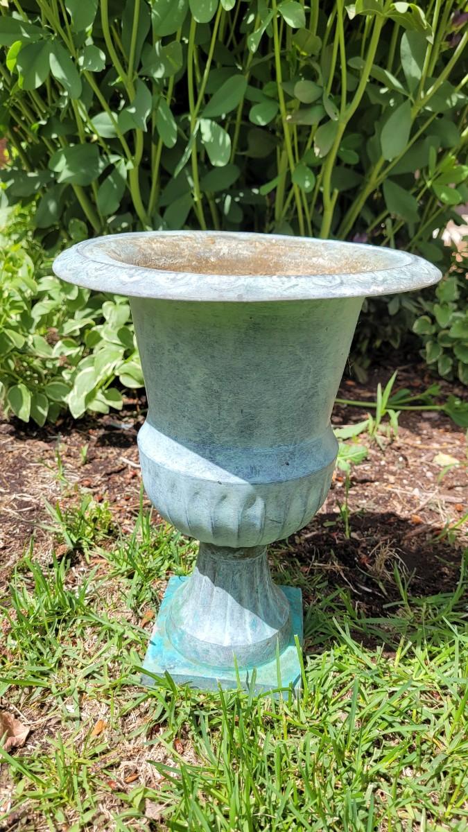Does not have a drainage hole. Thin, lighter metal Garden Urn.