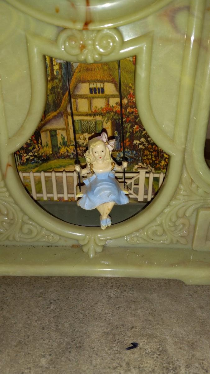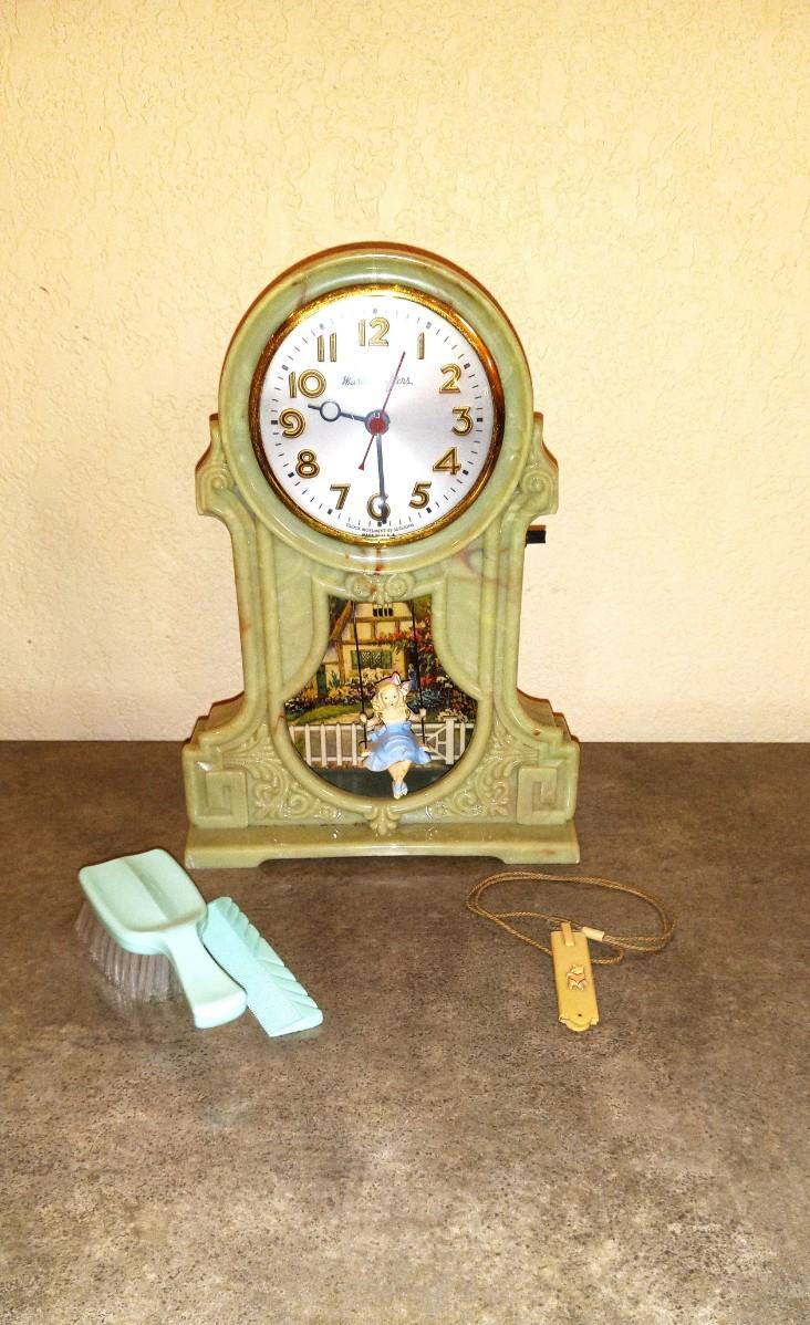 MASTER CRAFTERS CLOCK MEASURES 7.5X11 IS IN WORKING CONDITION, THE GIRL SWINGS ON THE SWING AND COMB & BRUSH SET
