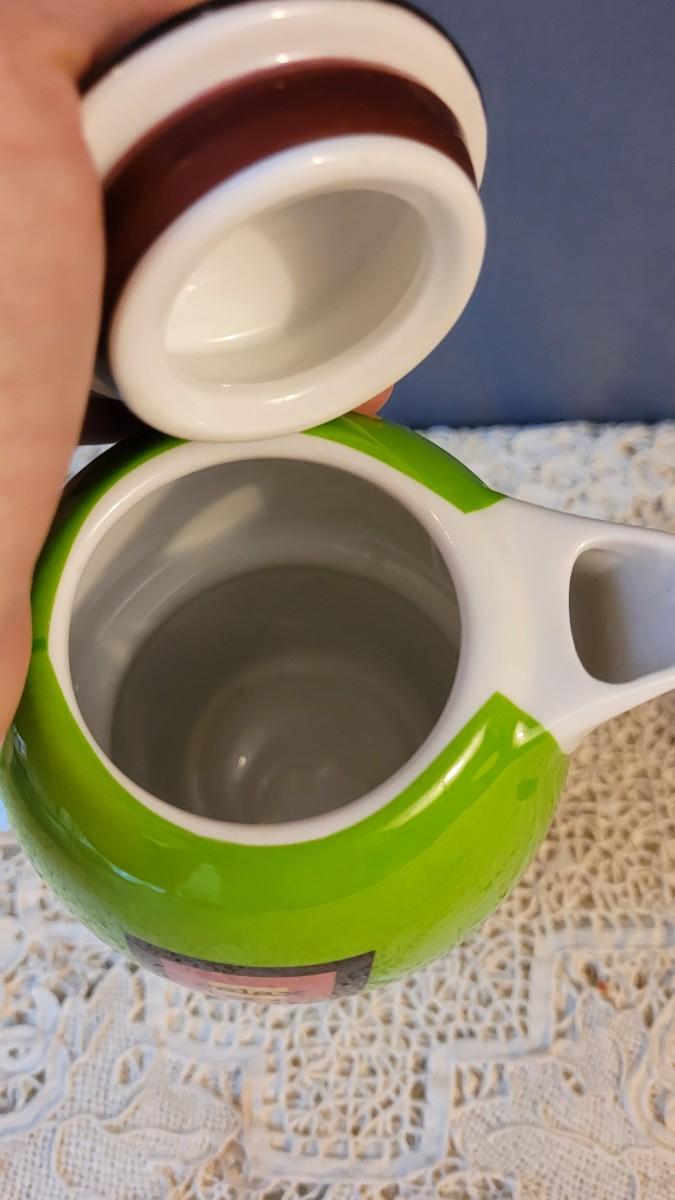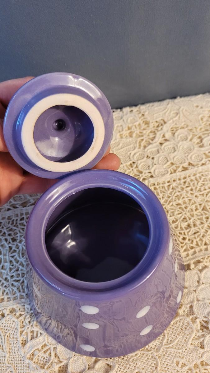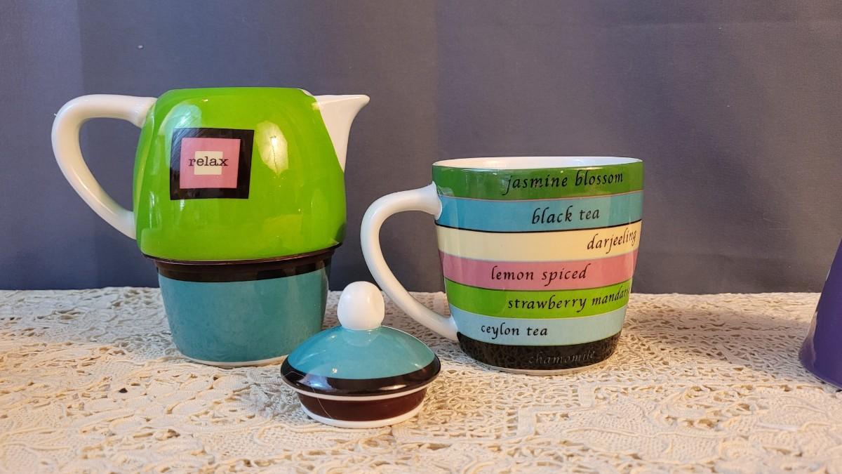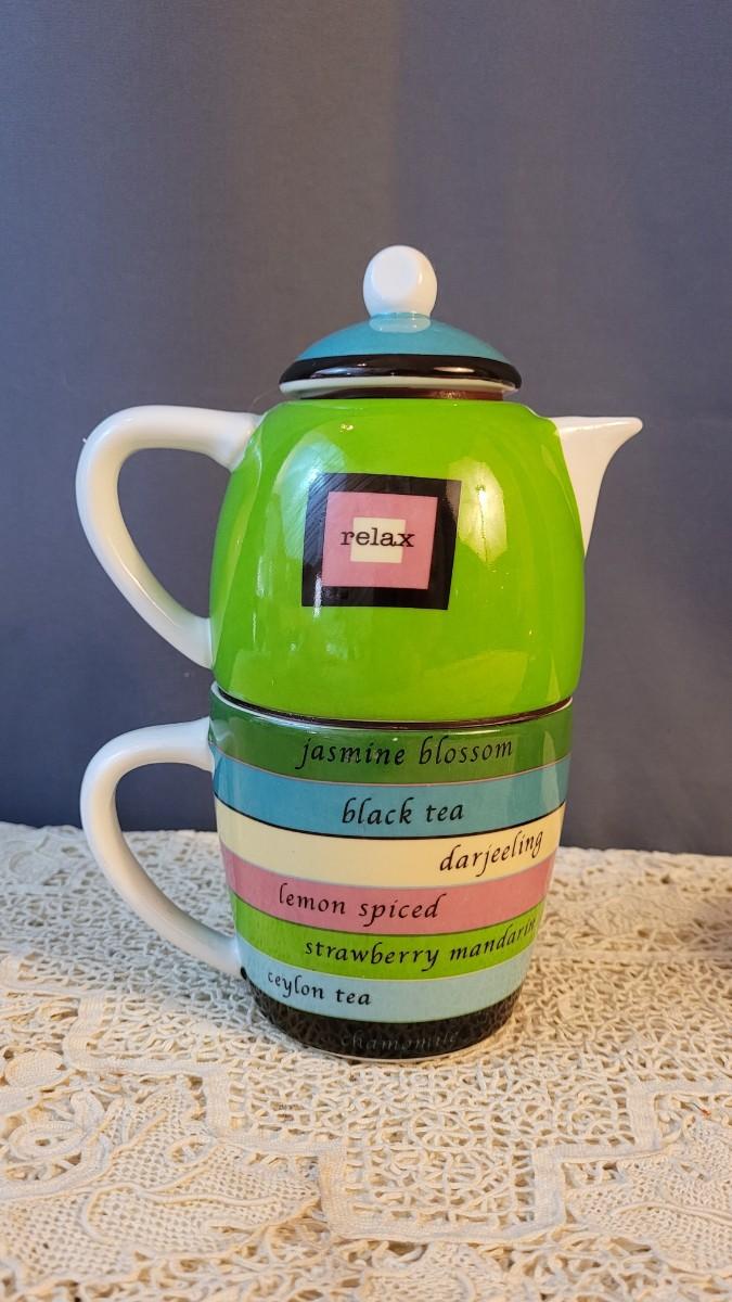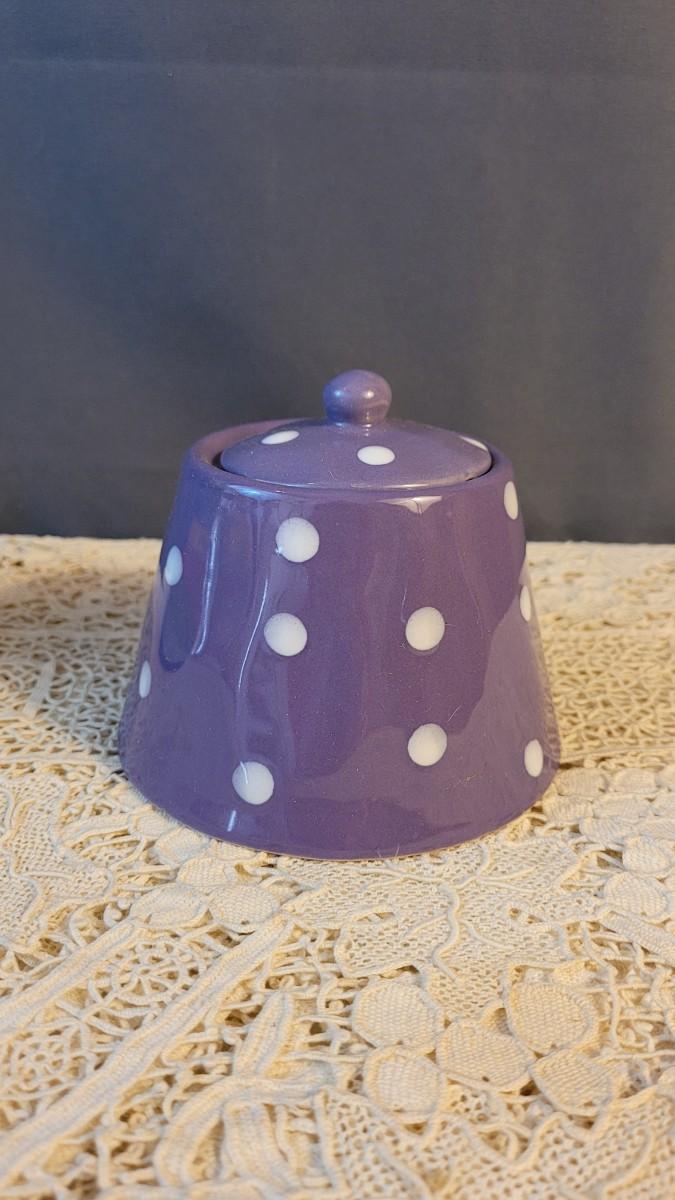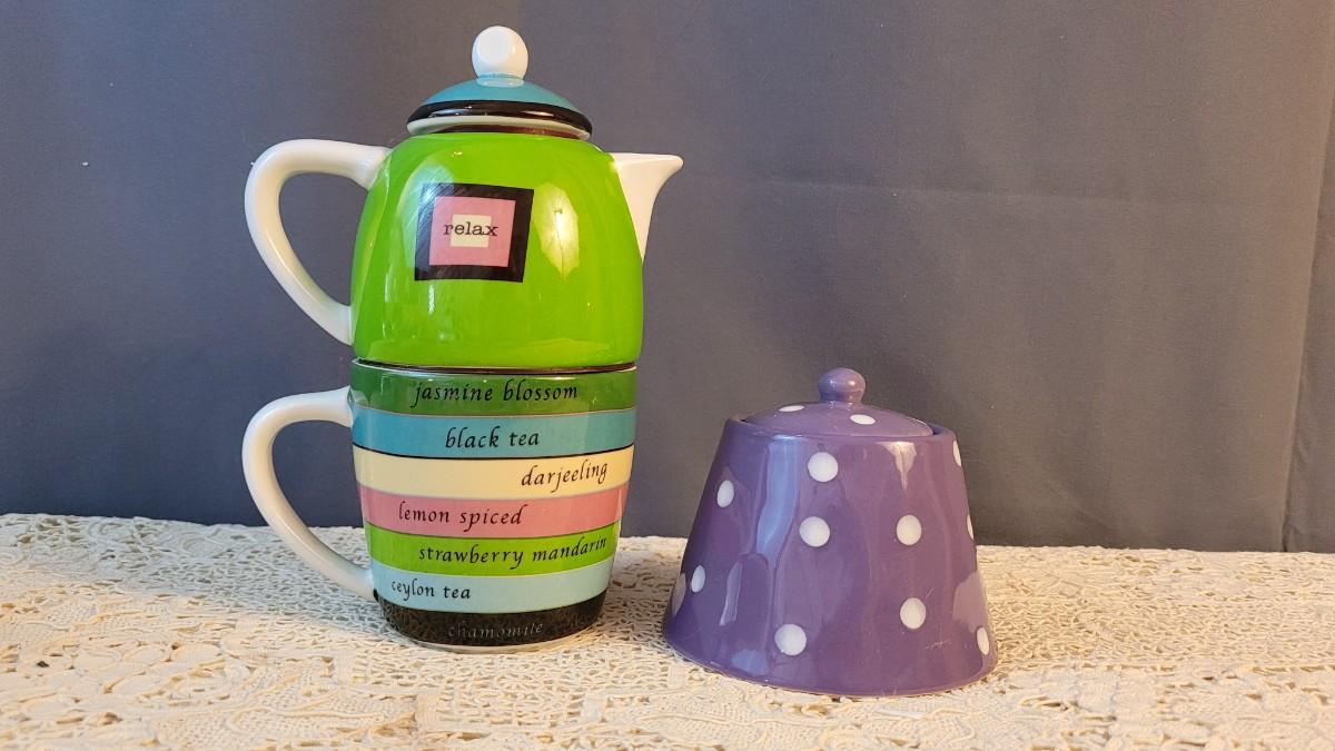 Lot 168: Individual Teapot Stacked on Cup and Purlpe with White Polka-dot Sugar Bowl