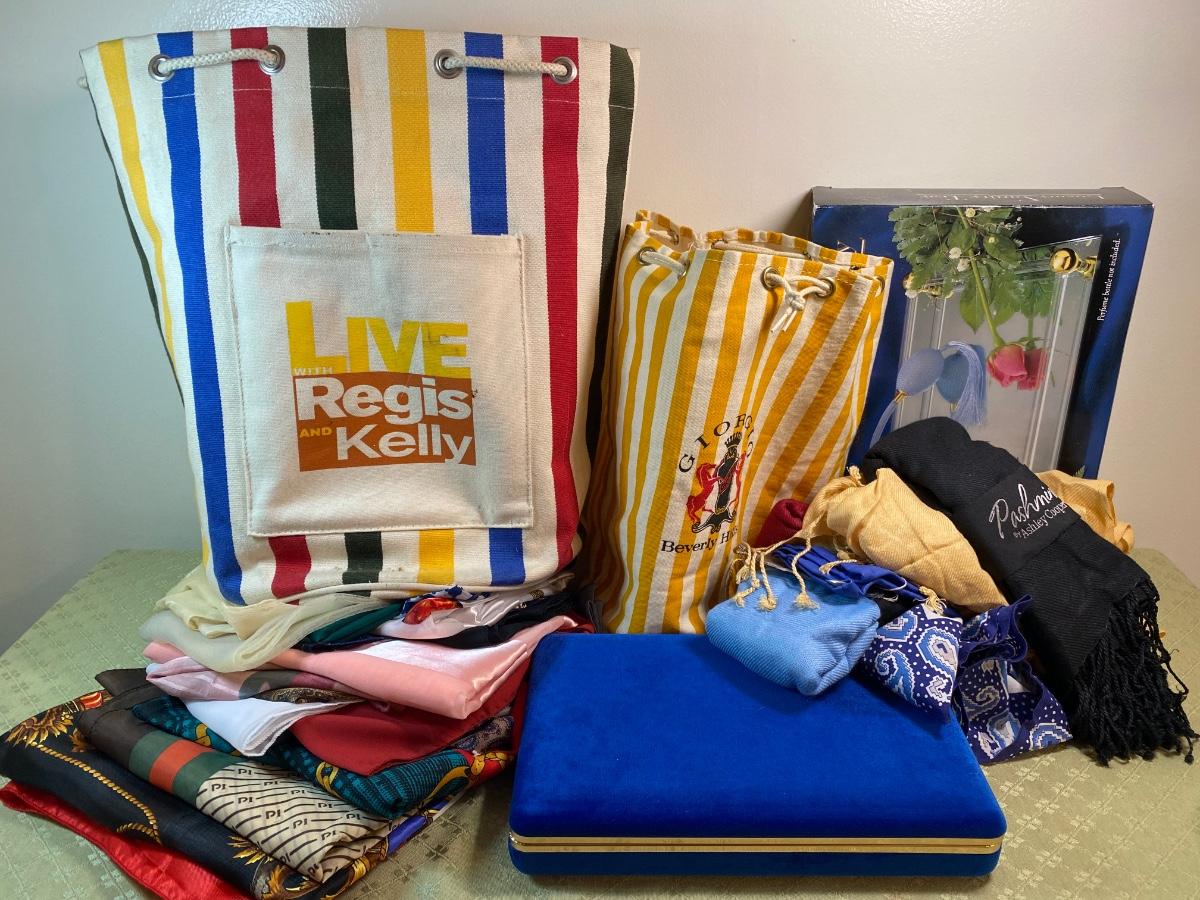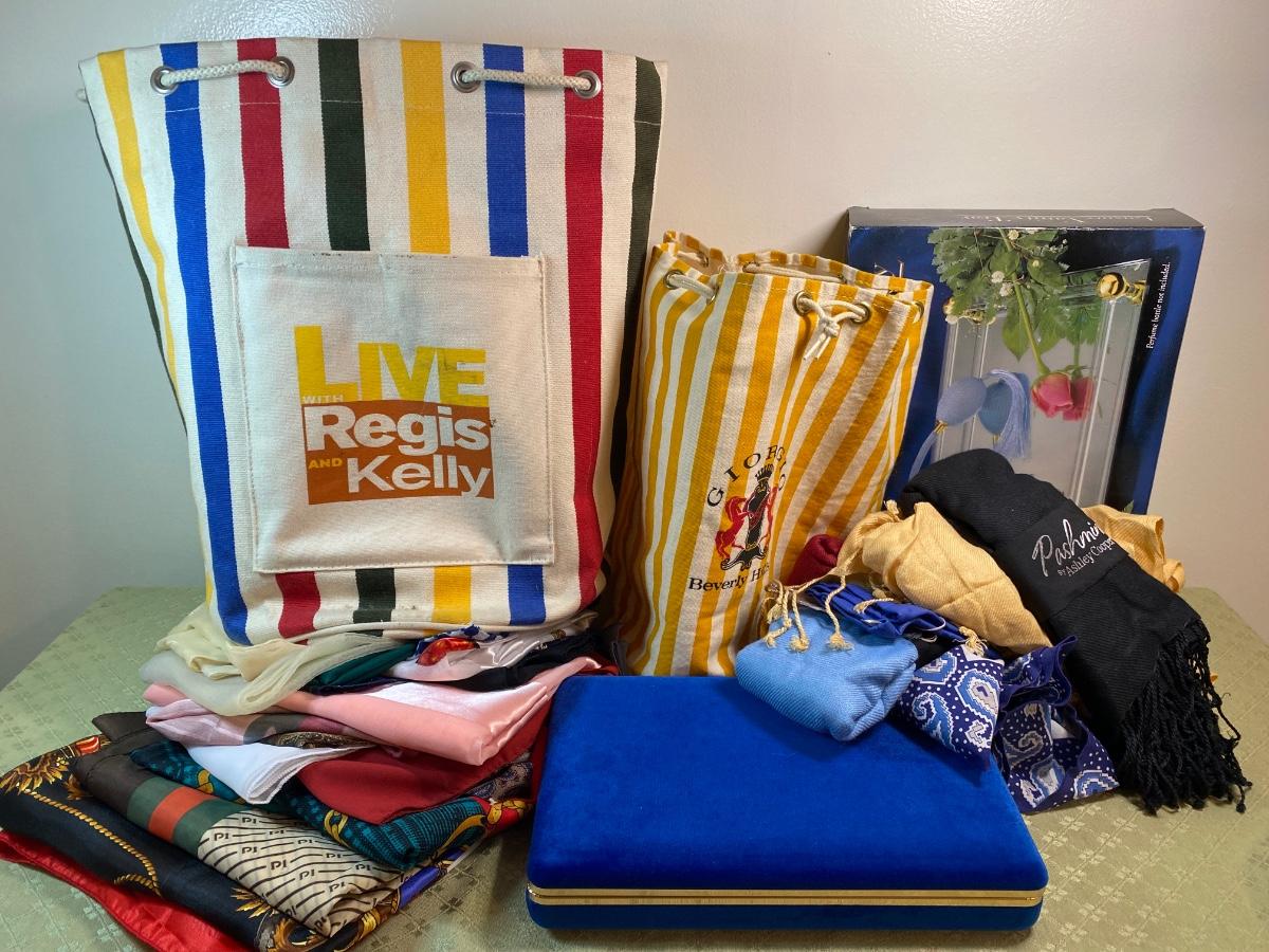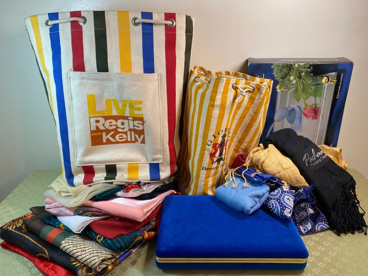 Live with Regis and Kelly Summer beach tote. Giorgio Beverly Hills small summer beach tote. Mirror vanity tray, travel jewelry organizer, Pashmina by Ashley Cooper and large vintage scarf lot.Please see all pictures as they are the best representation of the items. The pictures show condition, measurements if taken, and what is included in the lot. Due to the large amount that we photograph and the time frame, we are not always able to take measurements. All items unless noted, are pre-owned and have been used. If you purchased furniture, you must bring help. We do not allow one person to carry large furniture out on their own. Bring help, tools and a truck for the safety of our client’s homes, and your personal safety. Any damages that result to the property including walls, and floors due to moving of the furniture will be charged to the buyer. Company policy. Thank you.