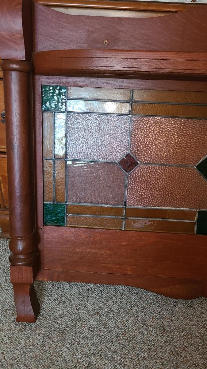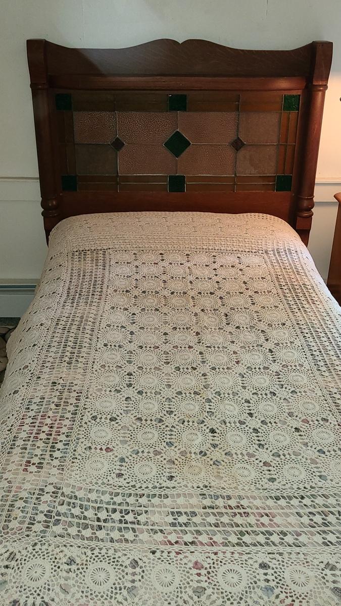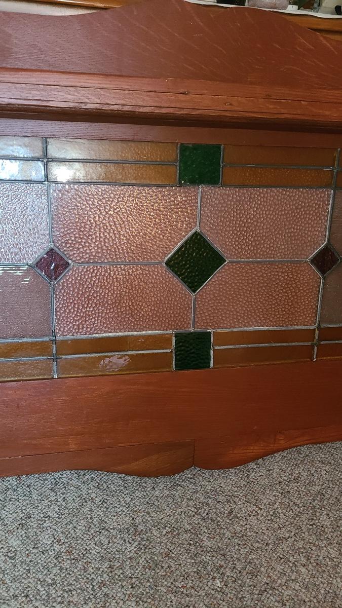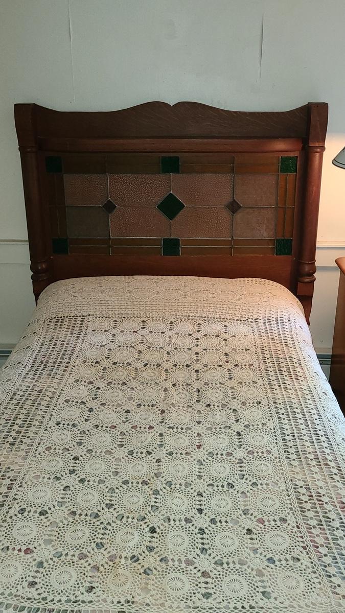 This was used as a headboard on a twin bed as decoration. The colors are gorgeous. Can be removed from frame, but you will need tools to do at home. The twin mattress and bedding are not included. This is just for the headboard with the stained glass piece. Please see pictures as they are the best representation of the item, the condition of the item, and the size of the item.