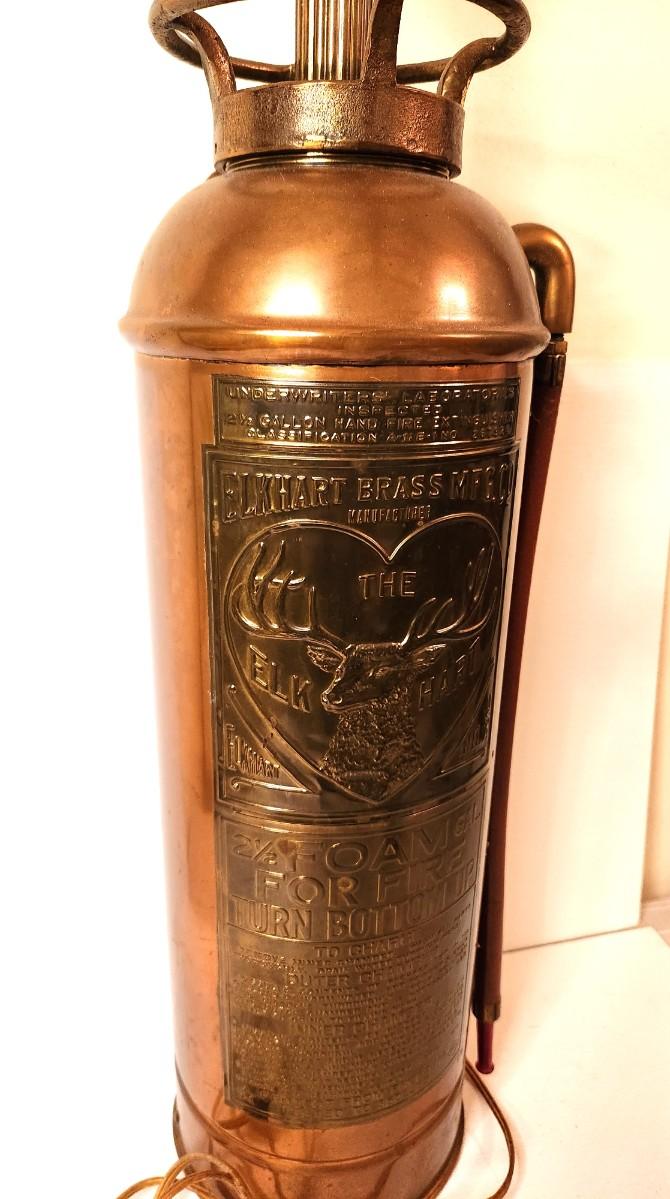 Very nice antique The Elk Hart Brass Fire extinguisher made into a table lamp - no shade, Nice big one - 36" tall. Works.