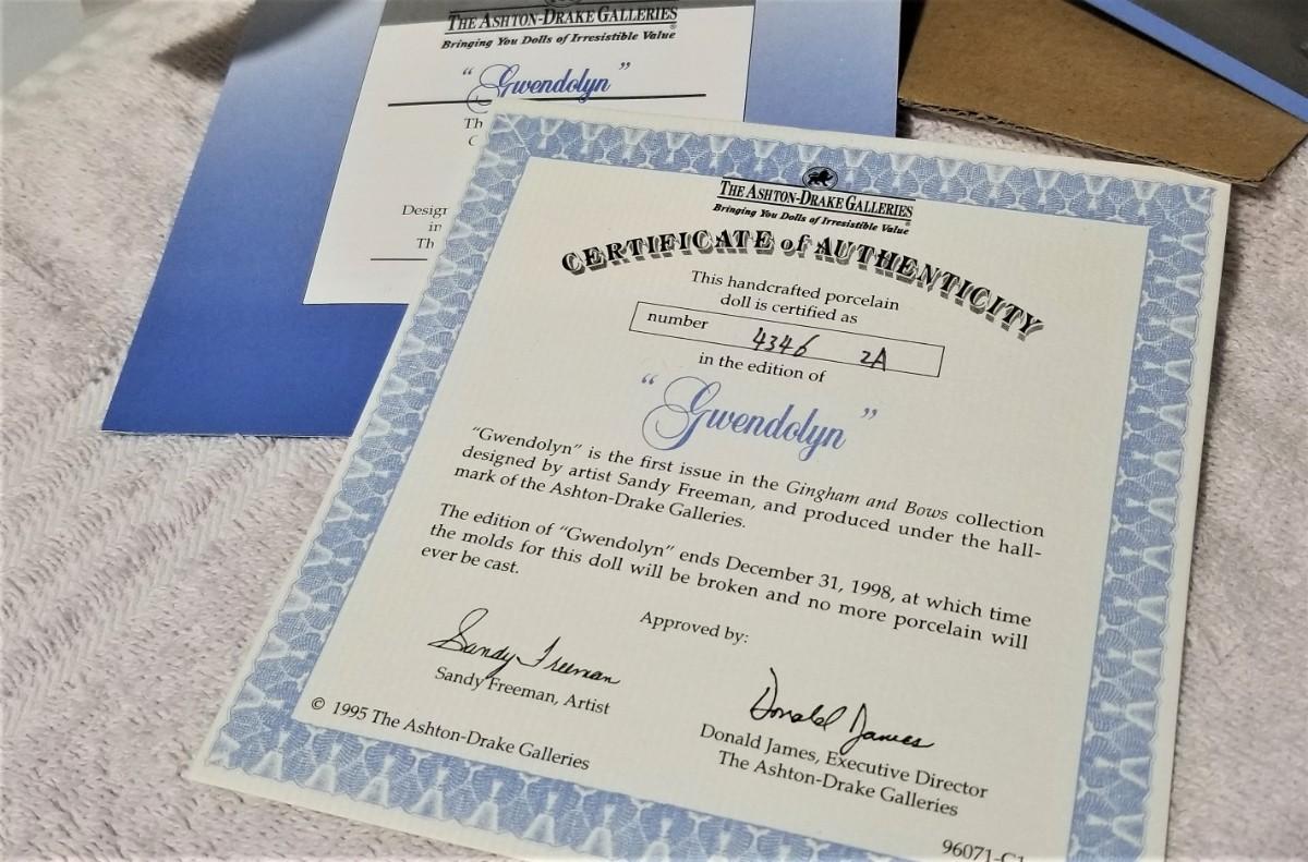 This Ashton Drake collectible doll is #4346 2A - First in Series - Gingham and Bows series - retired in 1998. She has never been removed from the box or played with. Complete, like new. About 16" tall. These dolls were expensive when purchased.