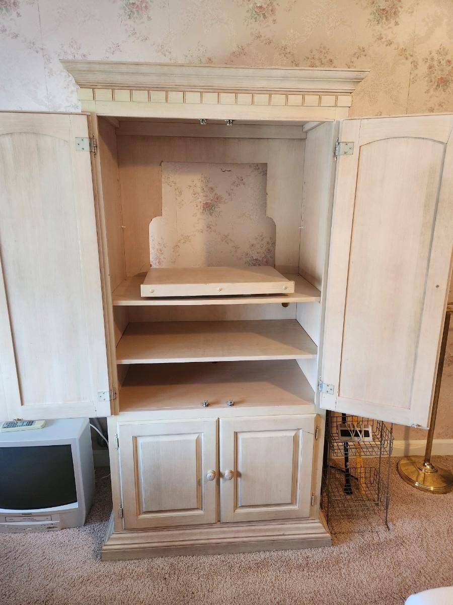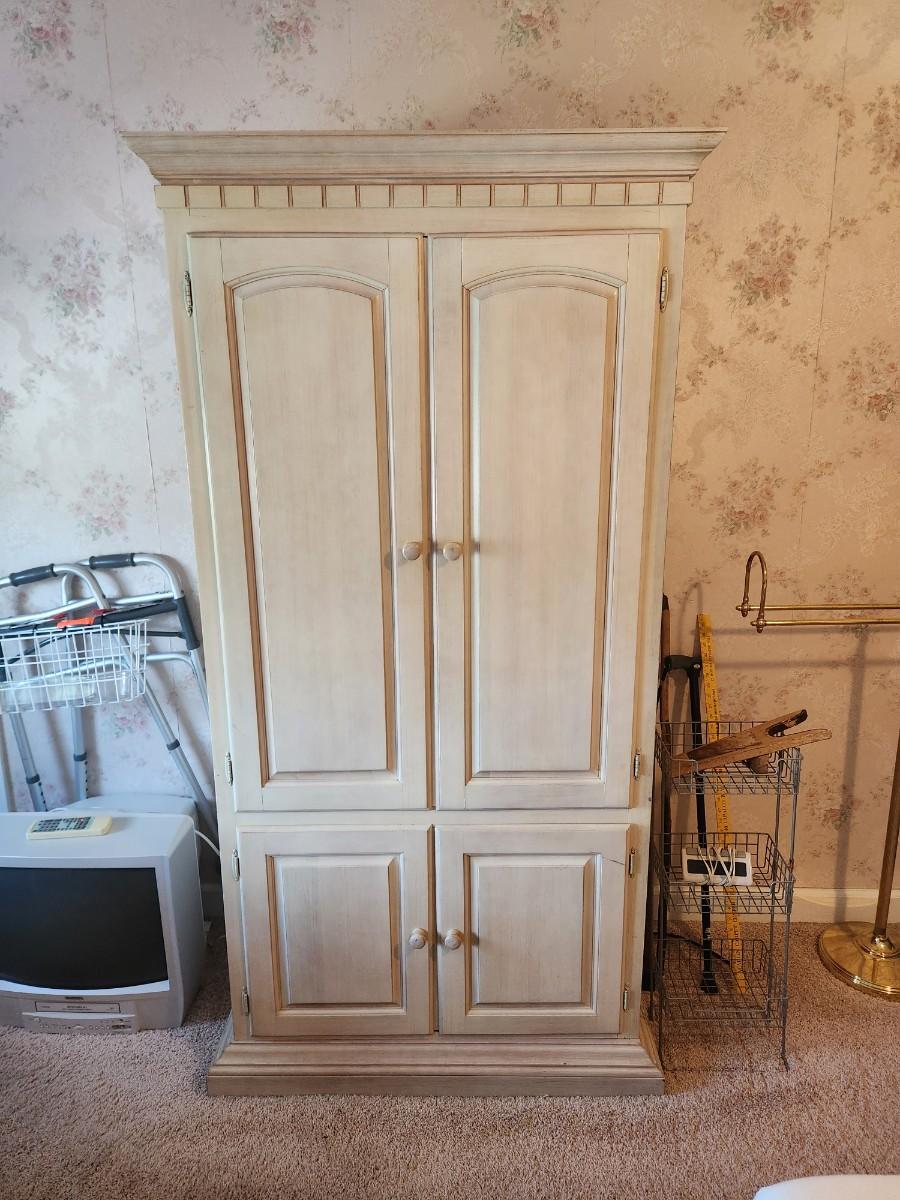 This tv cabinet breaks down - top/bottom lift off for easier moving. 35.5" across, 70.5" tall, 20" deep. Good used condition.