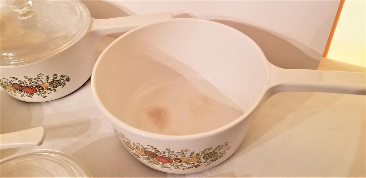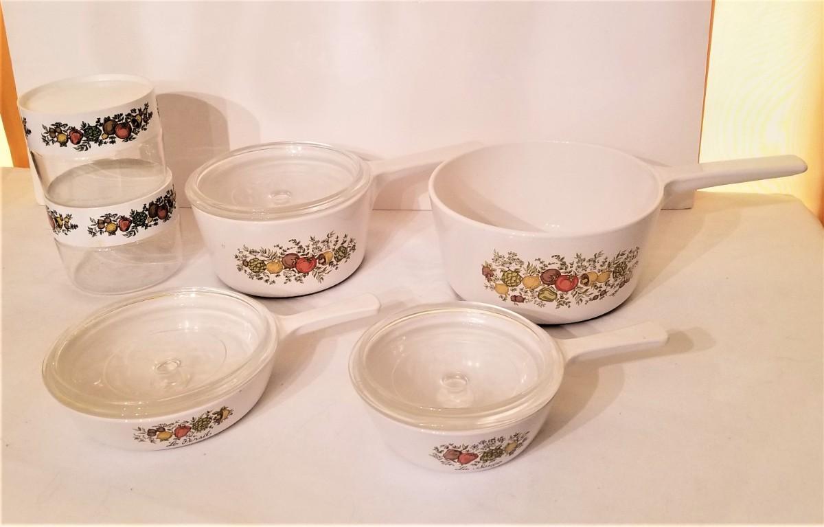 You get all you see here - Corning Ware Lot in the Spice of Life pattern. Includes 1.5 qt saucepan with lid; 2.5 quart saucepan, no lid; 6.5" tall pot with lid; 1 pint pot with lid, and 2 "go with" storage containers, each 3.75" tall. All gently used.