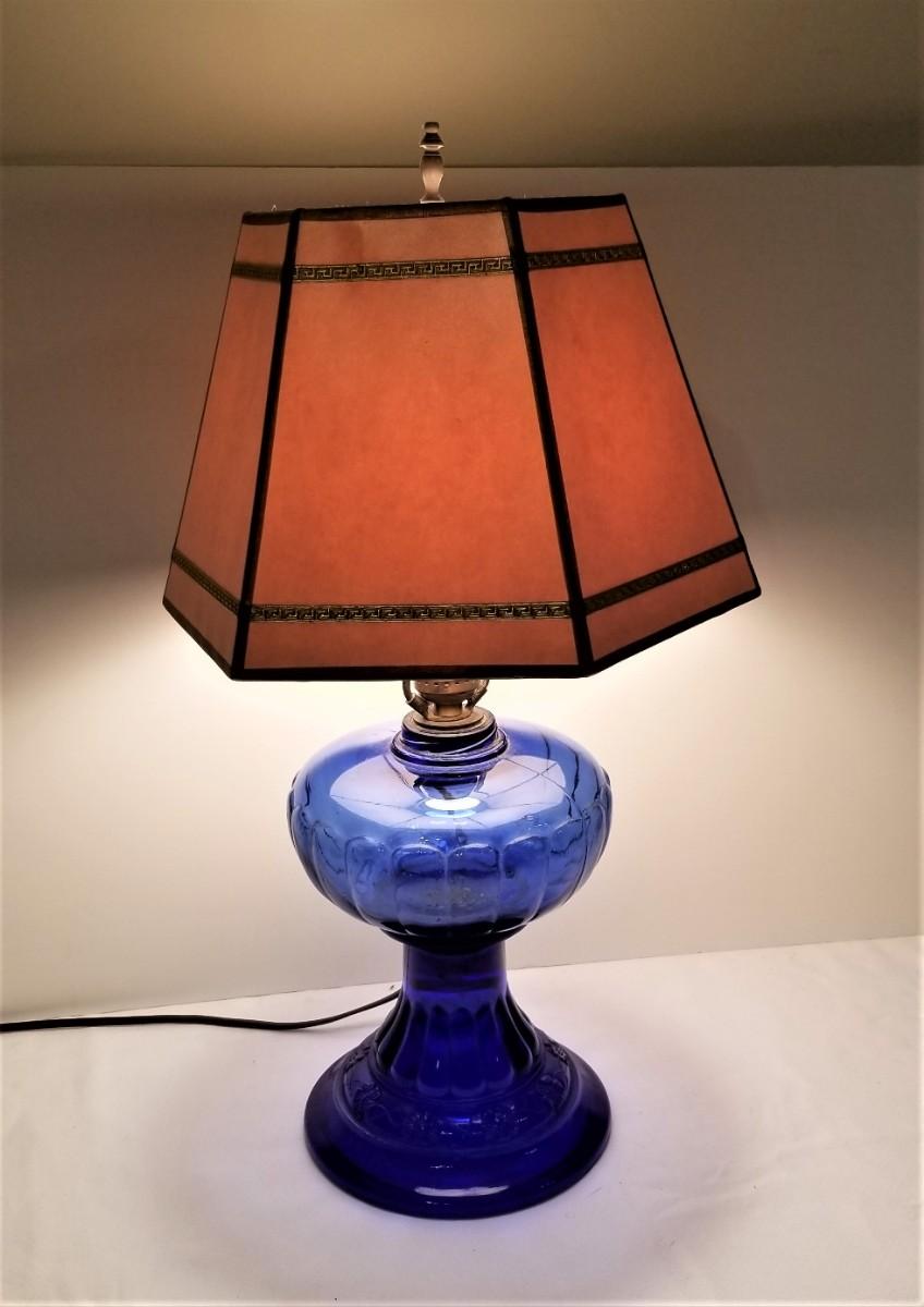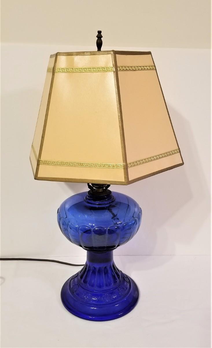 This old oil lamp has been electrified. Vintage Shade. Stands 21" tall. Good working condition. Cobalt Blue.