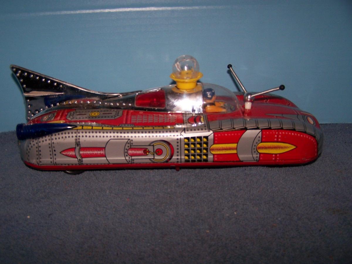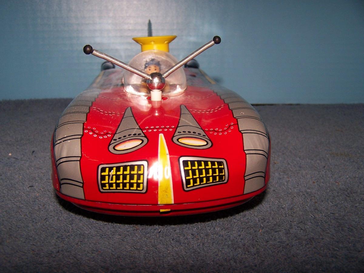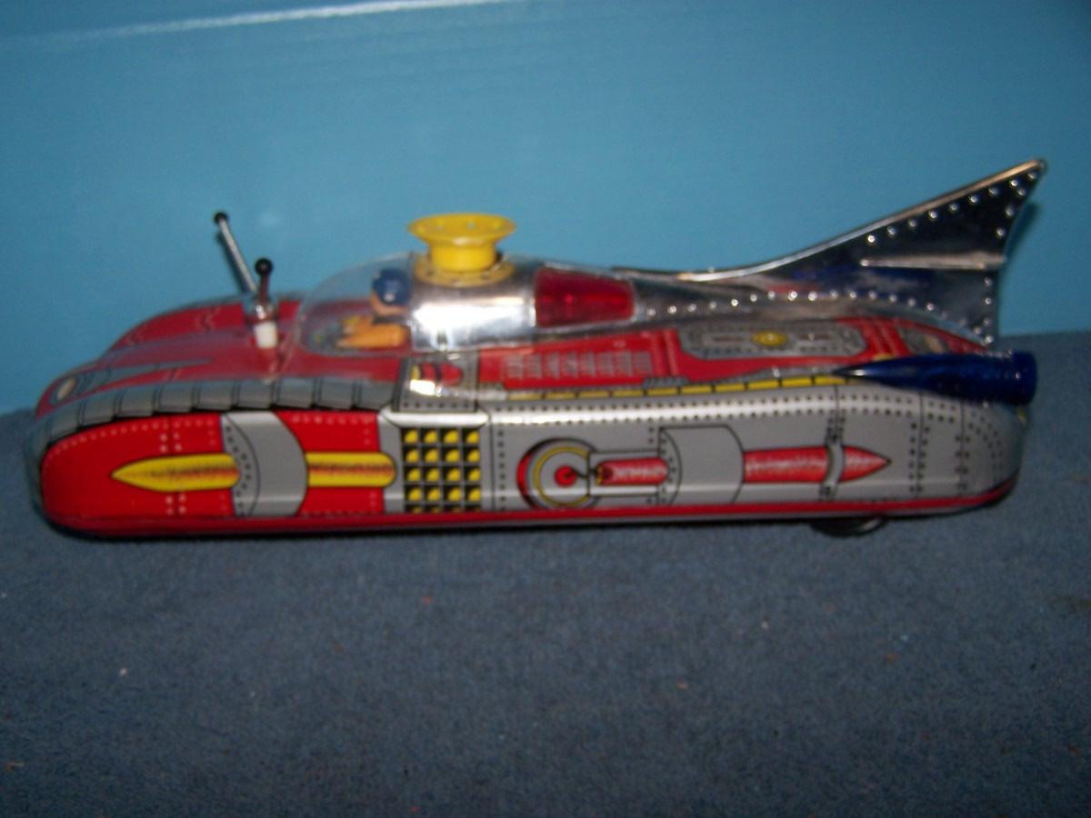 THIS IS A FAB COLLECTABLE TIN LITHO RED SPACE ROCKET TOY CAR!!! RUSSIAN??? 14'' LONG... NEEDS C CELL BATTERIES.. LIGHT WEAR.. (NOT TESTED DID NOT HAVE BATTERIES, AS IS.)