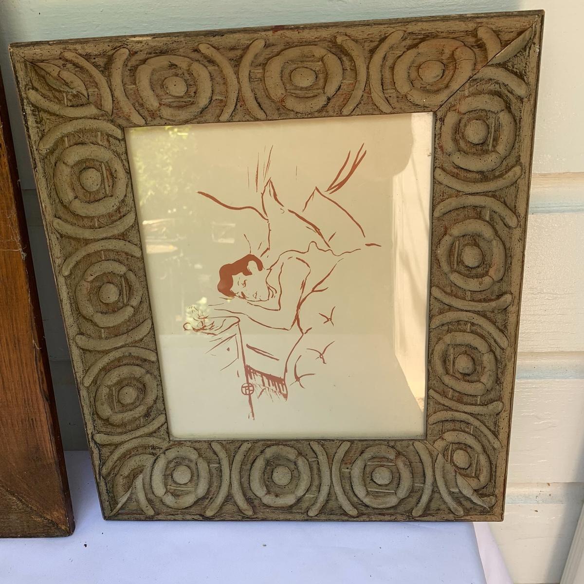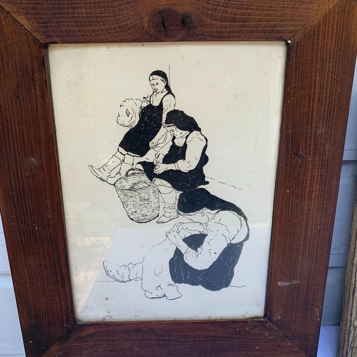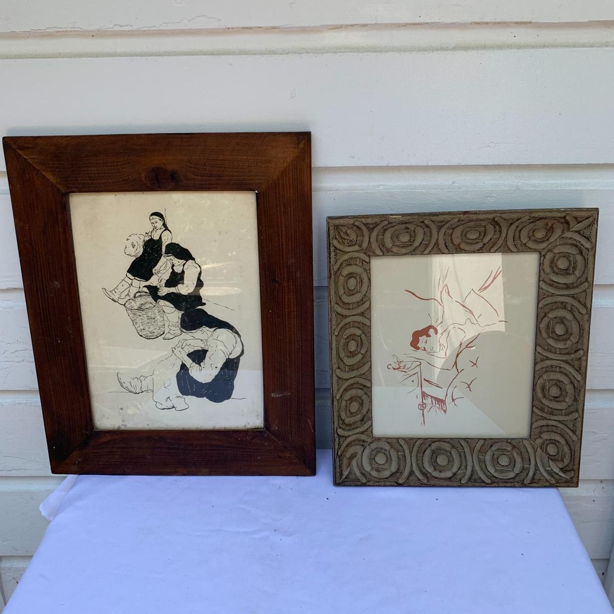 Sometimes great art is very simple. That is the case for lot 168 featuring two framed prints. The first is a quaint depiction of three lady’s working on textiles. The medium is black ink and the frame appears to be homemade of darkly stained wood. This item measures 17” X 21”. The second print is a simple yet elegant picture drawn in red of a person laying cozy in bed and measures 16” X 14”. Both frames are great so you can always use for other art! Shipping available.