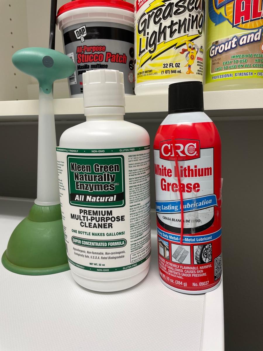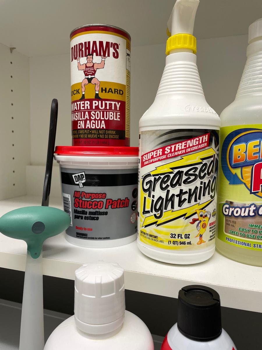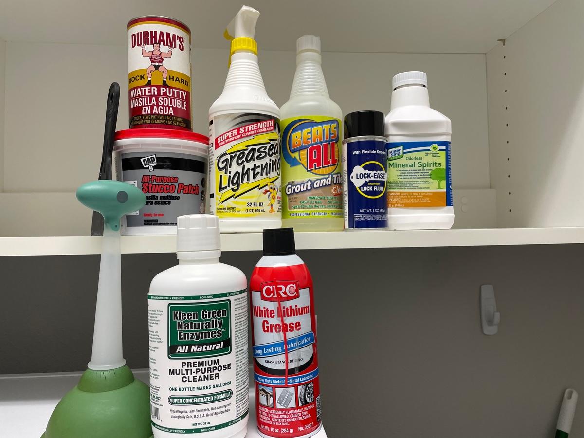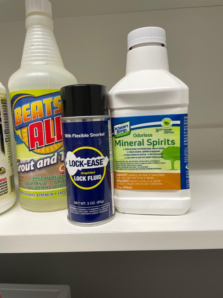 Assortment of cleaning products, spray lubricant, putty, mineral spirits