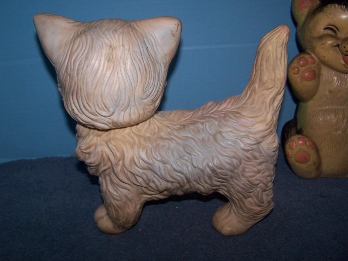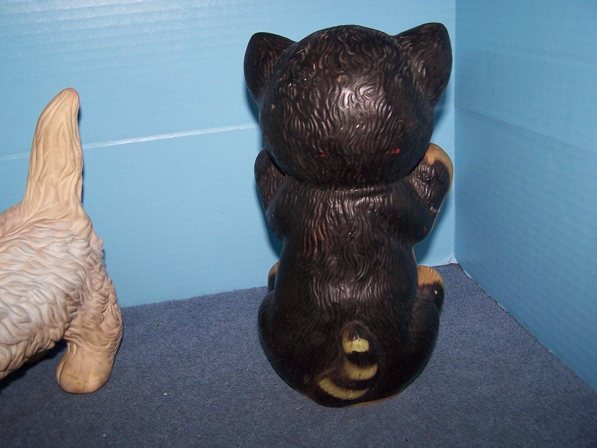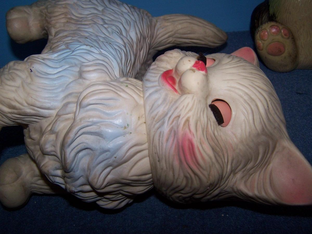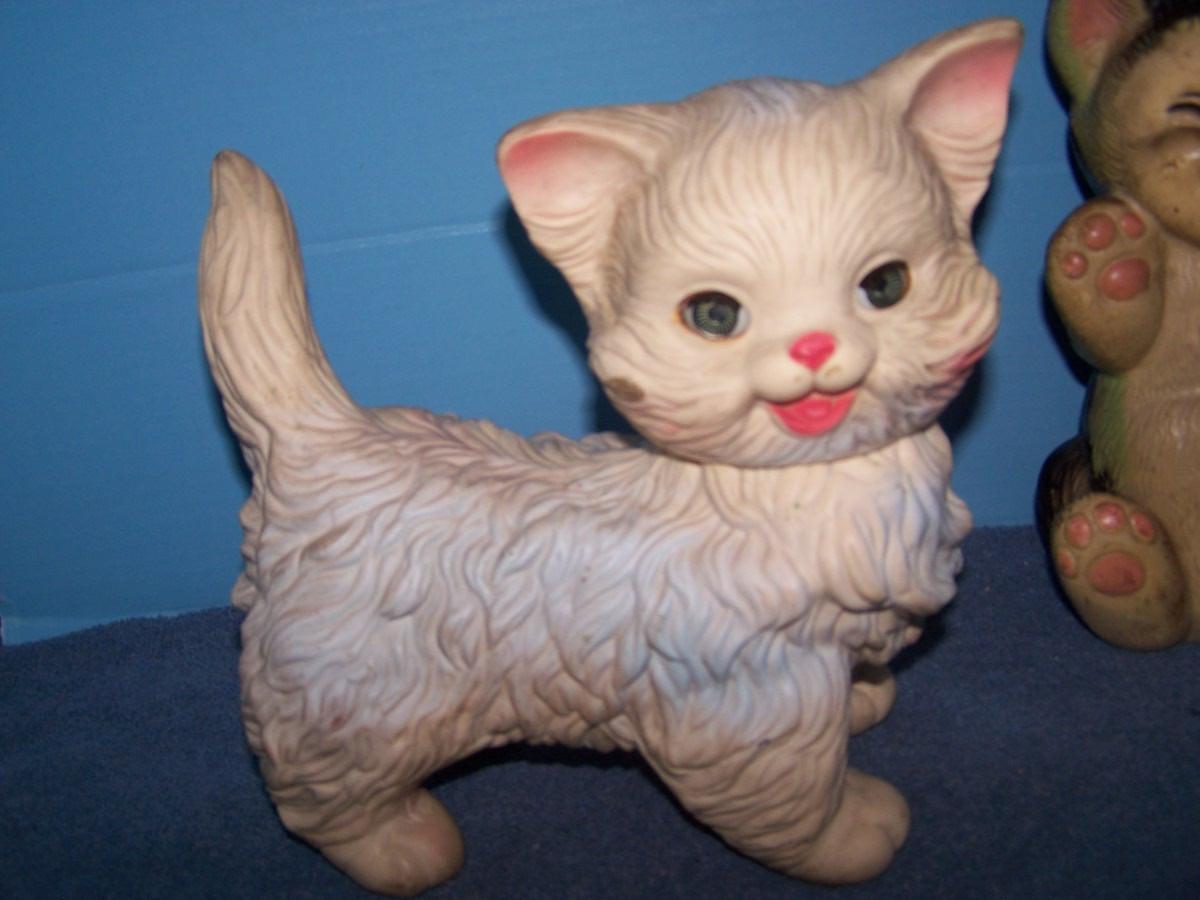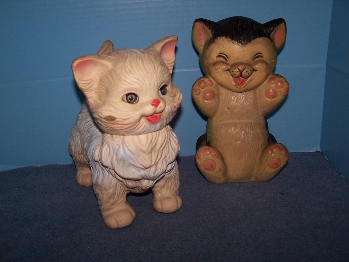SOME GREAT VINTAGE RUBBER CATS!!! MARKED. BANK-9 1/4'' TALL.. NEED A GOOD BATH, OTHERWISE, SOME WEAR..