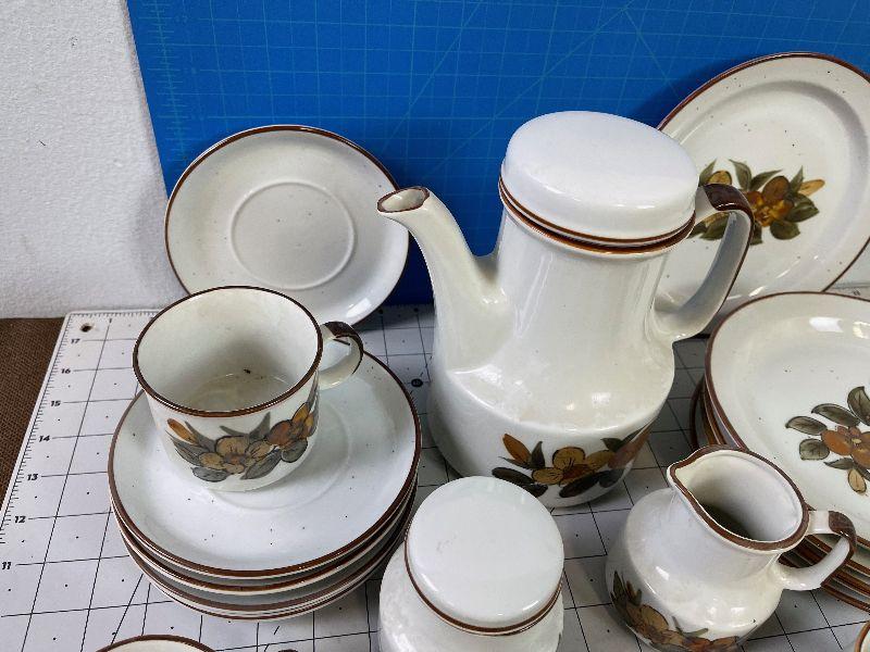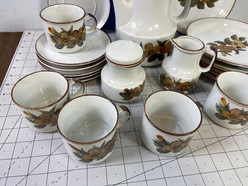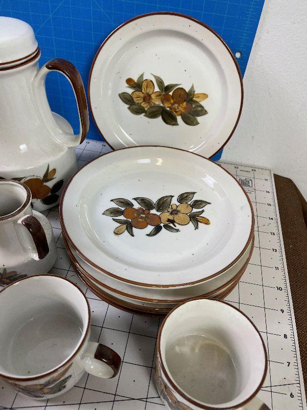 Used Good Condition, Tea Pot, cups, saucers, sugar creamer and Plates.