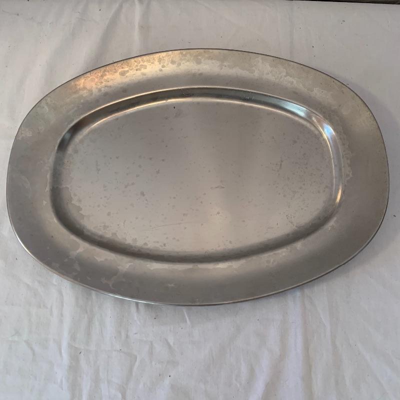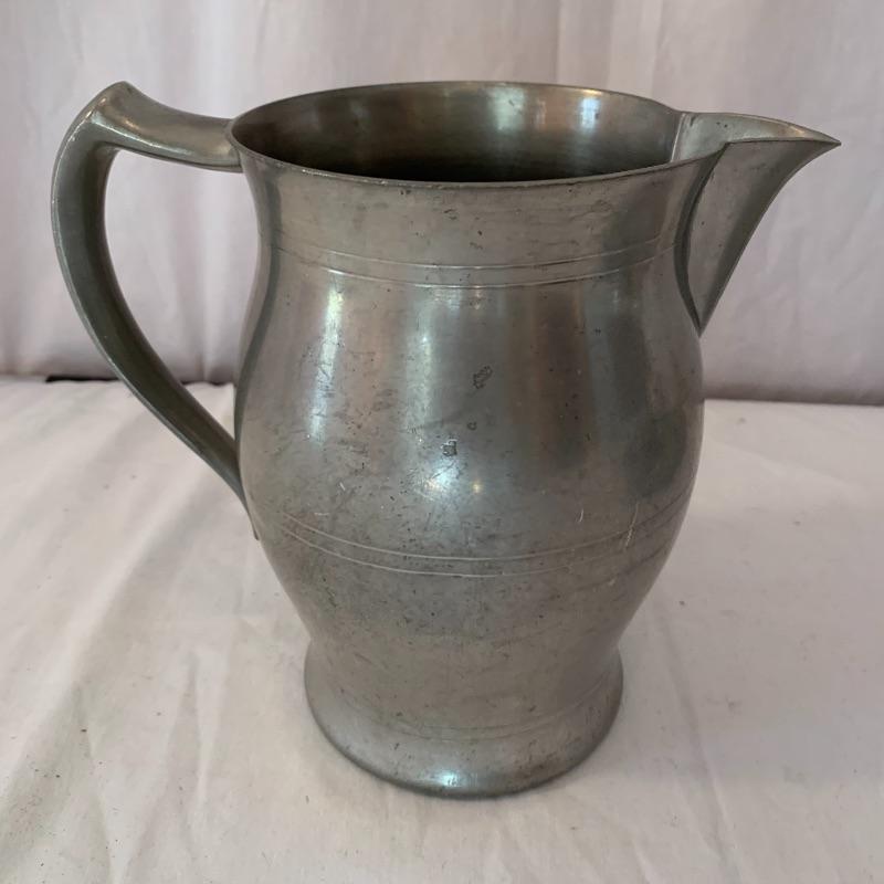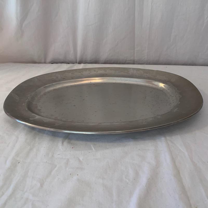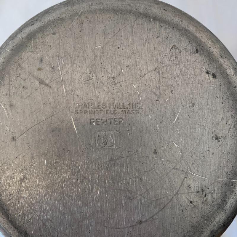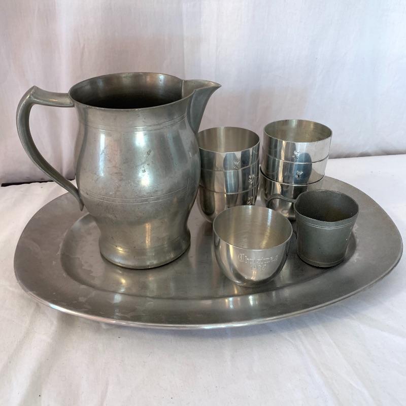 This lot includes one Cromargan metal serving plater, one Charles Hall metal pewter pitcher, one XRX pewter thick metal cup, and five Kirk Stieff Pewter metal cups. The metal serving player measures about 18in x 12.5in. The pitcher measures about 8in tall. Shipping available.