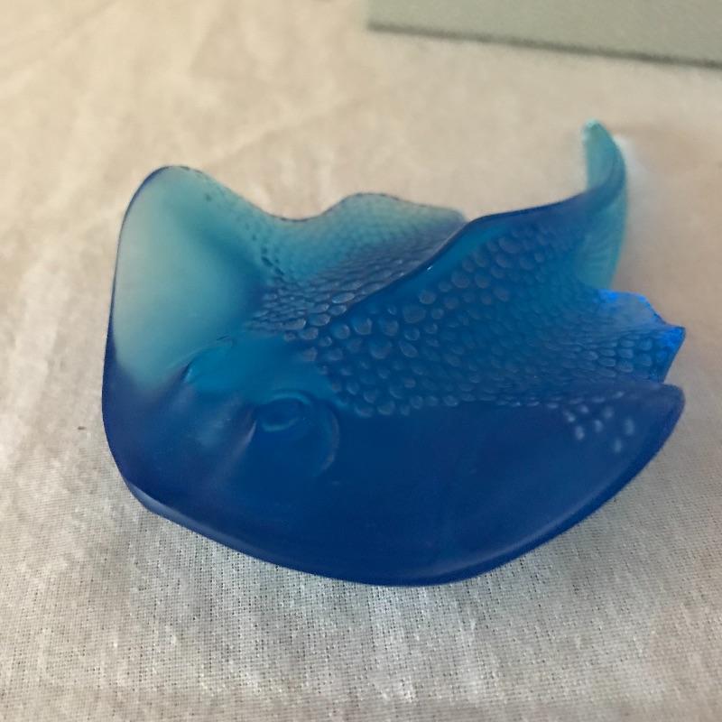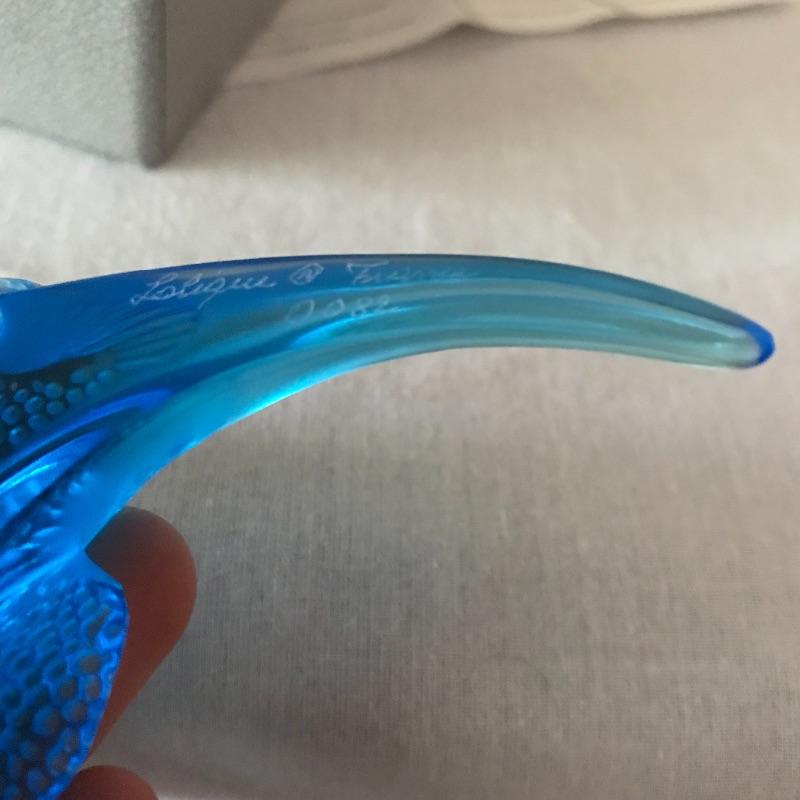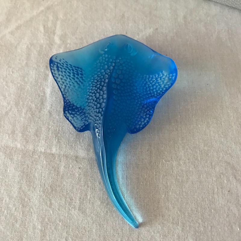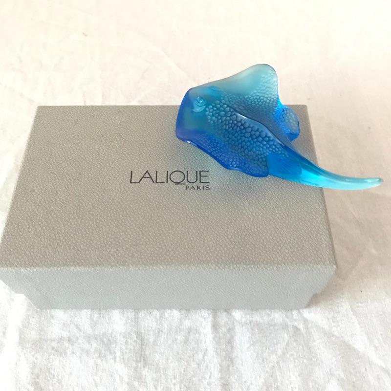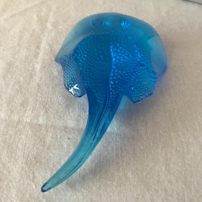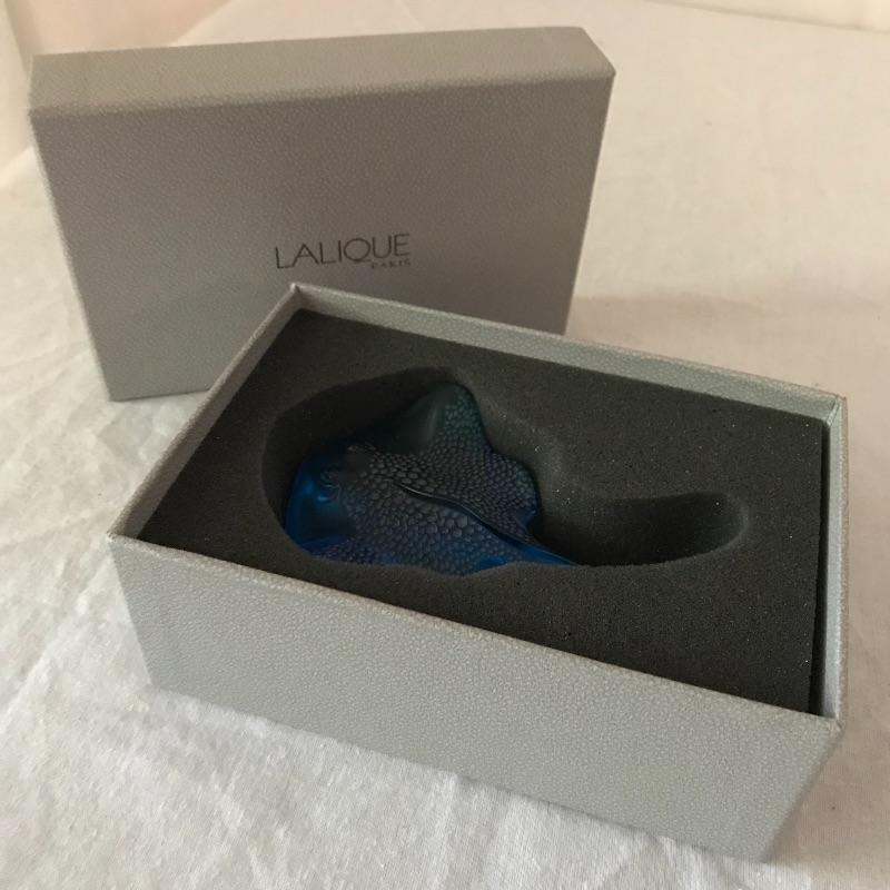 This Lalique stingray is a stunning bright light blue that catches the light appearing to be many different shades. It comes with a signature and is numbered 0082. Piece is 5” long and comes with original box. Shipping available.