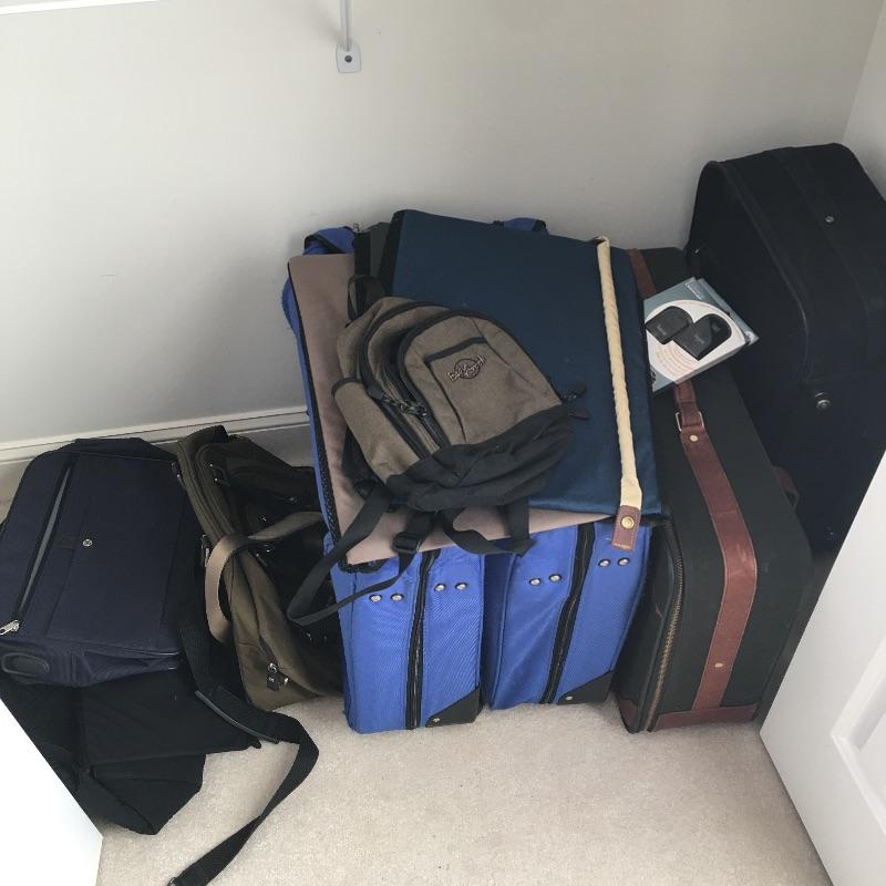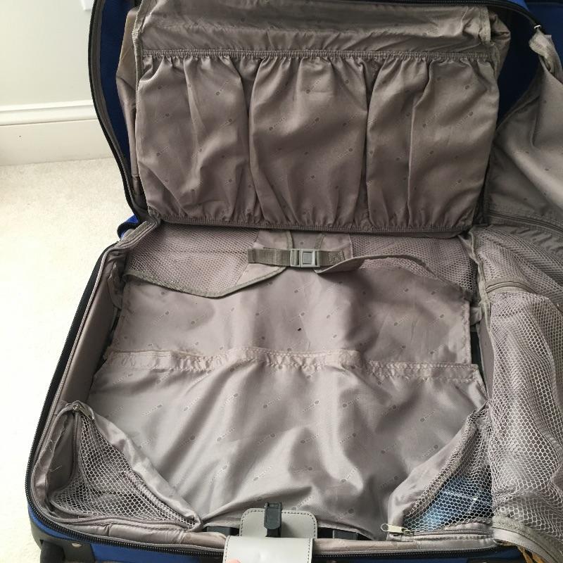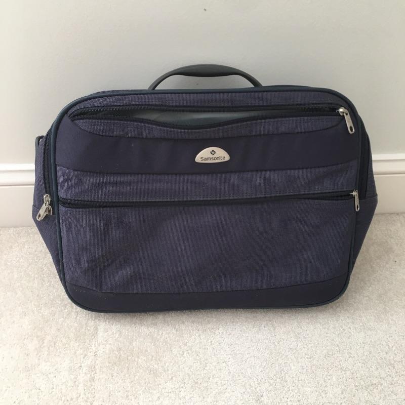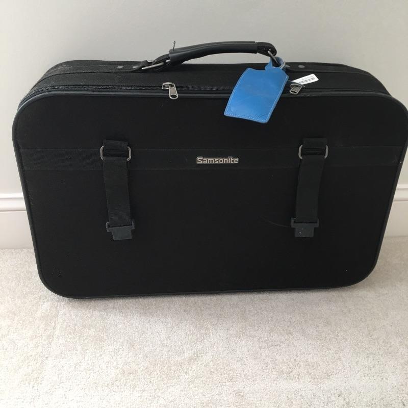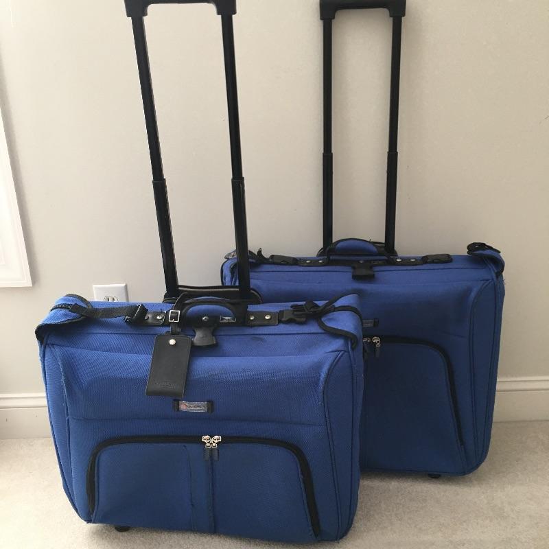 This great selection of luggage offers just about every sized piece you could possibly need that includes a pair of suitcases, pair of hanging bags, mini backpack, attaché size case by Samsonite, three folding systems, bag and more. Blue hanging bags measure 19” x 23” x 8”.