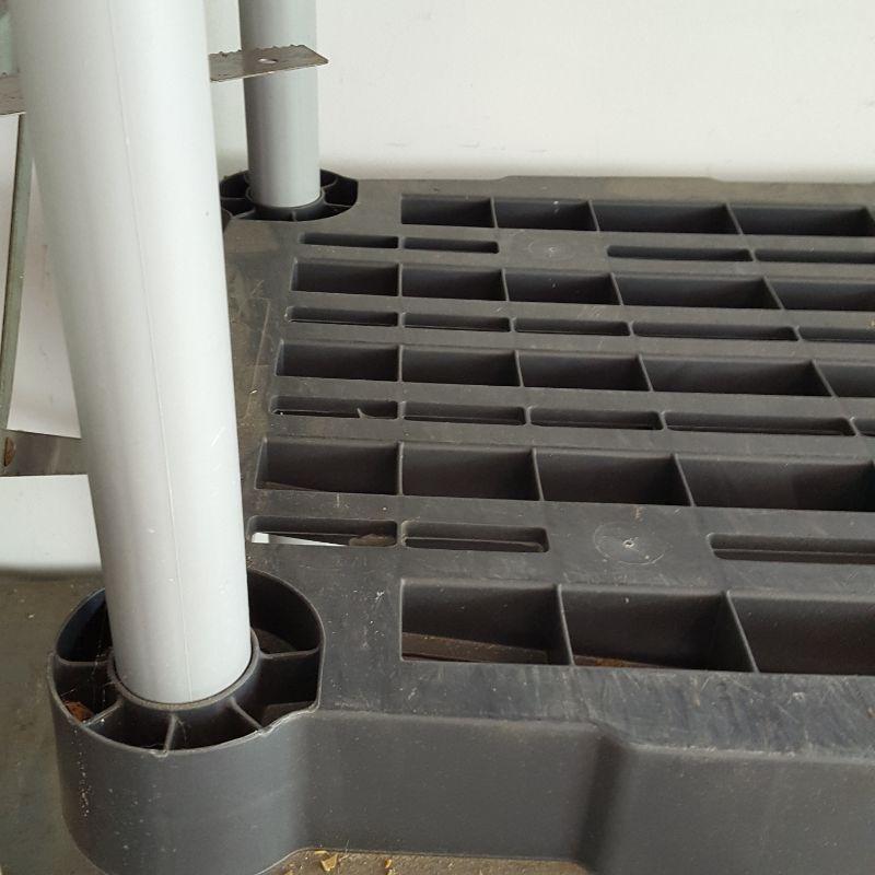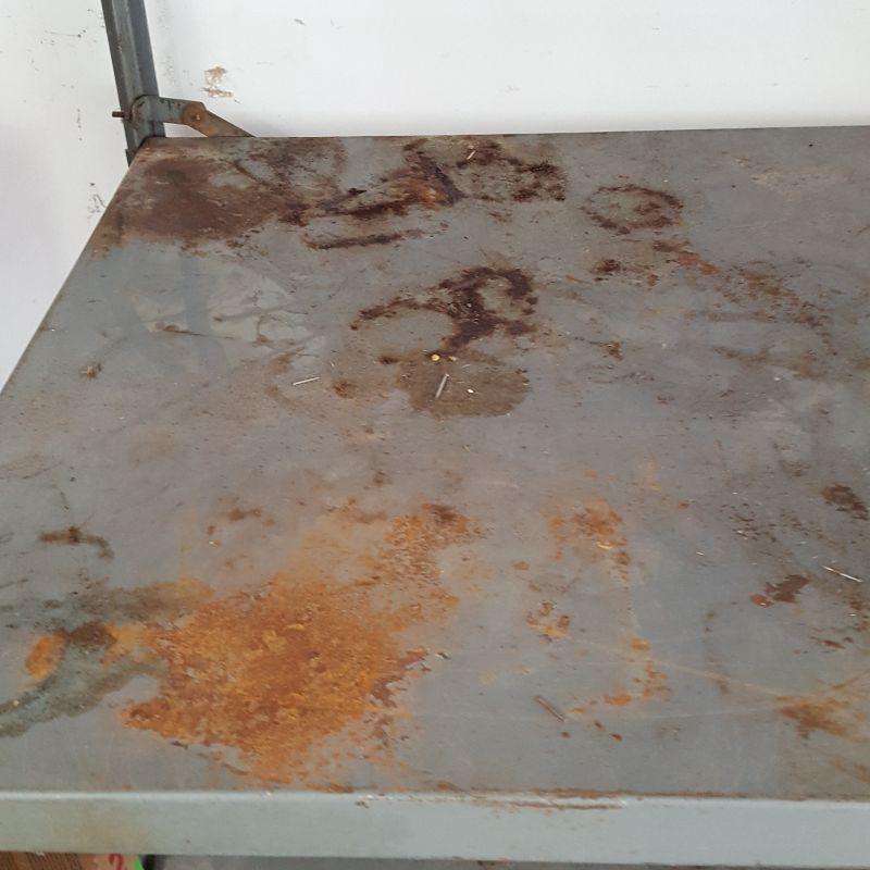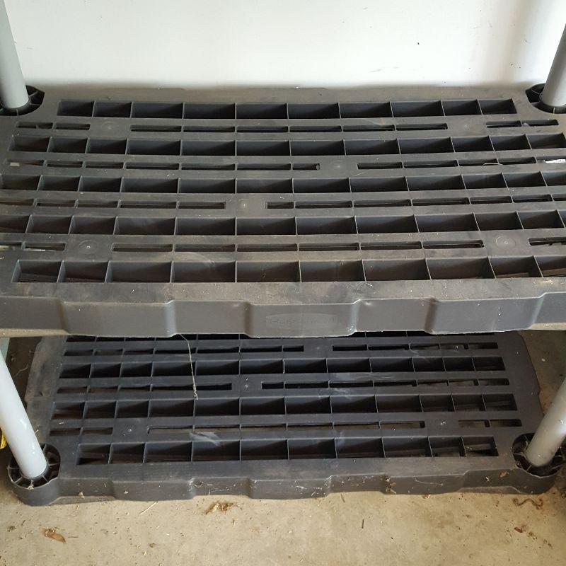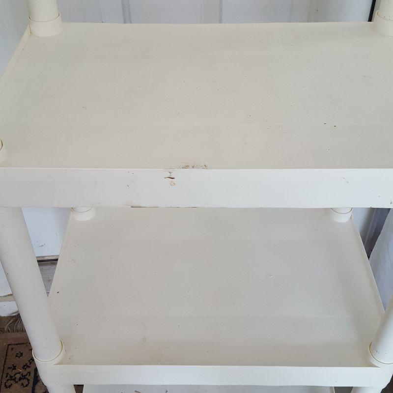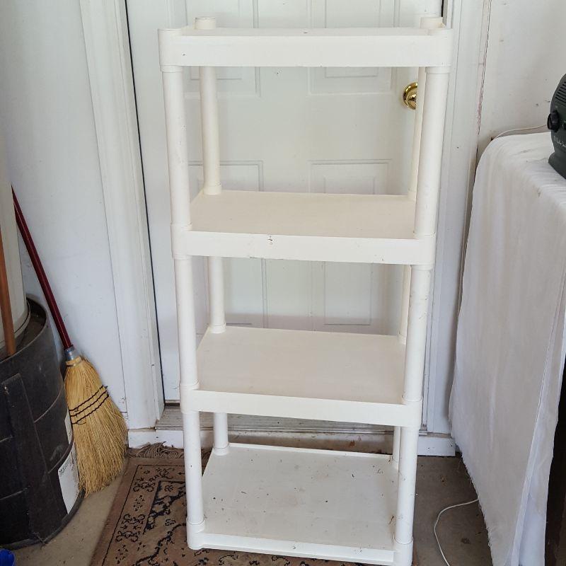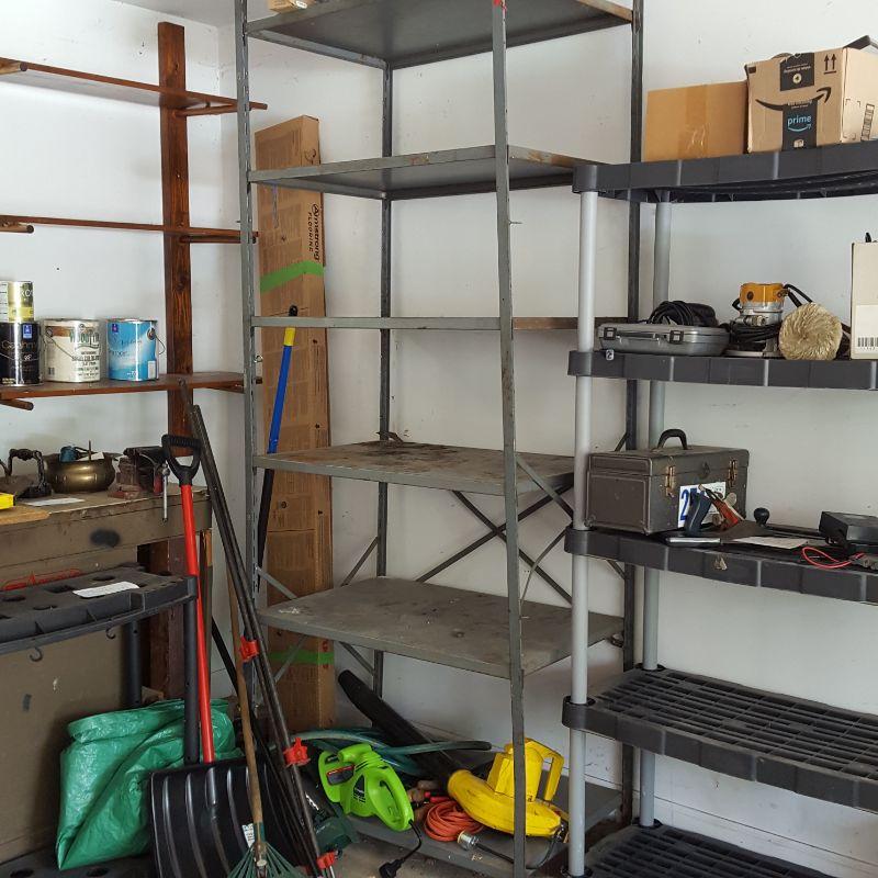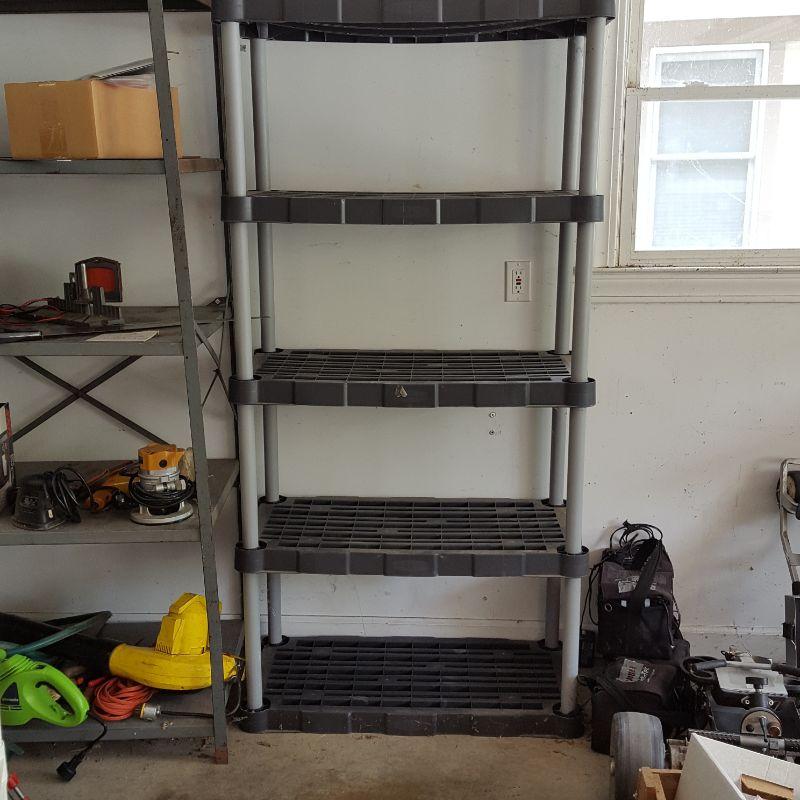 Get organized!! Three different shelves that would be great in your garage or basement!! The largest shelf is made of 6 metal shelves, that do not come apart and measures 38x24x93 inches. There are stains and rust, but spray paint will do it wonders!! The white shelf is made of sturdy plastic and can come apart. The last shelf is also made of sturdy plastic and has 5 shelves that come apart for traveling purposes.
