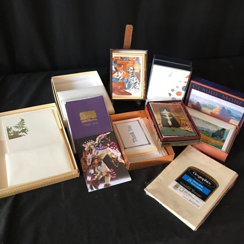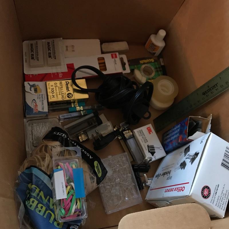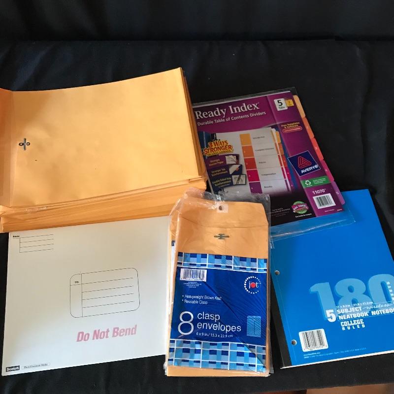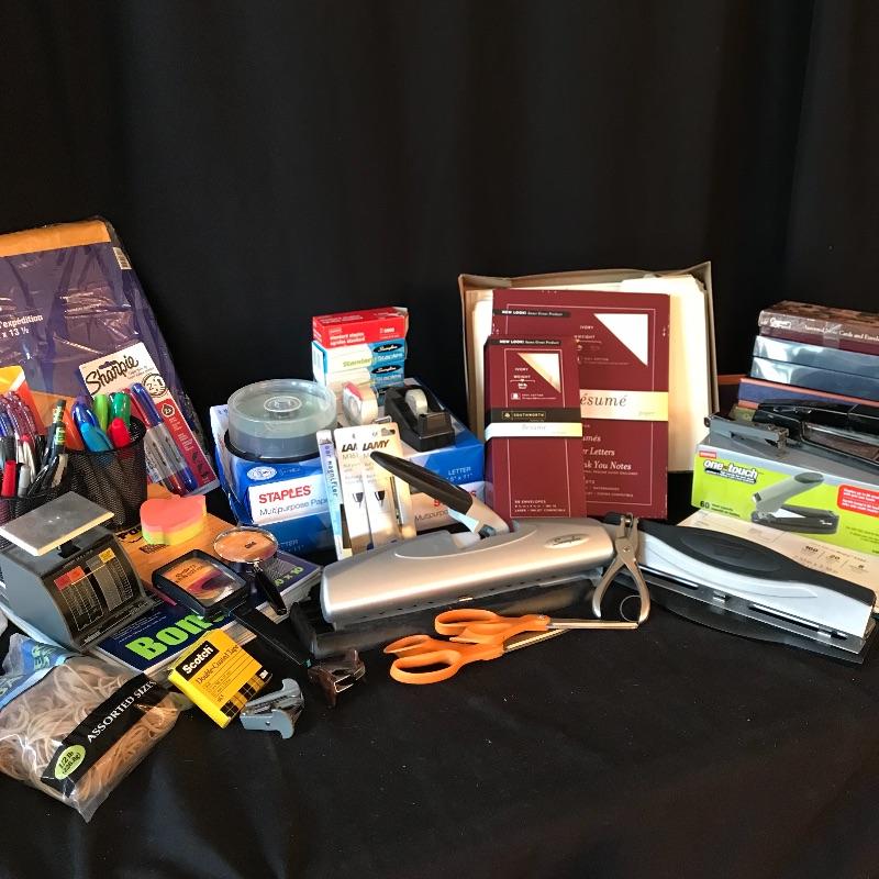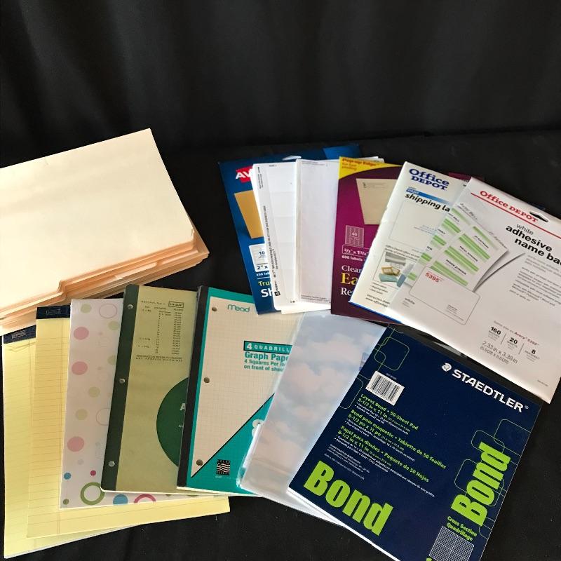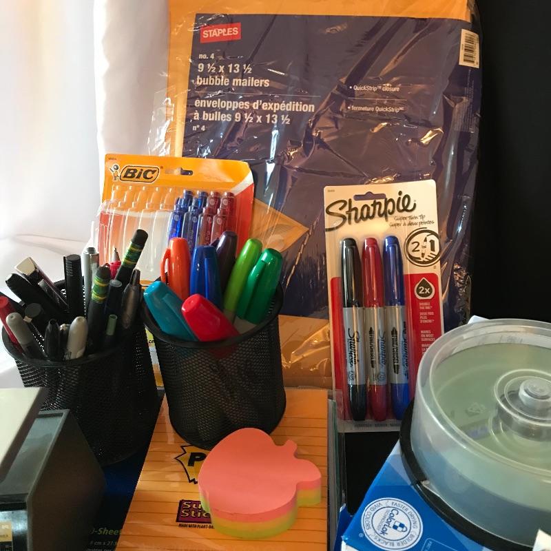 Large office supply lot containing multiple supplies for everyday and business office use. Mailing envelopes and printer paper, stationary cards, Sharpies, scissors, magnifying glasses and so much more! See photos for lot inventory. No shipping.