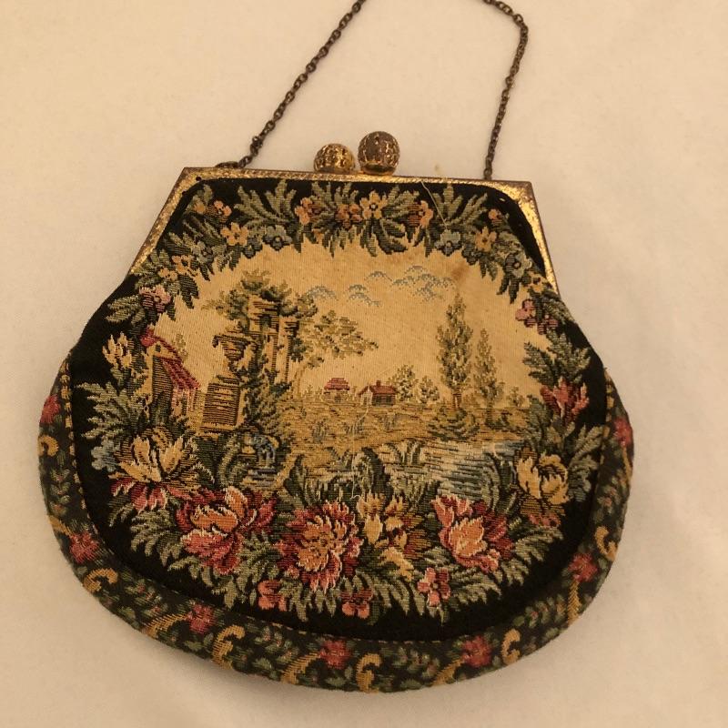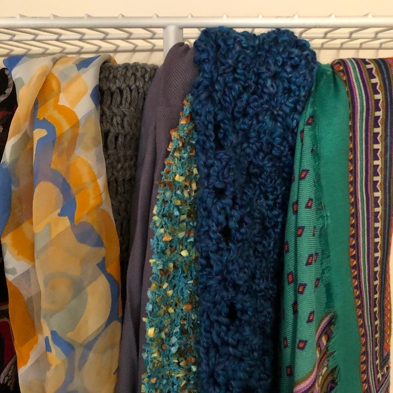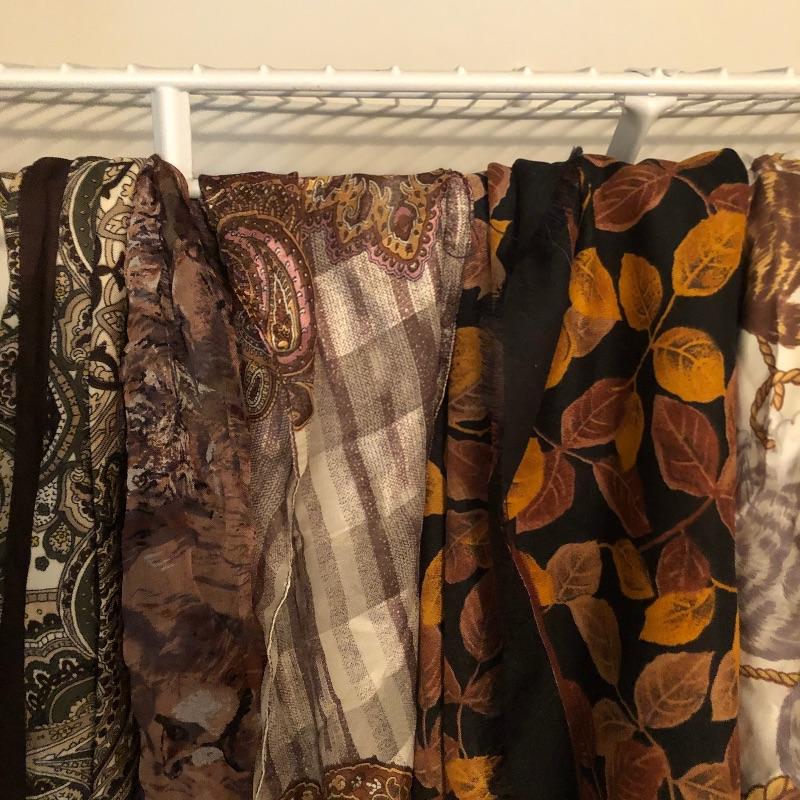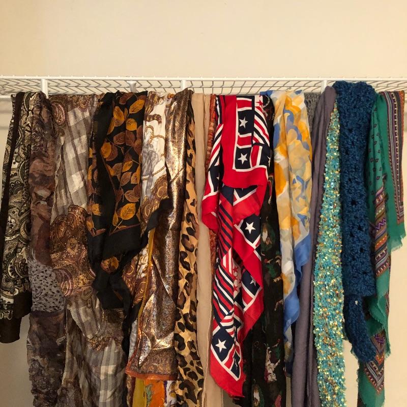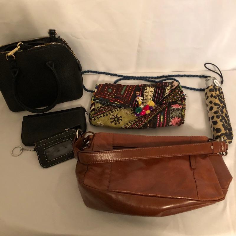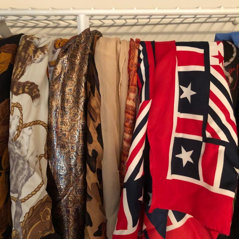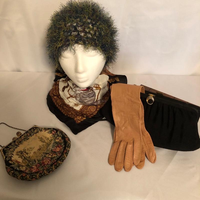 Large assortment of scarves in all shapes and sizes, silk, cotton, wool and more. A nice assortment of purses that includes two gorgeous vintage ones; the tapestry purse and the black clutch. Also included are a few wallets, tote bags and two umbrellas.