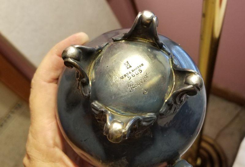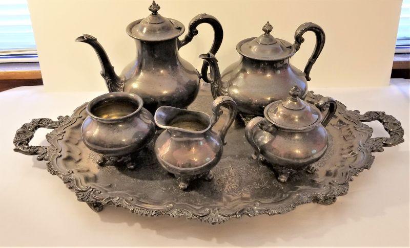 Note: I lighted up the photos so you could clearly see the set, but while this set is in good condition, it is tarnished BLACK. You will probably need to have it professionally polished....but if you do, you'll have a real beauty. Reed and Barton Silver plate tea service - you get all you see here: Teapot, coffee pot, creamer, sugar, waste bowl and footed tray. Tray measures 26" handle to handle.