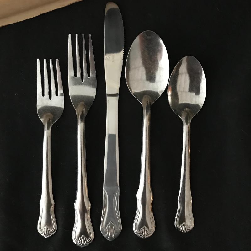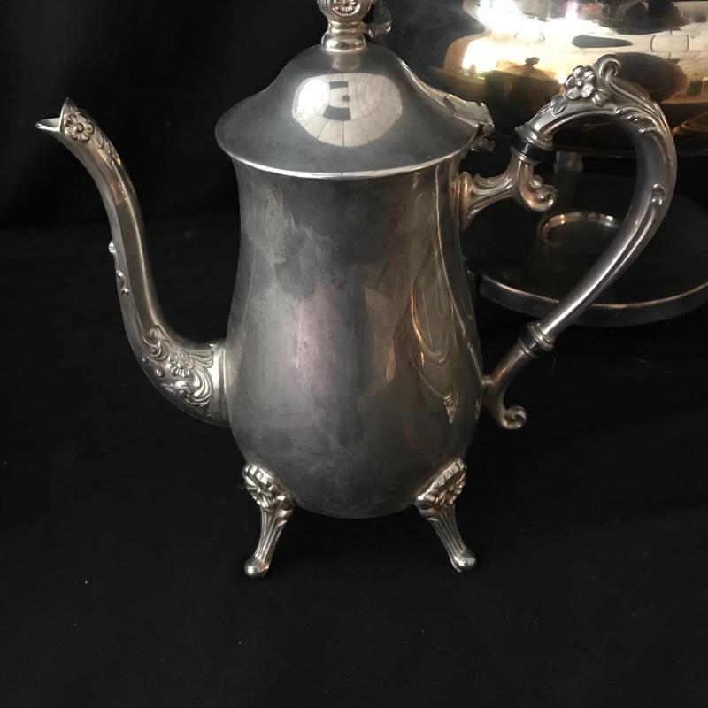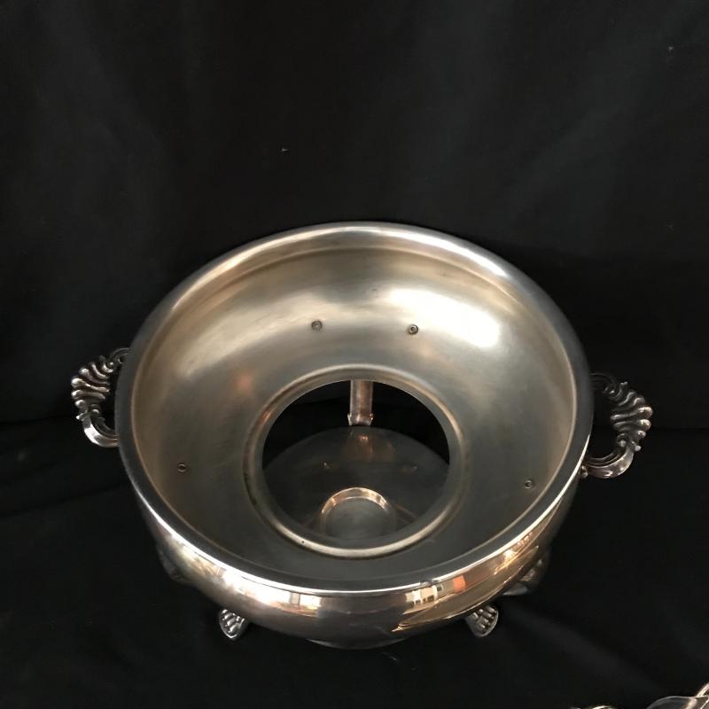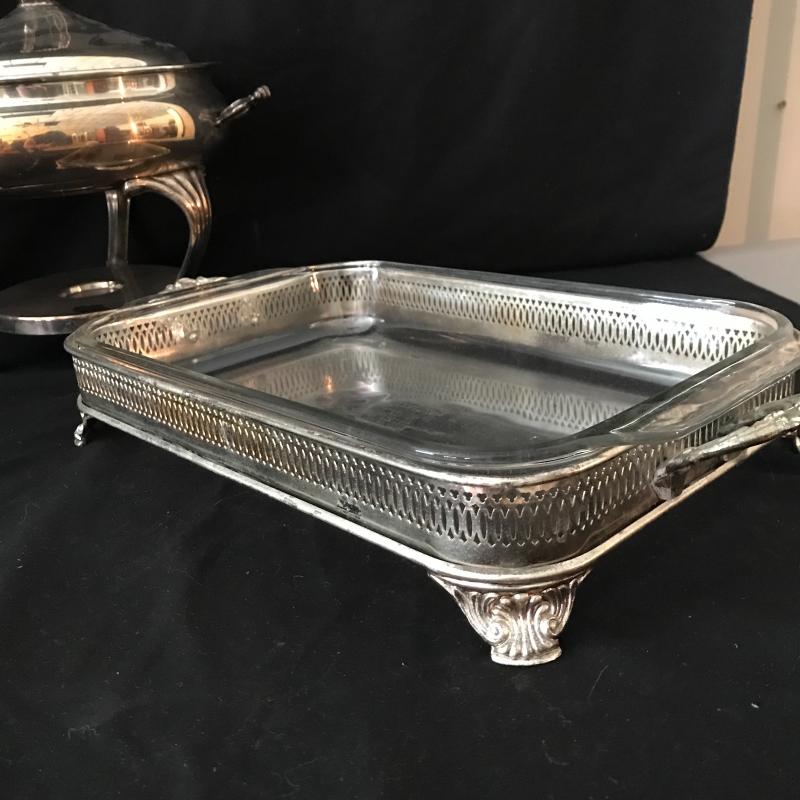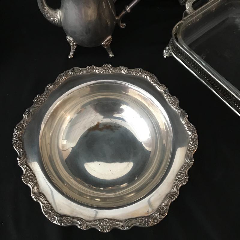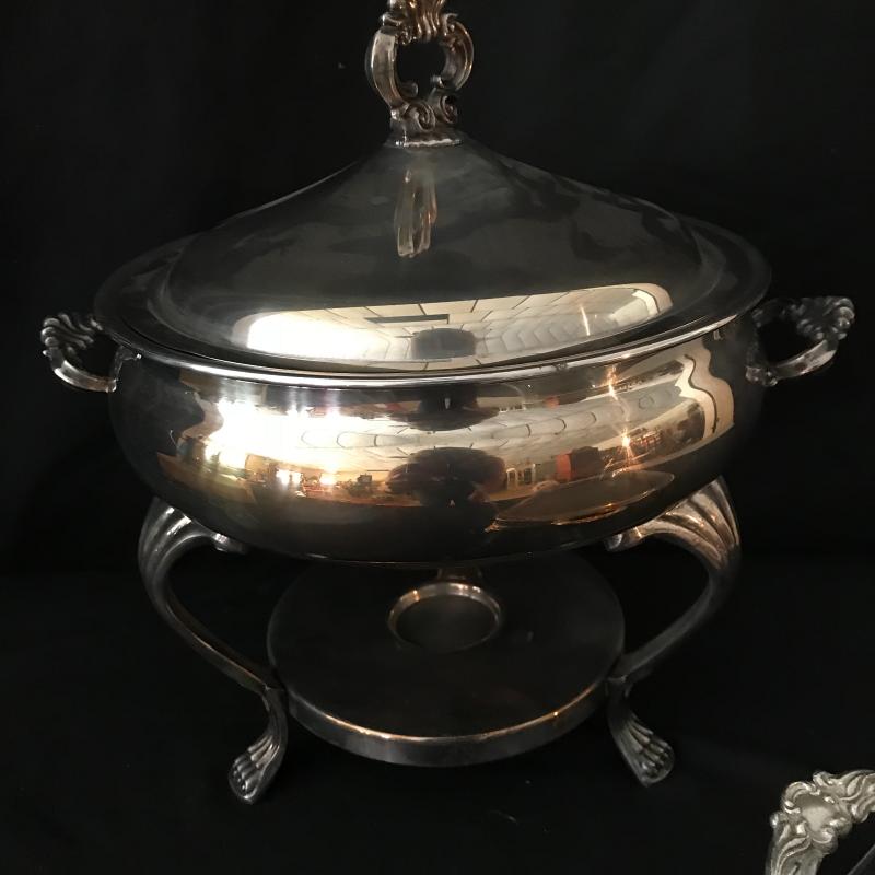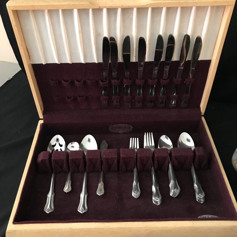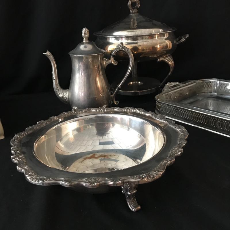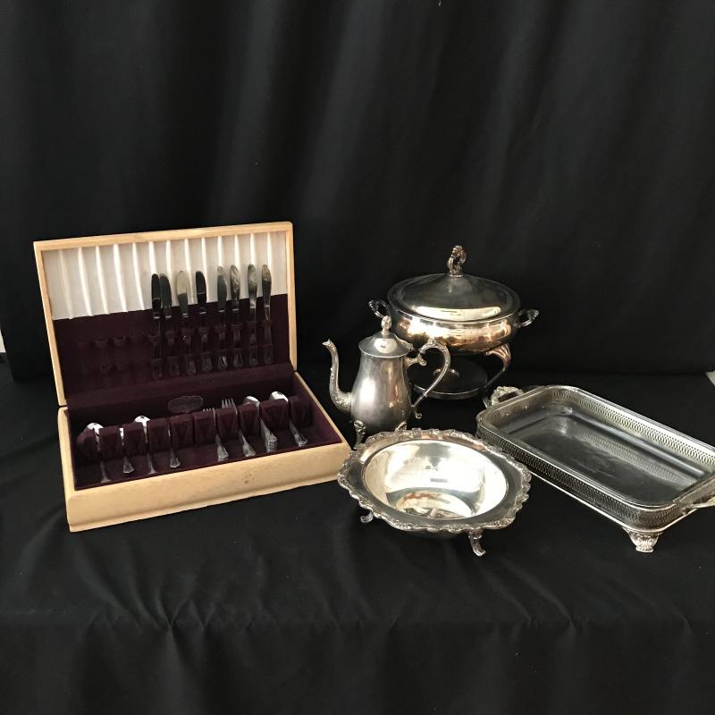 Lot includes flatware in box, 5-piece place settings for 8 and a few serving pieces: rectangle Pyrex pan with a silver plate stand, round chaffing piece (needs bowl), coffee pot, and footed rimmed bowl. Bowl measures 11.5” diameter. Lot is available for local pick up in Maggie. Alley, NC only.