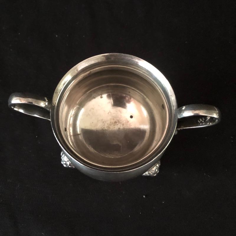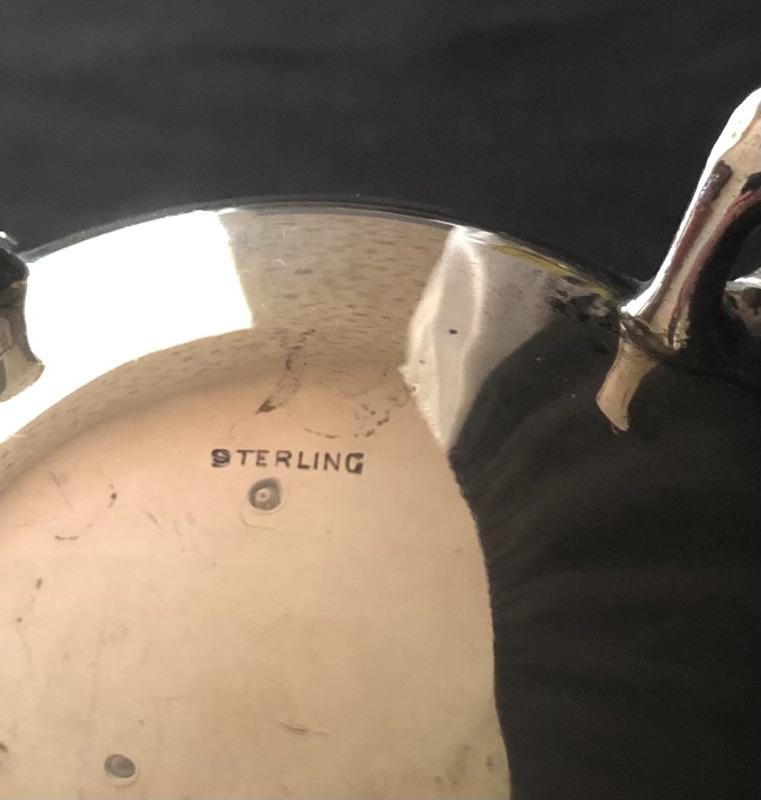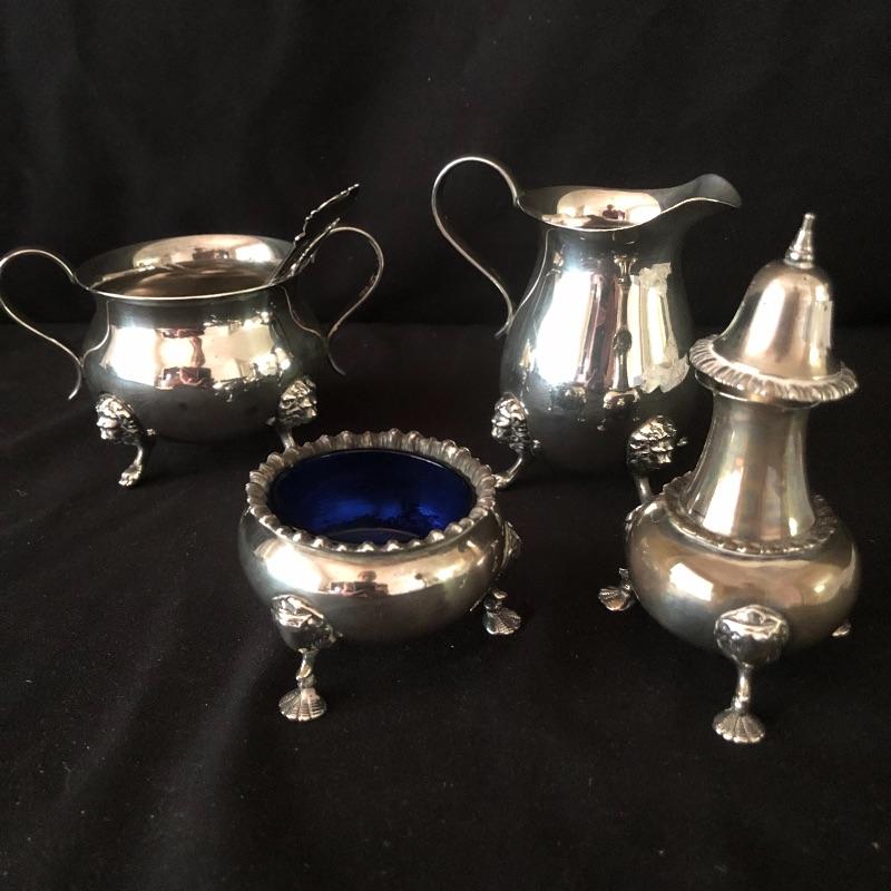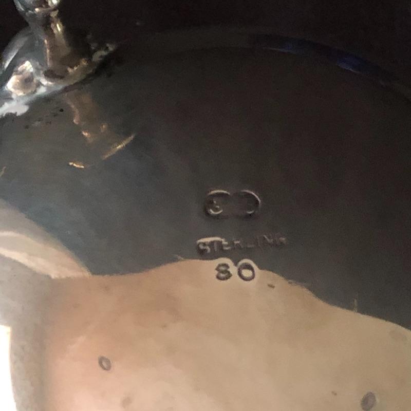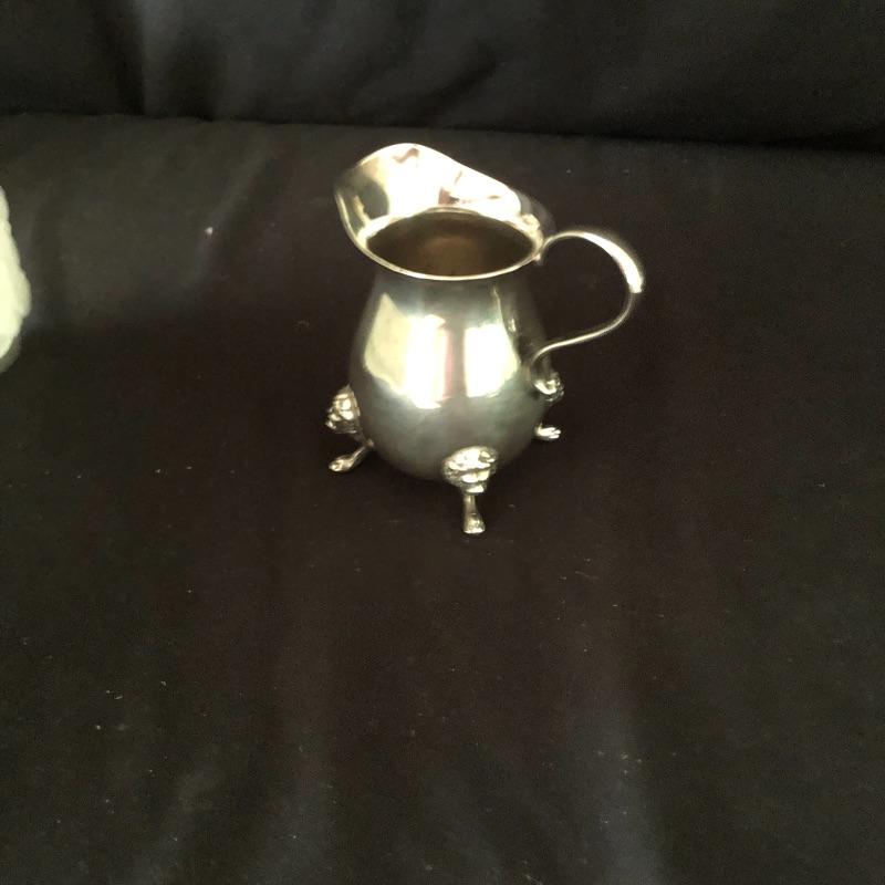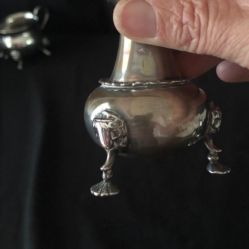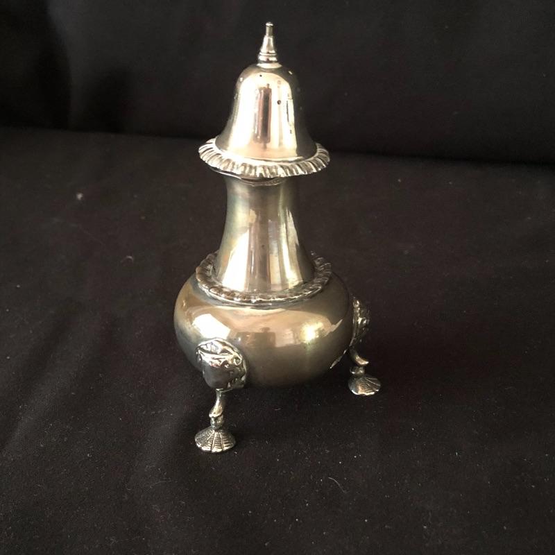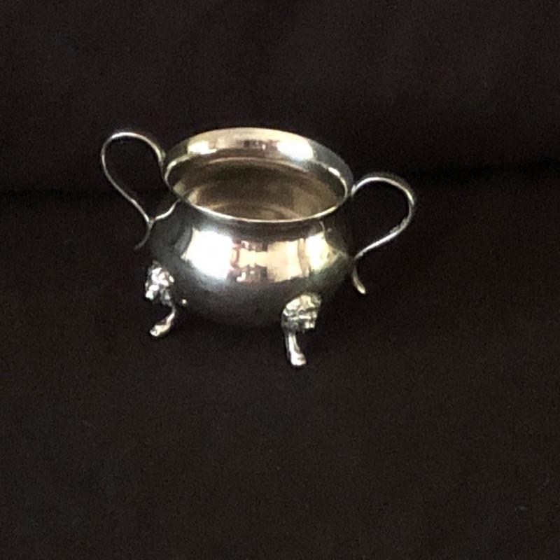Six pieces of sterling silver in this lot with a variety of Sterling markings. The smaller footed bowl has a removable cobalt blue glass insert. Also included is a larger sugar bowl, pepper shaker, small pitcher and two small spoons. Pieces are marked sterling and starting price is near melt value for the set.