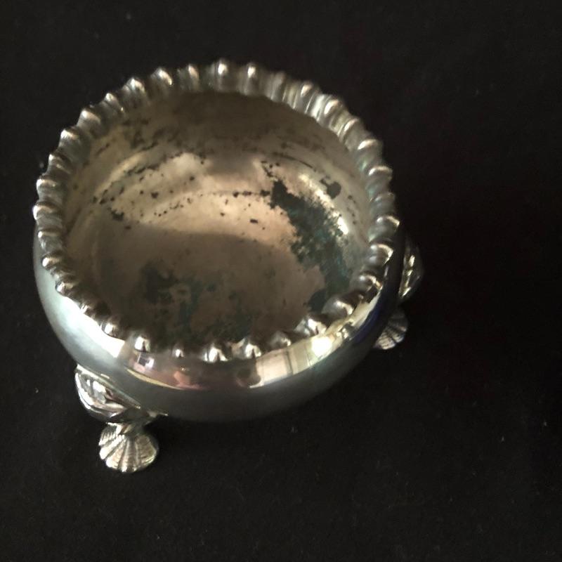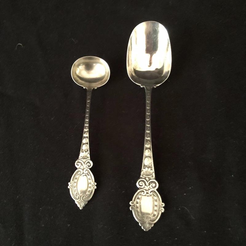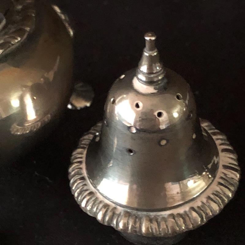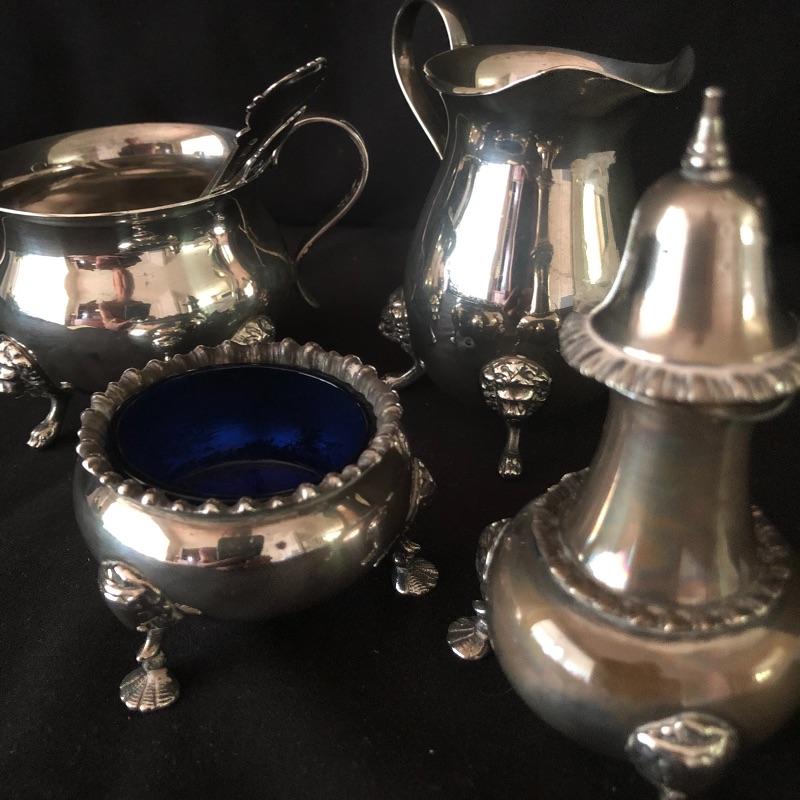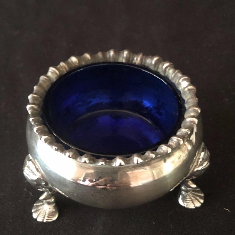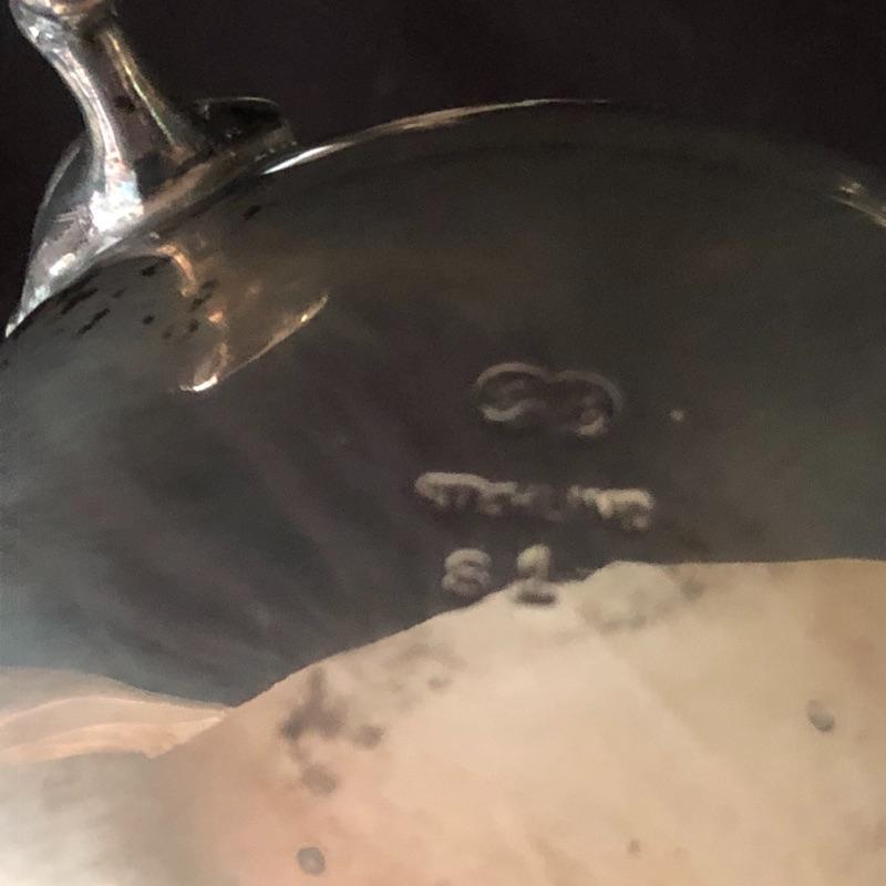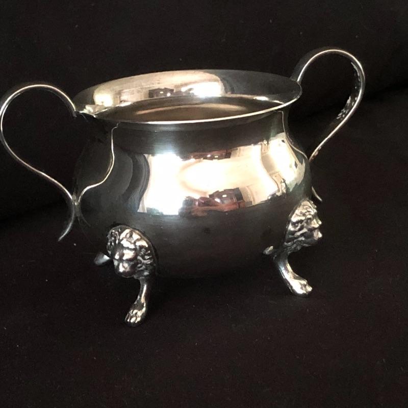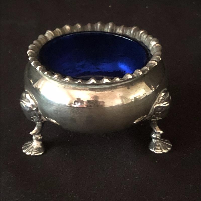 Six pieces of sterling silver in this lot with a variety of Sterling markings. The smaller footed bowl has a removable cobalt blue glass insert. Also included is a larger sugar bowl, pepper shaker, small pitcher and two small spoons. Pieces are marked sterling and starting price is near melt value for the set.