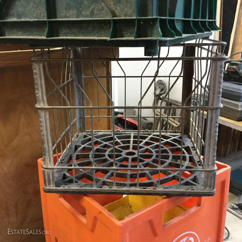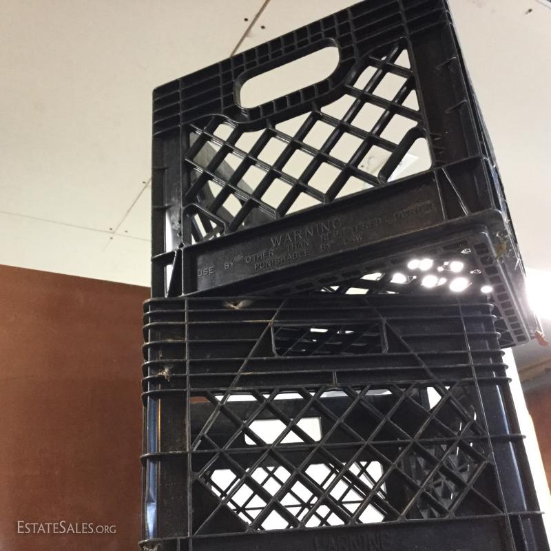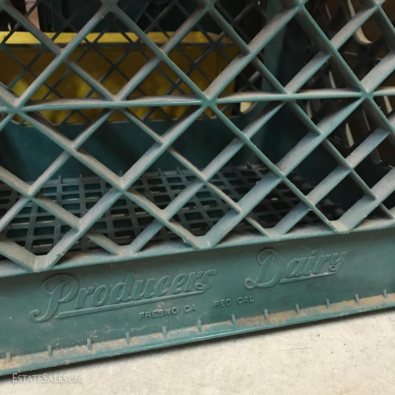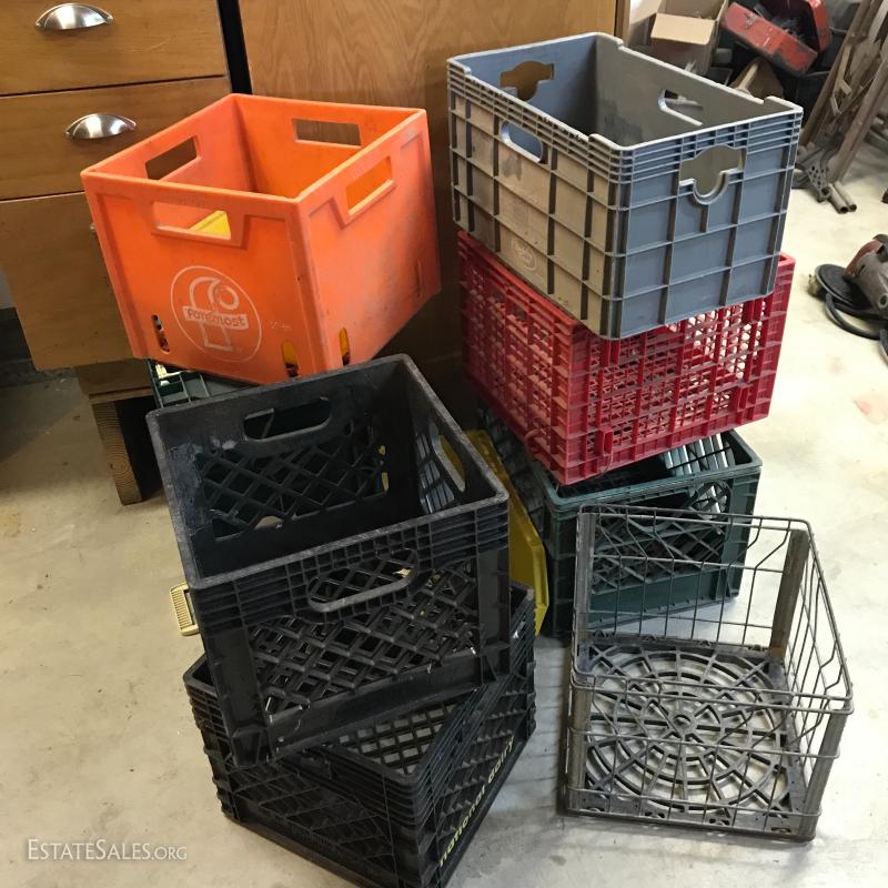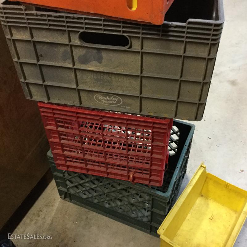 Eight square crates. One metal, others are plastic. Some have dairy farm name. Various sizes.