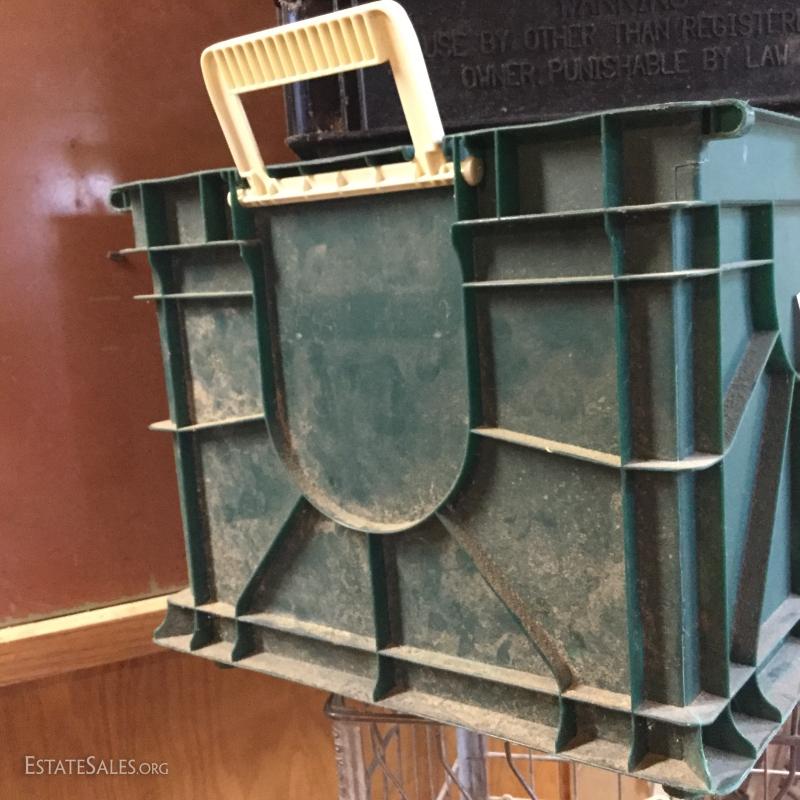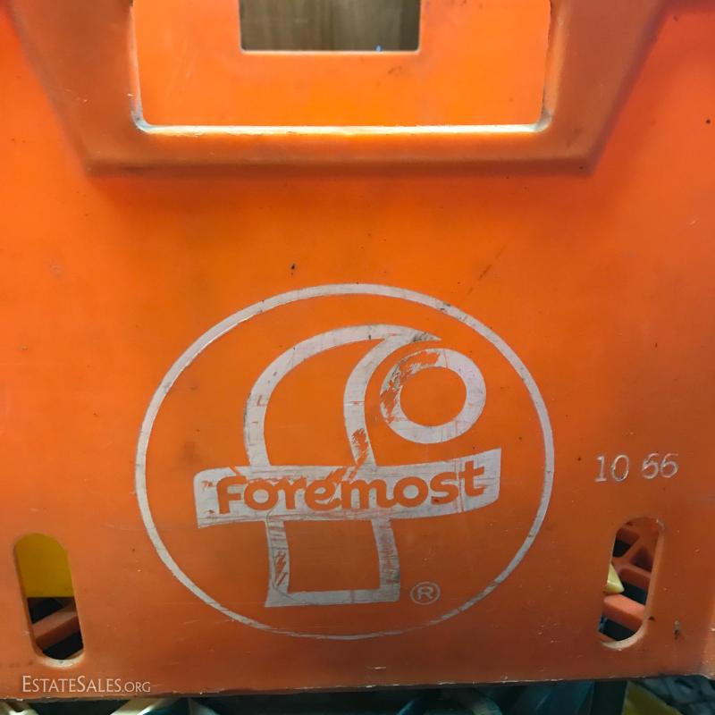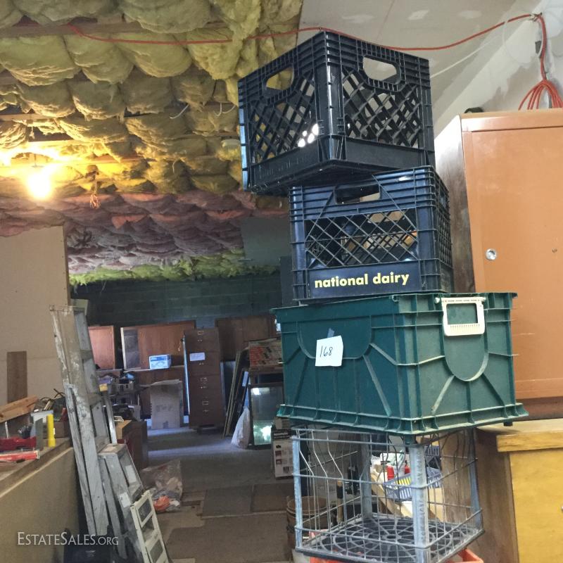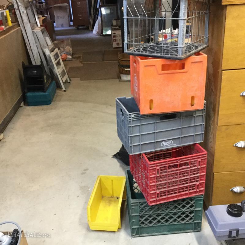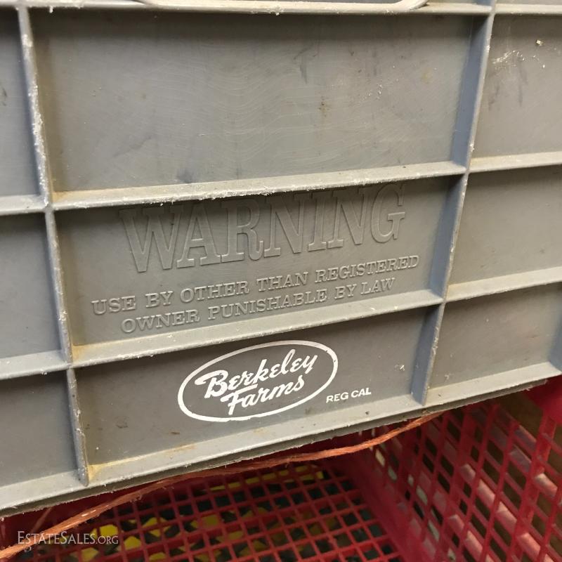 Eight square crates. One metal, others are plastic. Some have dairy farm name. Various sizes.