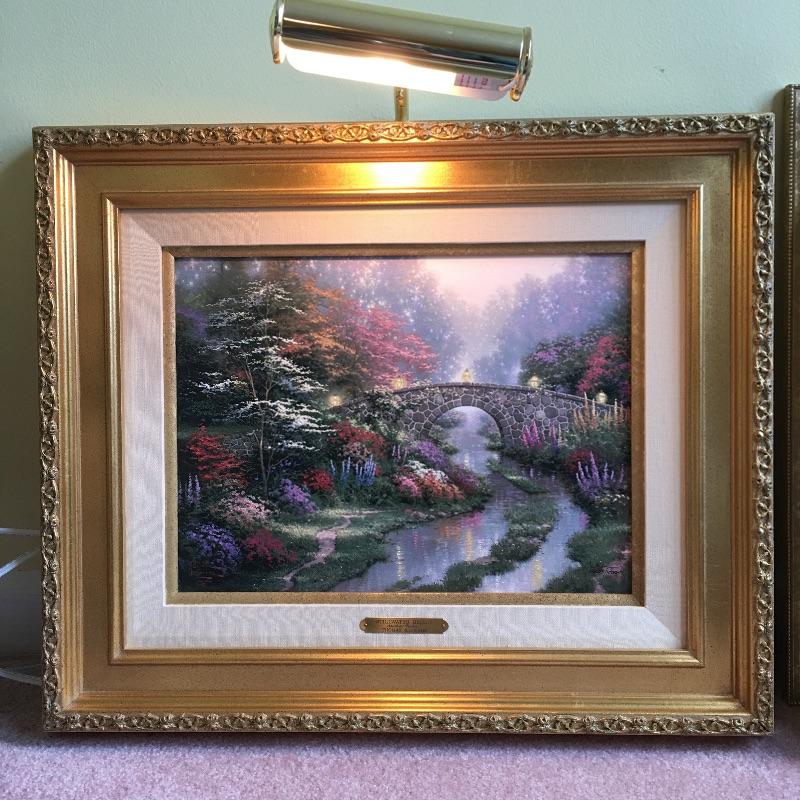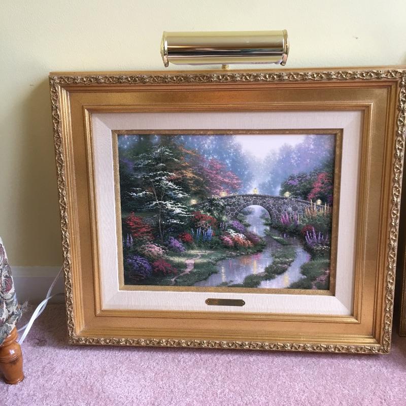Thomas Kinkade framed and matted artwork with light attached to frame. Piece is titled “Stillwater Bridge”. Frame measures 20.75” x 24.75”.