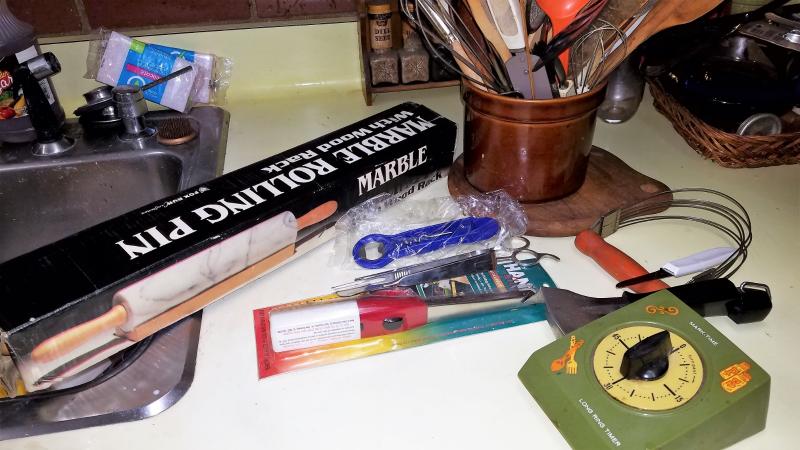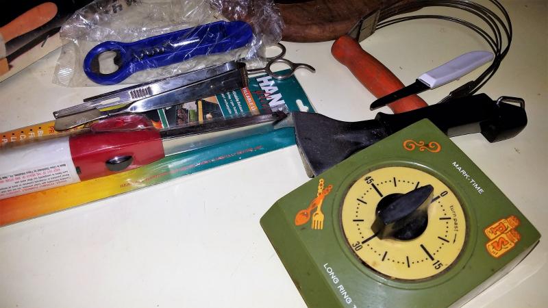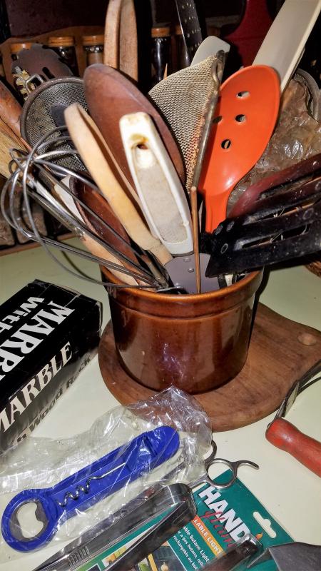 Wooden plastic stainless steel utensils with Egg Timer and other useful items