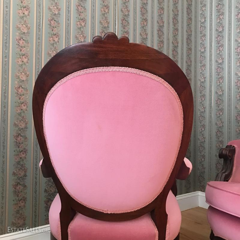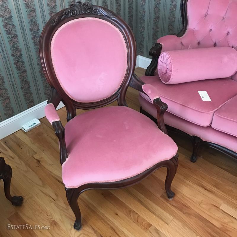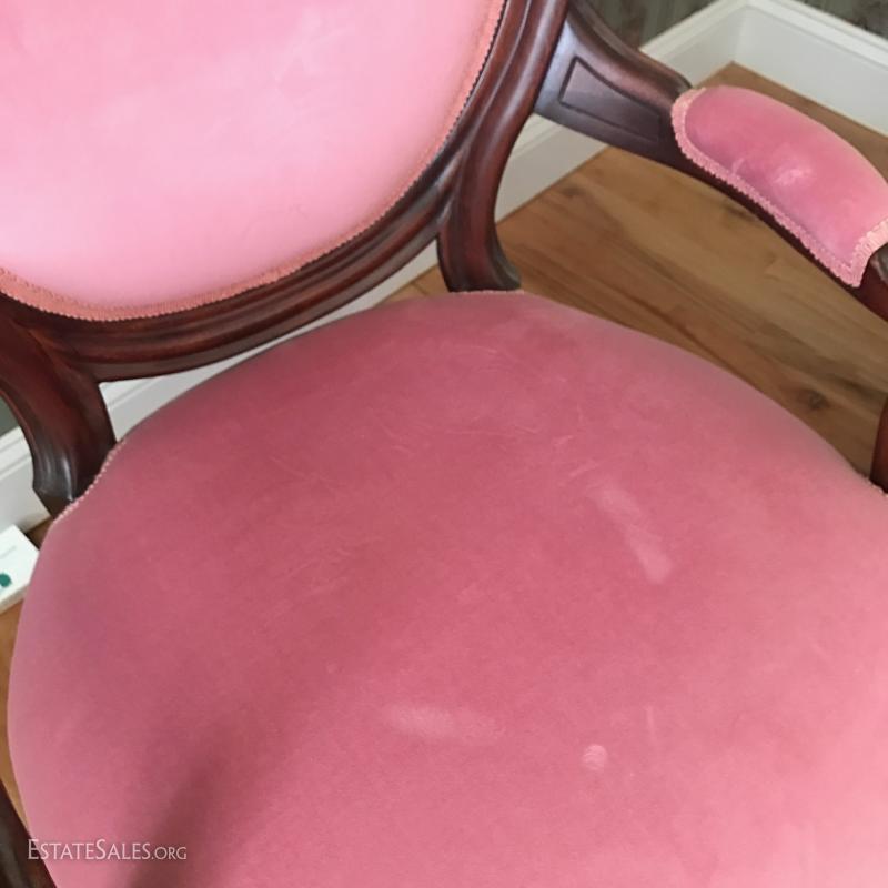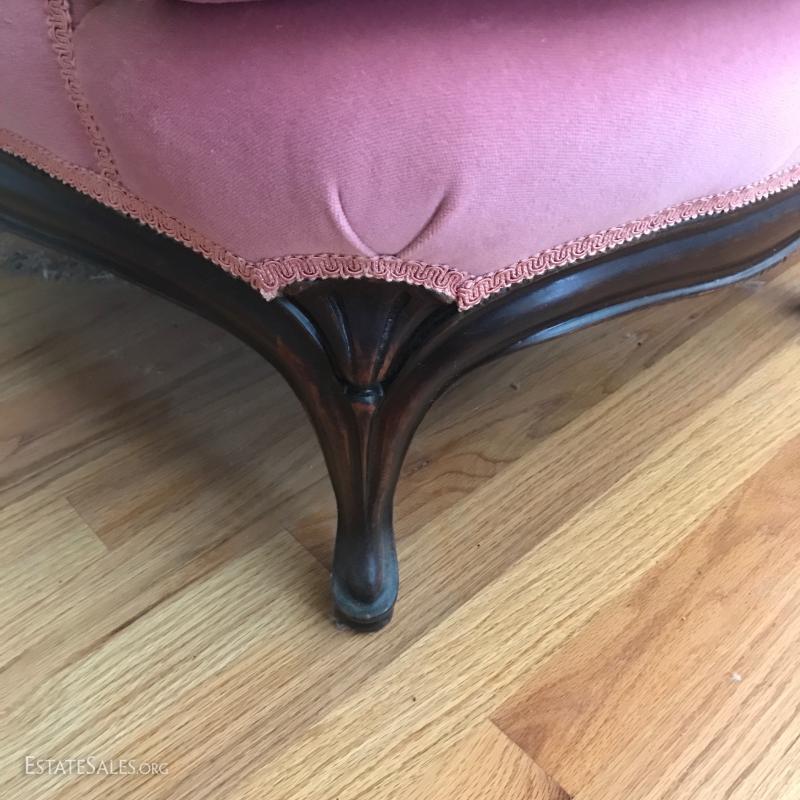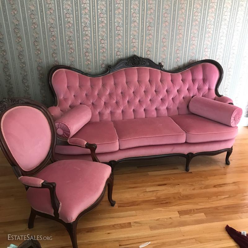 Pink Velvet Victorian style couch and matching chair. Includes two matching bolsters. Carved wood trim. Sturdy. Velvet has a few marks and could use a cleaning from dust. No shipping on this item. Local pick up only.