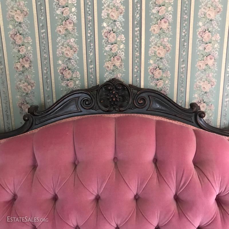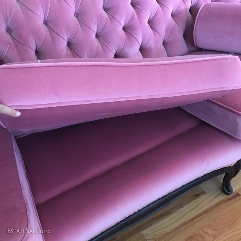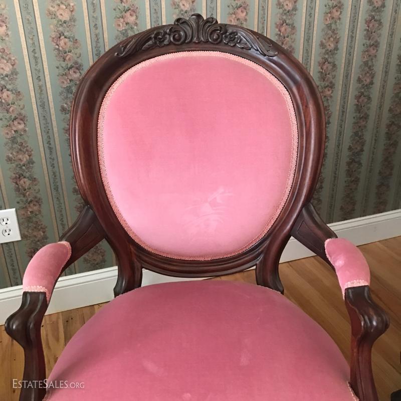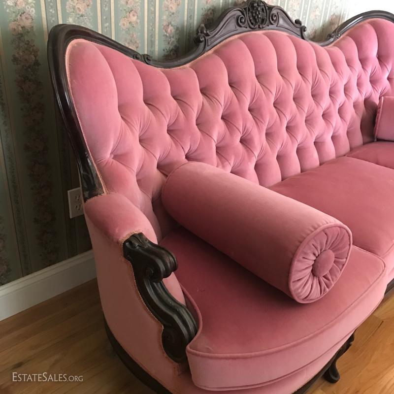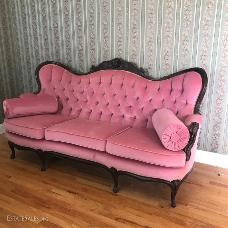 Pink Velvet Victorian style couch and matching chair. Includes two matching bolsters. Carved wood trim. Sturdy. Velvet has a few marks and could use a cleaning from dust. No shipping on this item. Local pick up only.