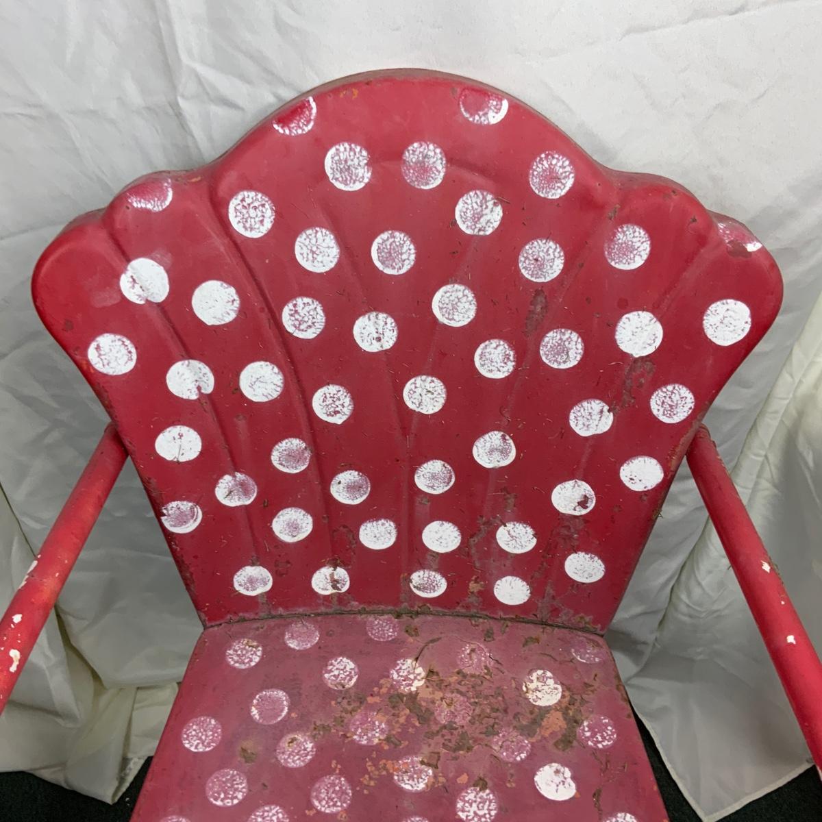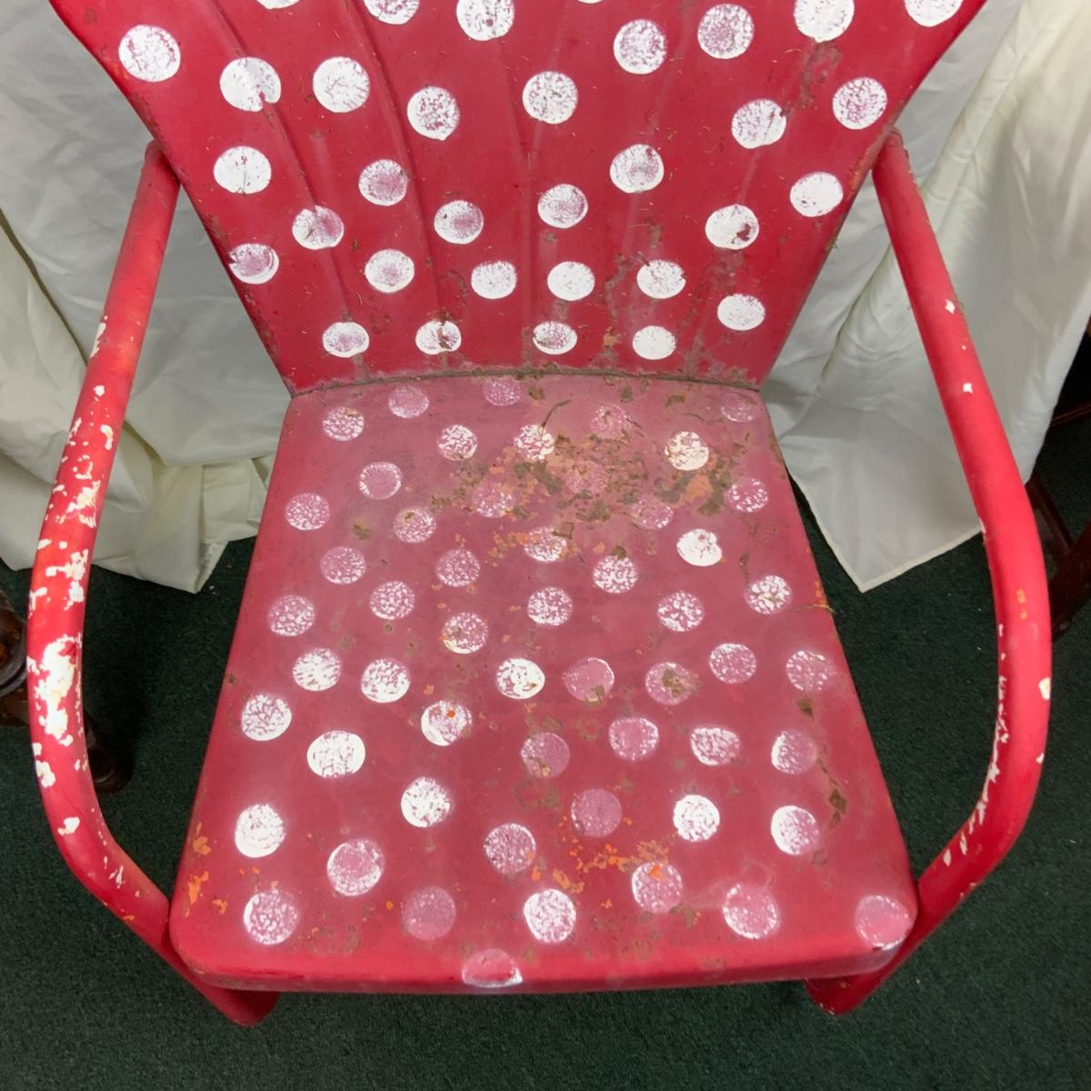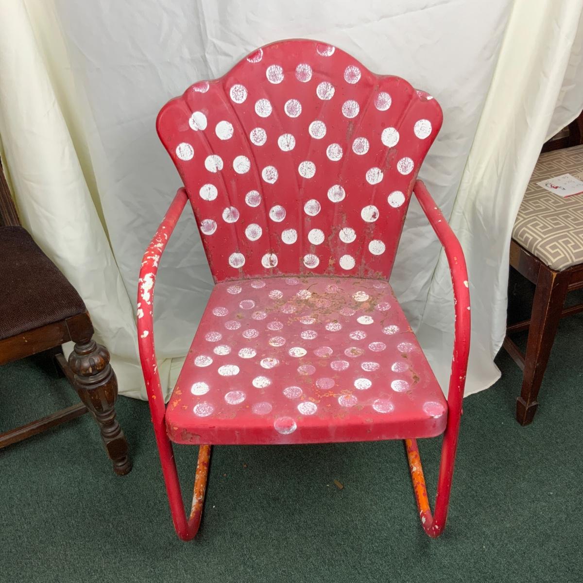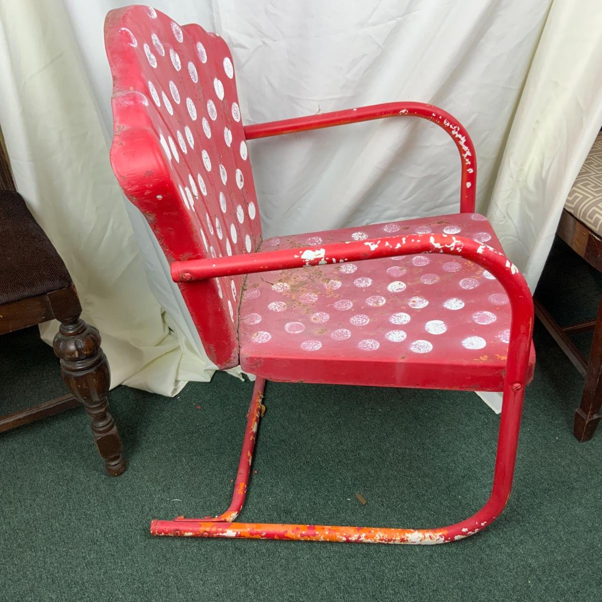 Vintage Red Patio Chair. Needs to be either sealed or repainted. //::\\ Please see photos for details and condition. No attempt has been made to hide any imperfections. All items listed in this auction are warehouse items, and need to be cleaned. A majority of the items need restoration as well. All items are sold AS IS and WITHOUT GUARANTEE. If you are uncertain about an item, DO NOT BID. Due to the nature of this online auction in-person inspection is HIGHLY recommended. All Sales are FINAL. Pick Up Times are FIRM. Please confirm with your own schedule that you can pick up in the scheduled times listed in the Terms and Conditions. Any questions please message the auctioneer. DO NOT Contact The Harp Gallery.