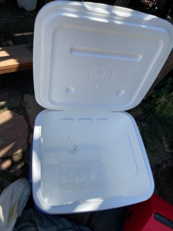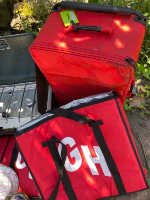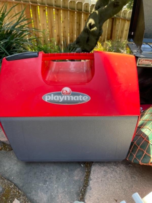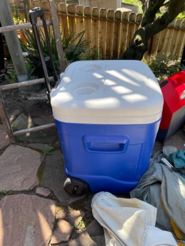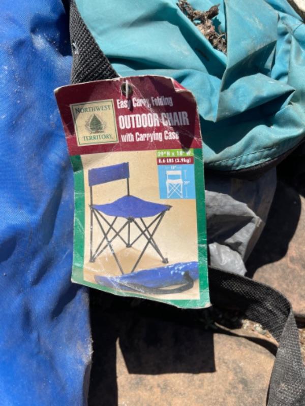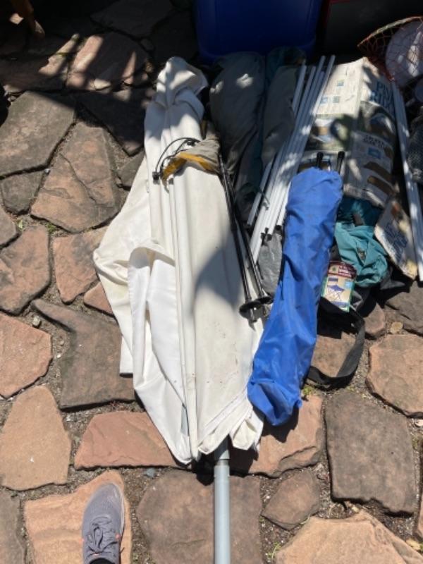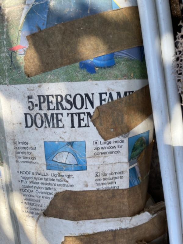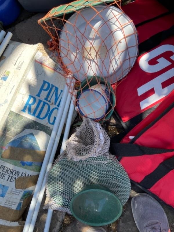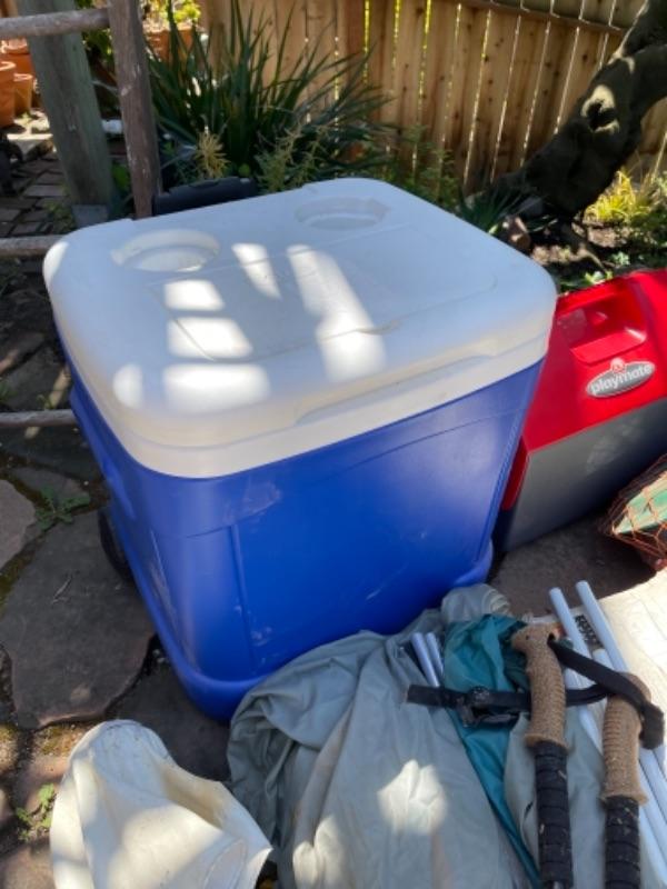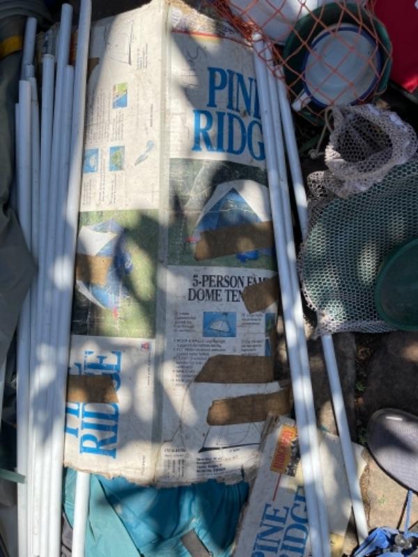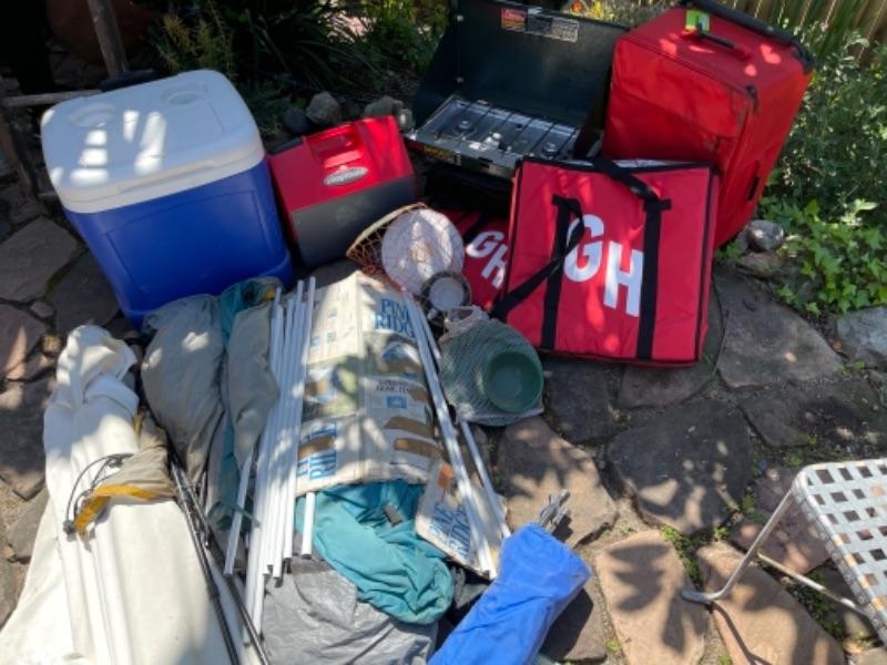 Lot 168G. Camping gear“”Coleman stove, two canteen sets, insulated bags, walking sticks, two 5-person domed tents, chairs--$65