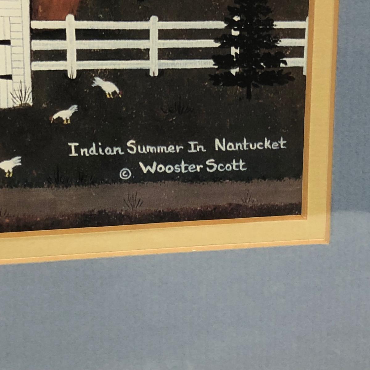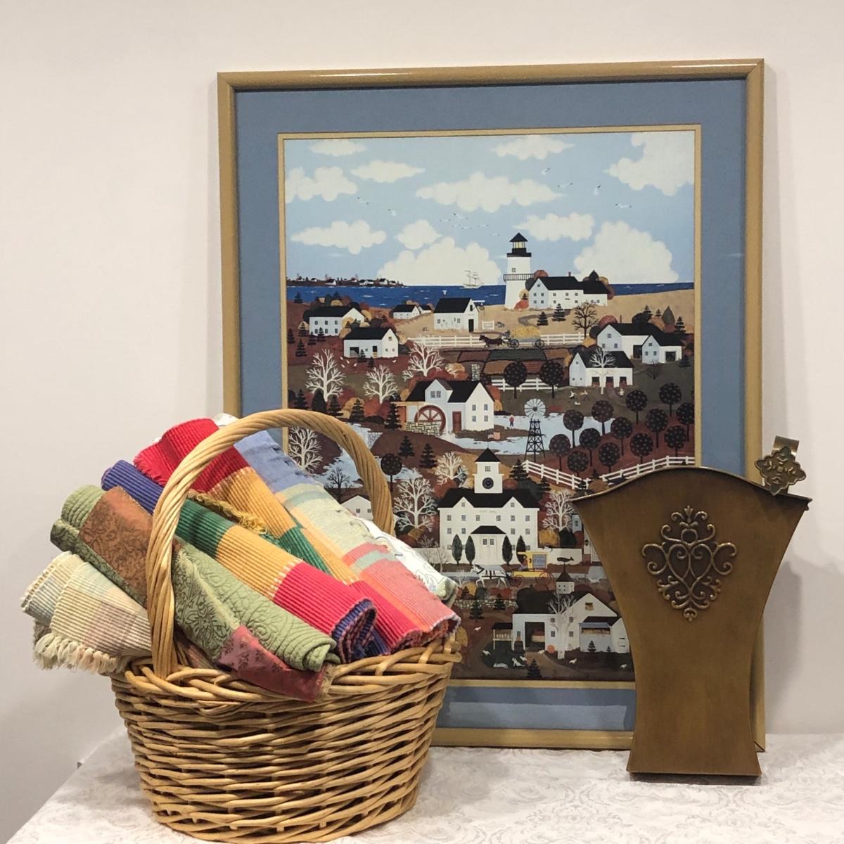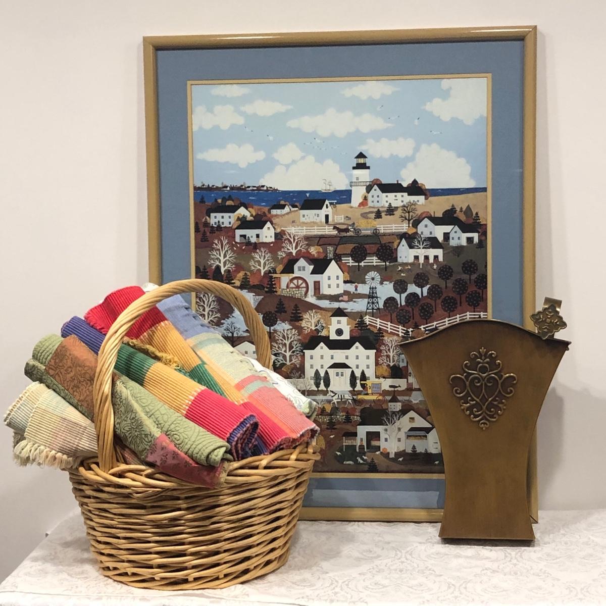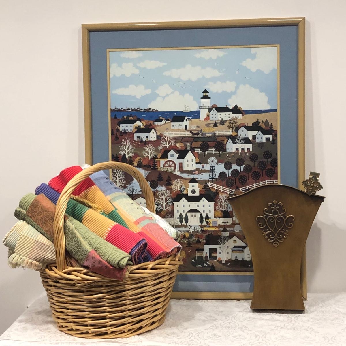 LOT 168M: Wooster Scott ""Indian Summer in Nantucket" Print, Flower Market Door Bucket, Placemats & Basket
