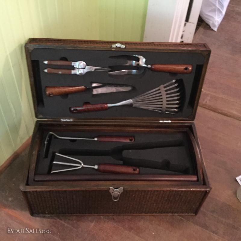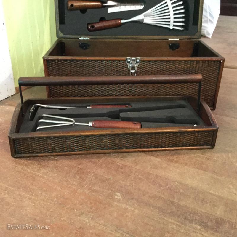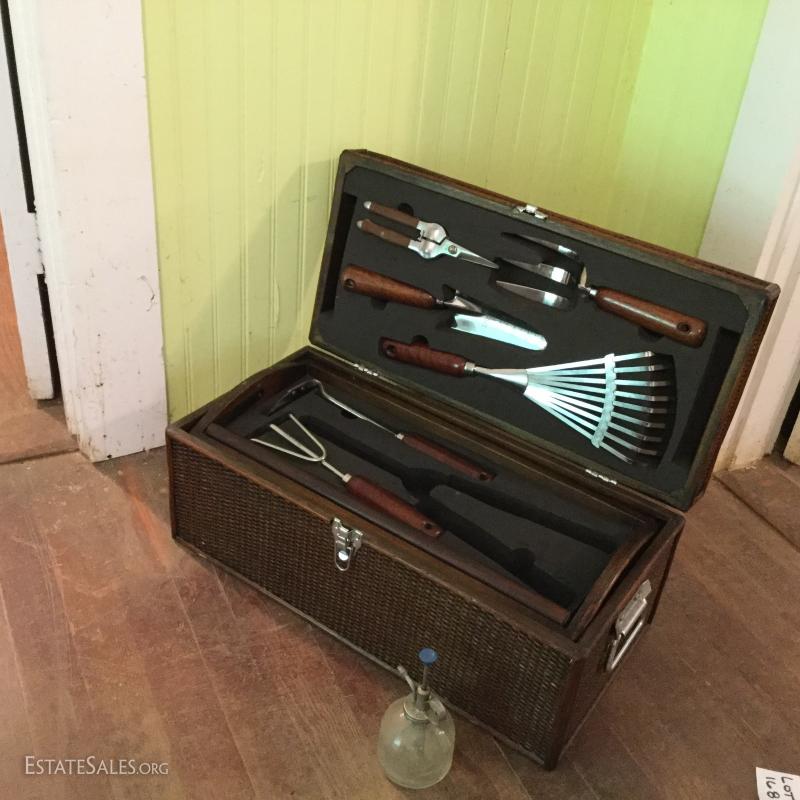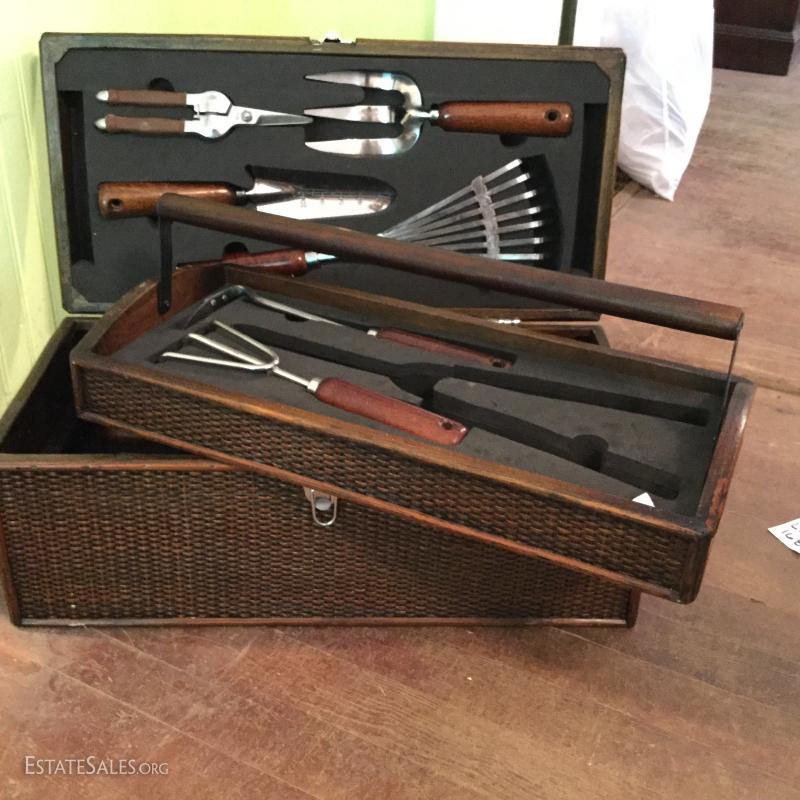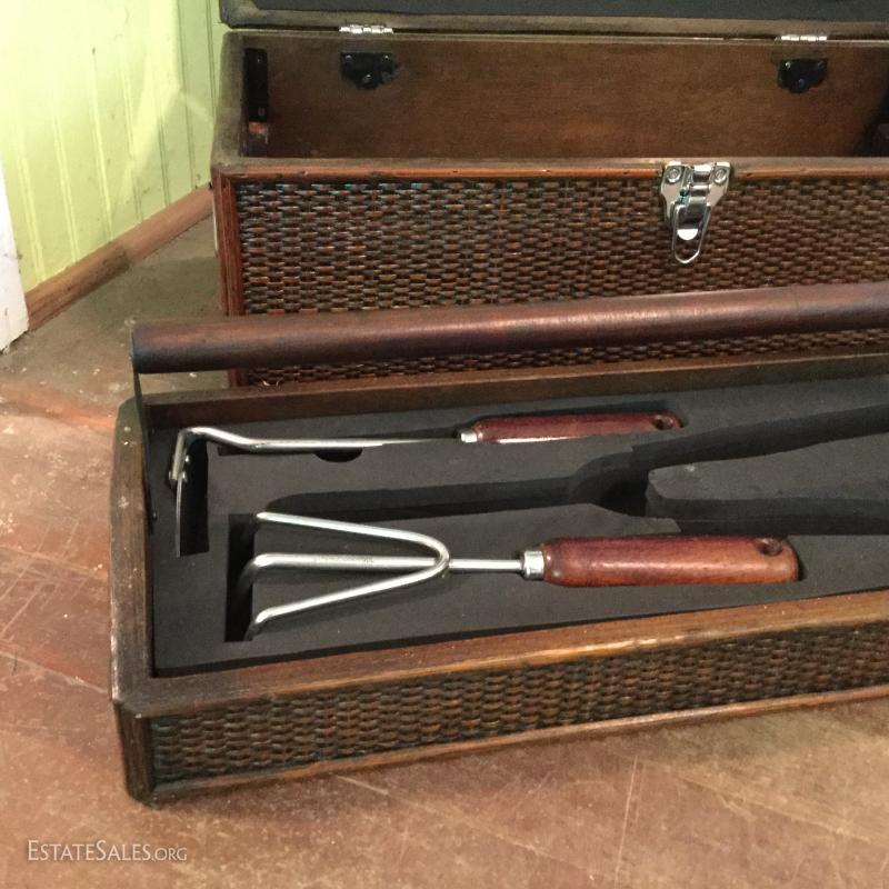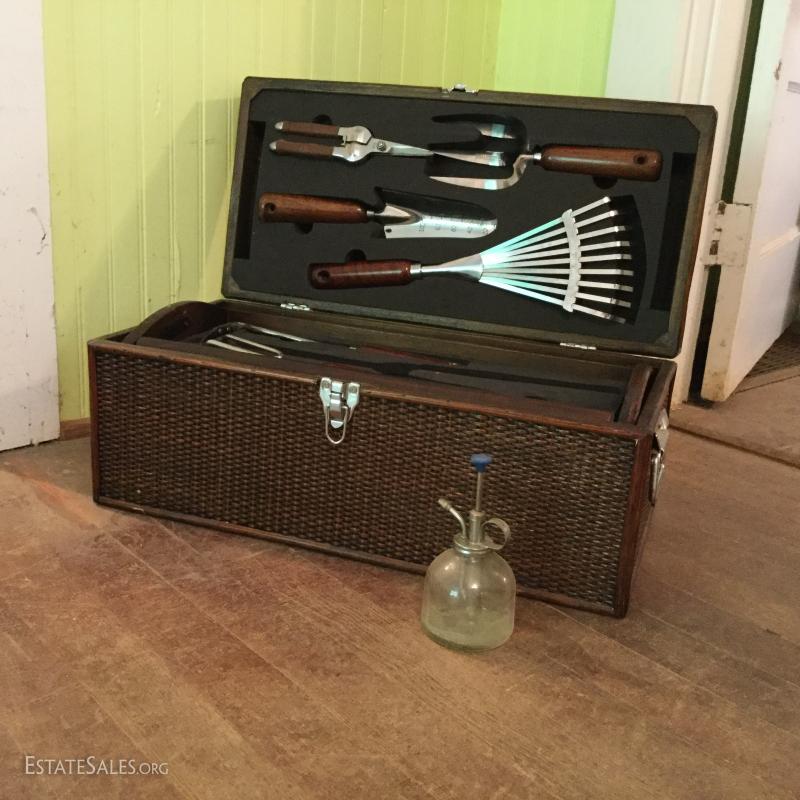 Large Vintage Wooden Trellis. Very sturdy. Also includes faux woven box with Stainless Steel gardening tools that appear to not be used but two are missing. Also a vintage mister. Trellis stands 84'H and 57.5'W. This lot is avaiable for local pick up in Saluda, NC.