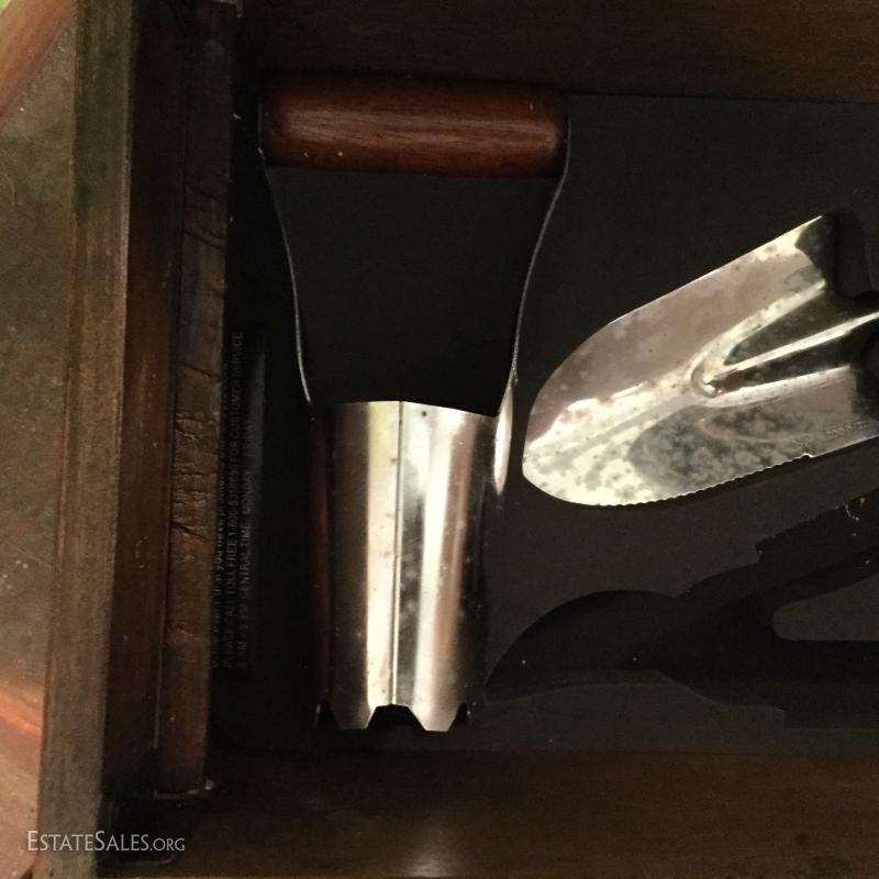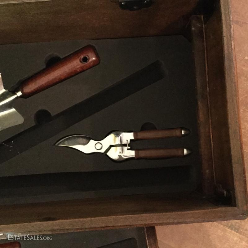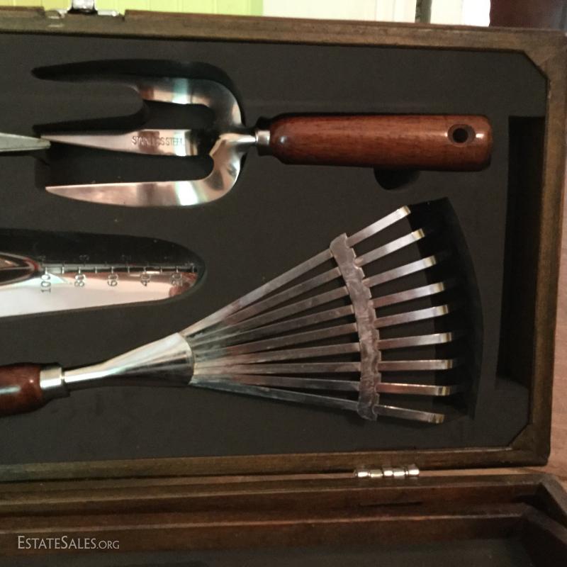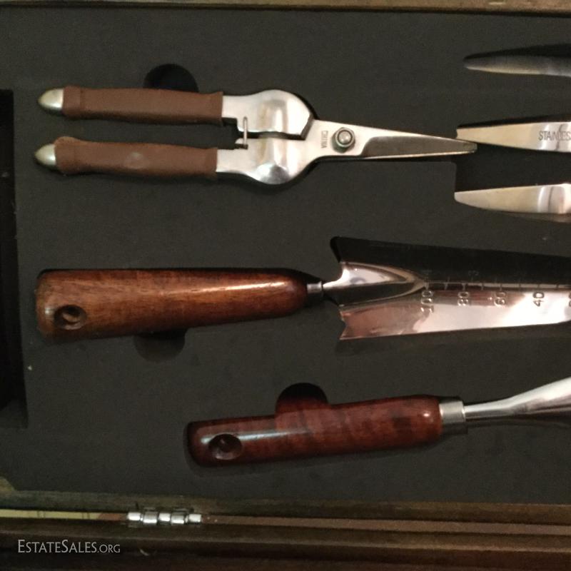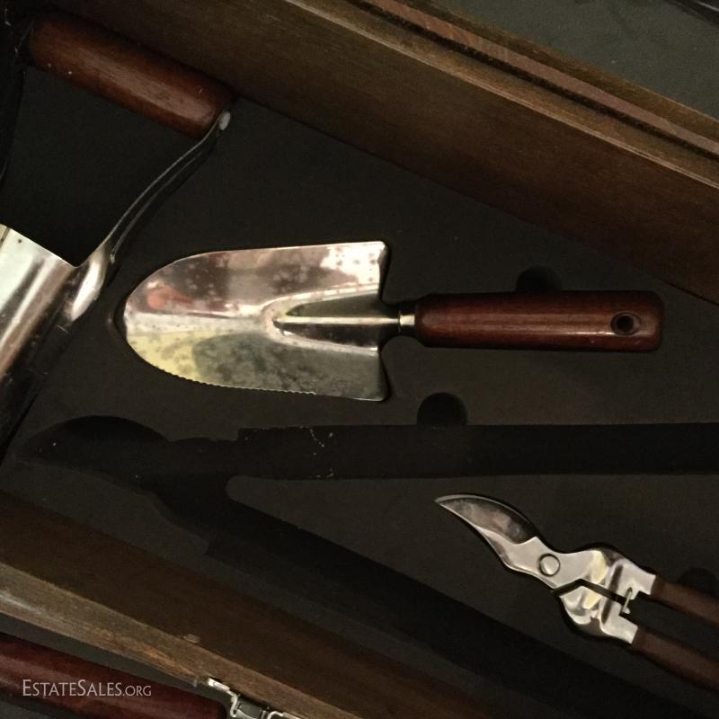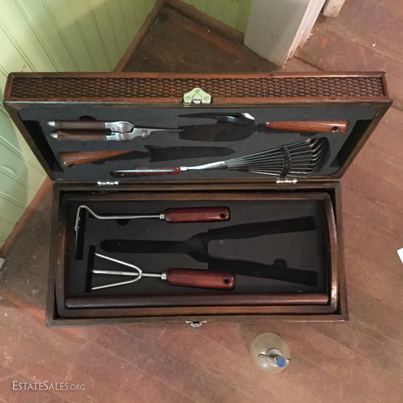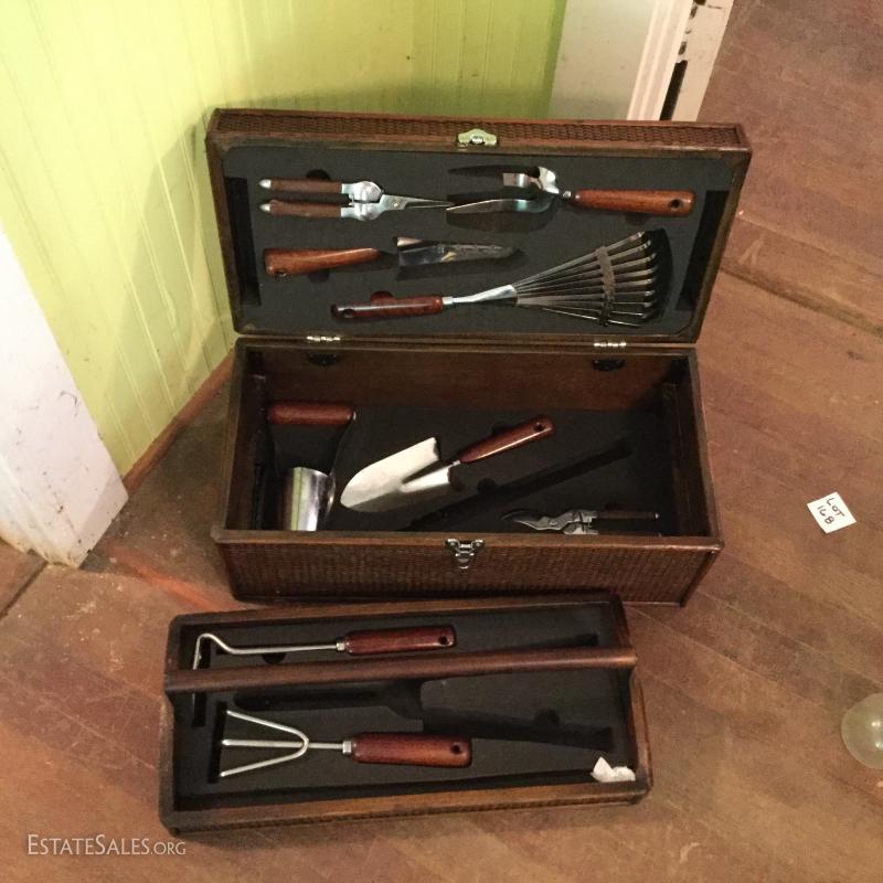Large Vintage Wooden Trellis. Very sturdy. Also includes faux woven box with Stainless Steel gardening tools that appear to not be used but two are missing. Also a vintage mister. Trellis stands 84'H and 57.5'W. This lot is avaiable for local pick up in Saluda, NC.