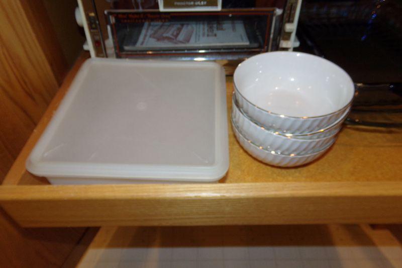 4 CEREAL BOWLS AND 1 TUPPERWARE