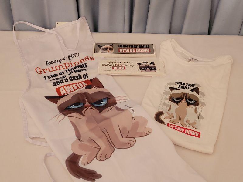 Lot 169: NEW Grumpy Cat Apron, Tshirt (L), and (2) Plaques
